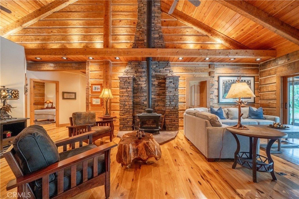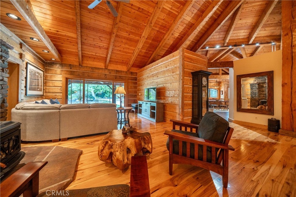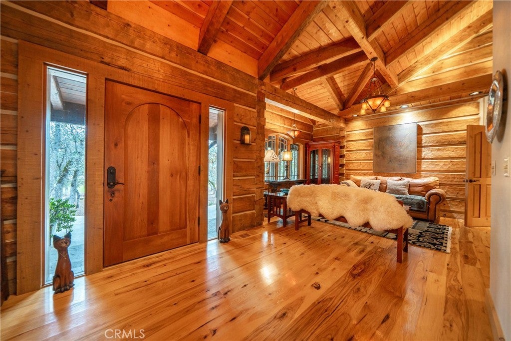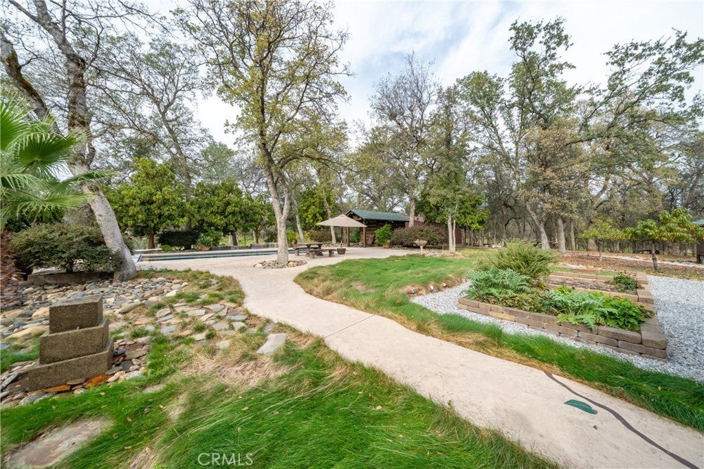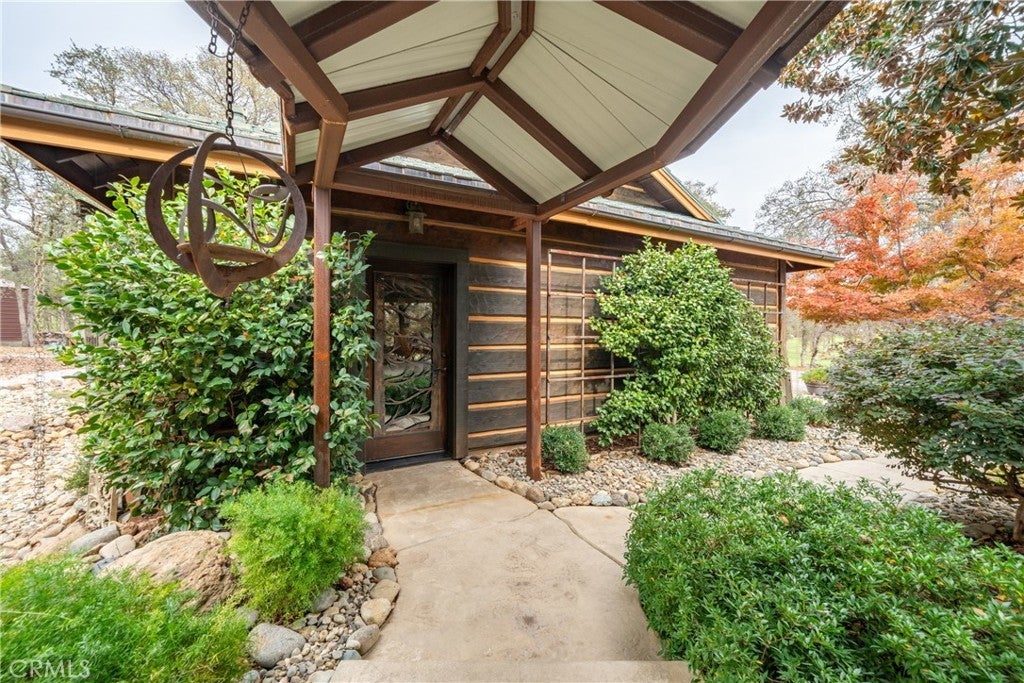 Incredible Custom Hand-Hewn Log Home on 5 Private Acres Prepare to be amazed by this one-of-a-kind, custom-built hand-hewn log home that perfectly blends rustic charm with modern elegance. *Scan the QR code (picture #2) to experience a 3D Virtual Tour!* Featuring 12-foot walls and soaring 25-foot ceilings, this architectural masterpiece offers a warm yet luxurious atmosphere throughout its nearly 3,500 sq. ft. of living space. Inside, you'll find hickory plank hardwood floors, granite countertops, and a commercial-grade chef's kitchen equipped with premium appliances. The stone hearth wood-burning fireplace creates a stunning focal point in the great room, while arched windows fill the home with natural light and showcase views of the surrounding landscape. With 4 spacious bedrooms—each featuring at least one wall of exposed logs—and 3.5 beautifully appointed bathrooms, this home offers both character and comfort. Step outside to enjoy the full wraparound covered porch, perfect for relaxing or entertaining. The in-ground gunite pool, garden boxes, and built-in fire pit make outdoor living exceptional. A poured concrete driveway and sidewalks are finished with natural, wavy edges and etched twig-and-leaf details for a custom artisan touch. Additional highlights include a Metal Class A fire-rated roof, detached 4-car garage, detached metal shop, and walking paths throughout the property. Every inch of this home reflects craftsmanship, creativity, and care. This absolute stunner and truly one of a kind was featured in Log Home Design magazine and found a spot in Redding, California's AAUW prestigious annual home tour.