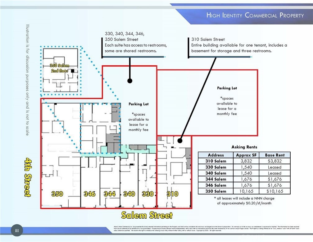 Come and see this downtown Office Commercial property with a lot of flexibility. There are multiple suites in the building at 350 Salem Street that are available for lease either separately or as one large space which includes a large breakroom, many offices and meeting spaces and several restrooms. Suite 330 and 340 total approximately 3,000; Suite 344 is approximately 1,676 sf; Suite 346 is approximately 1,676 sf; and the largest Suite 350 is approximately 10,165 sf and includes an upstairs space. All suites can be leased together totaling approximately 15,590 sf. The visibility at the corner of Salem and 4th Street is excellent with signage opportunities for each suite. There is a lot of flexibility here for varying uses. Even better ... this downtown property has an adjacent lot on-site where spaces are available for lease!