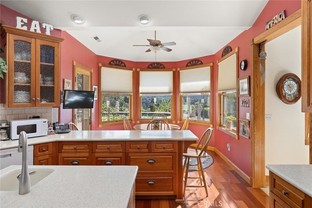 Breakfast Bar, Ceiling Fan(s), Separate/Formal Dining Room, High Ceilings, Recessed Lighting, Solid Surface Counters