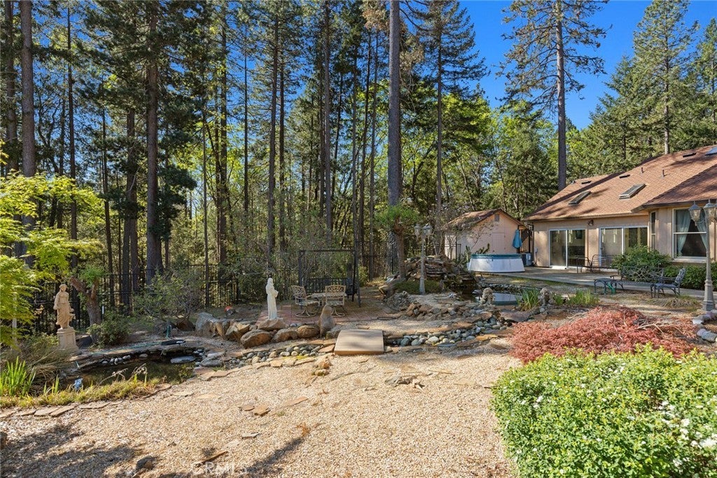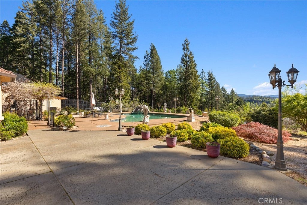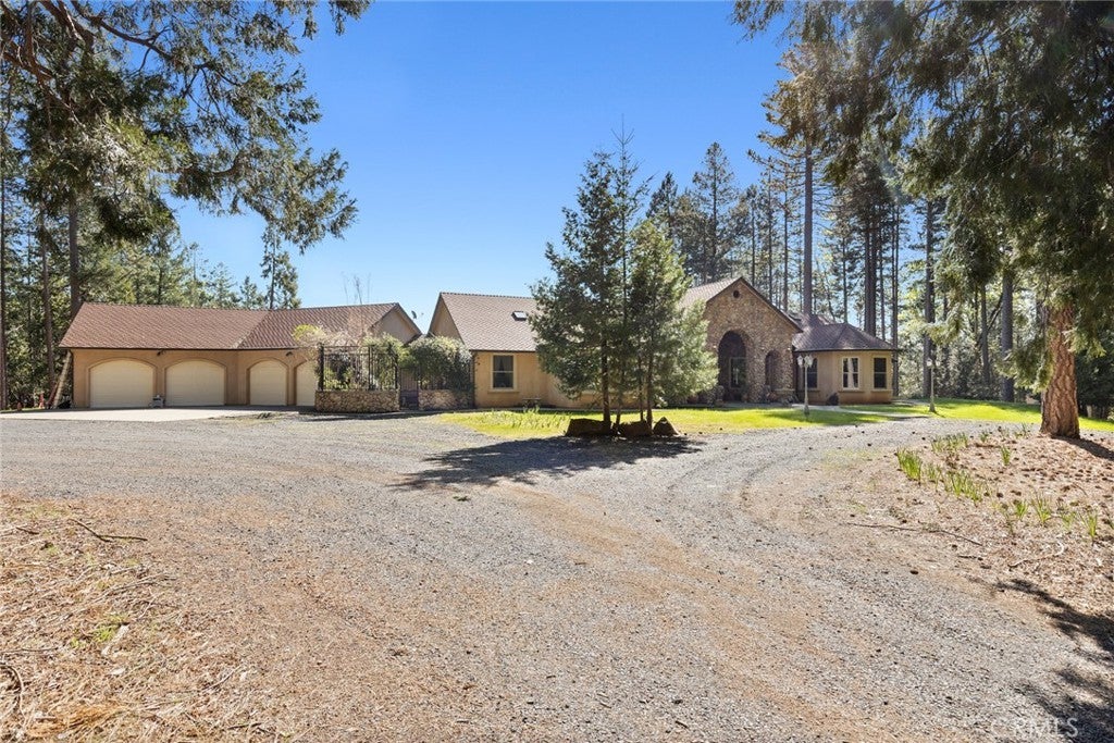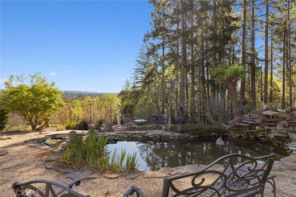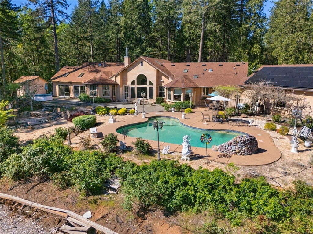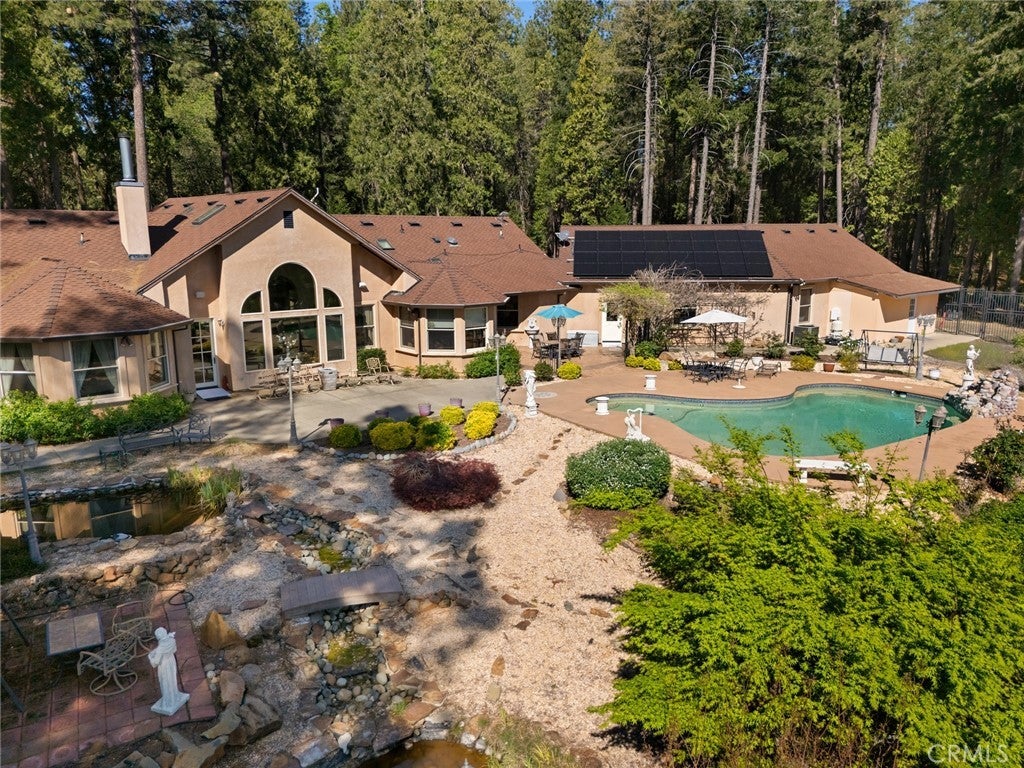 Nestled among the towering pines of Forest Ranch, this extraordinary estate showcases breathtaking views and an unmatched sense of serenity. Set on 23 private acres, the property boasts a sparkling in-ground pool, owned solar, & an expansive four-car garage—just the beginning of what this remarkable retreat offers. Step inside to soaring 23-foot cathedral ceilings & an abundance of windows that perfectly frame the picturesque surroundings. The great room is both inviting and impressive, featuring skylights, a stunning stone fireplace, & ample space for entertaining or cozy evenings at home. Just off the main living area, a versatile den offers endless possibilities—whether a home office, game room, or additional lounge space. Elevate your culinary experience in the thoughtfully designed gourmet kitchen, complete with Brazilian cherry hardwood floors, Corian countertops, cherry wood cabinetry, white tile backsplash, a gas range, a center island with a vegetable sink, & an expansive walk-in pantry with shelving and freezer space. The sunlit breakfast nook provides the perfect setting to enjoy your morning coffee while taking in the tranquil views. The luxurious primary suite is a private sanctuary designed for comfort & relaxation, featuring elegant tile flooring, custom oak built-ins, & a spa-inspired en suite bath with dual vanities, a soaking tub, walk-in shower, spacious closet, linen storage, grooming area, & bidet-equipped toilet. What truly sets this home apart is the indoor endless pool for year-round swimming and fitness. Additional highlights include three guest bedrooms, ceiling fans throughout, recessed lighting, dual HVAC systems, & an indoor laundry room with oak cabinetry and a utility sink. Outdoors, enjoy a beautifully designed in-ground pool, expansive patio, fully fenced backyard, hot tub, firewood storage building, & two serene koi ponds with a cascading waterfall. Fruit trees dot the landscape, and with 23 acres, there is endless opportunity to expand and make it your own. The property is accessed via a gated entrance shared with neighboring homes, adding privacy and security. Offering a rare blend of comfort and beauty, this exceptional property is truly one you don’t want to miss.