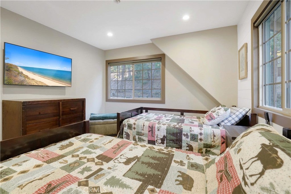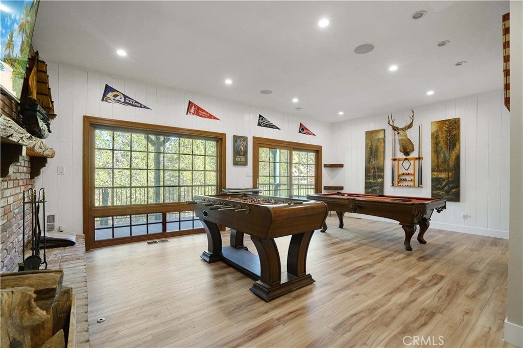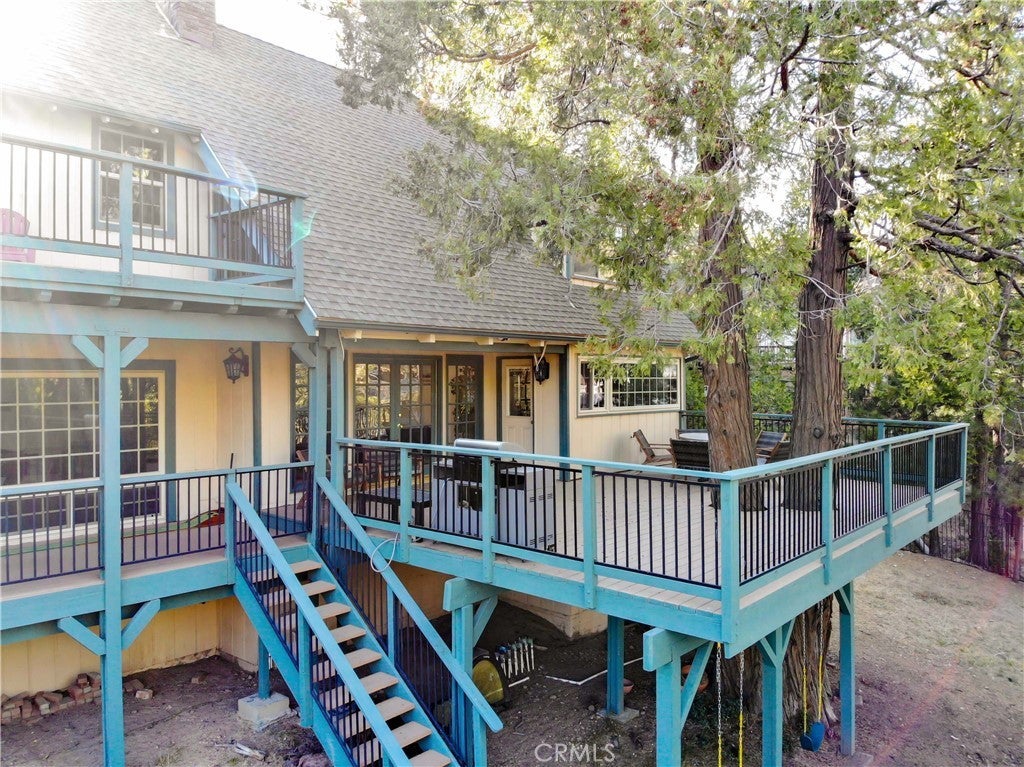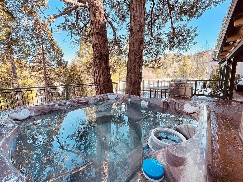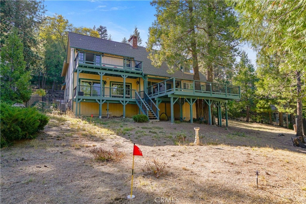 Stunning 5-Bedroom, 3-Bathroom Remodeled Home Key Features: Kitchen: Granite countertops, tile backsplash, stainless steel appliances, built-in ceiling speakers, peninsula, and island with phone pop charger. Living Room: Built-in wall speakers, wood/gas fireplace with LED lights, recessed lighting throughout, vaulted ceilings. Dining: Formal dining area with updated dual-pane windows. Climate Control: Two A/C units for upstairs and downstairs. Bedrooms: Luxury vinyl flooring. Bathrooms: All remodeled with glass enclosures, master bath with above-ground tub. Additional Rooms: Game/family room, washer and dryer room with storage. Garage: Oversized 2-car garage with Tesla charger. Outdoor: Three wood decks, BBQ area and back deck perfect for entertaining and enjoying the landscape, jacuzzi, steps leading to private Lake Arrowhead Country Club, long driveway, usable flat backyard. Extra: Two fireplaces, backup generator hook-ups, surveillance cameras. Investment Opportunity: Airbnb Info: House rents for approximately $100K gross each year. Perfect for luxury living and entertaining!