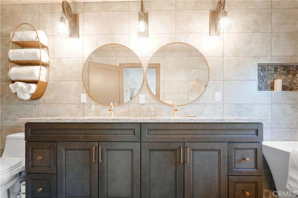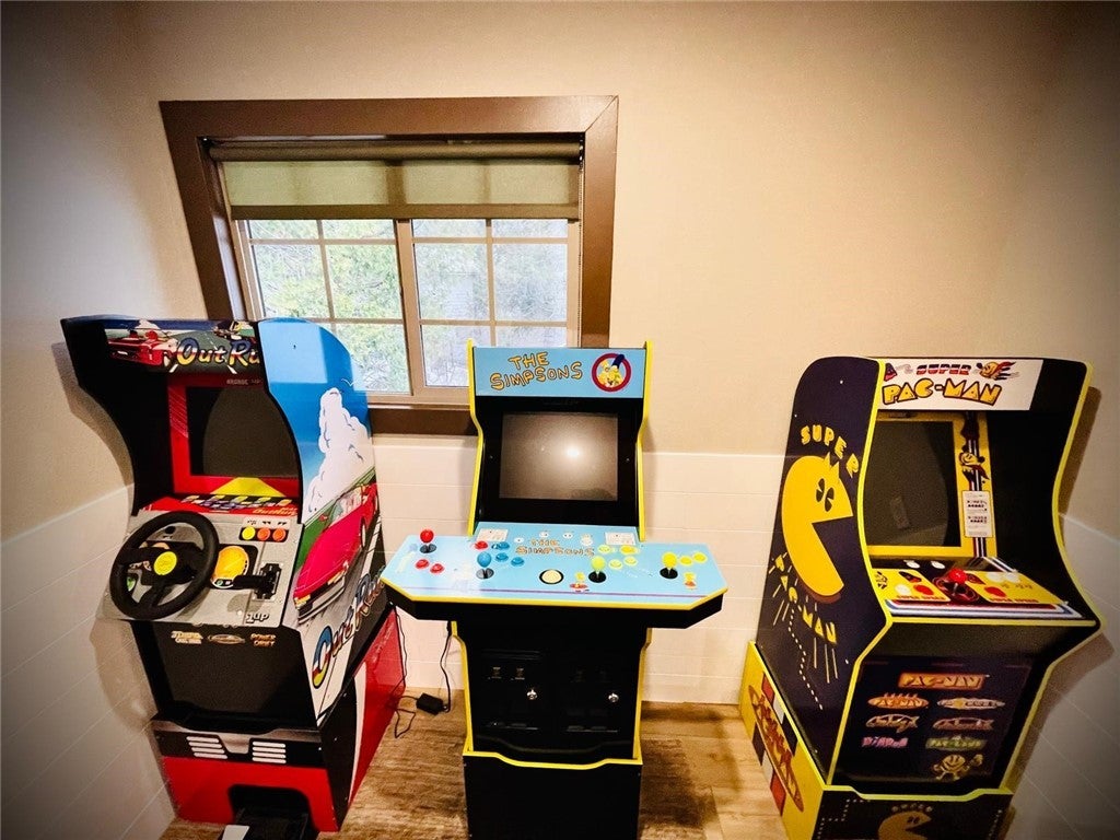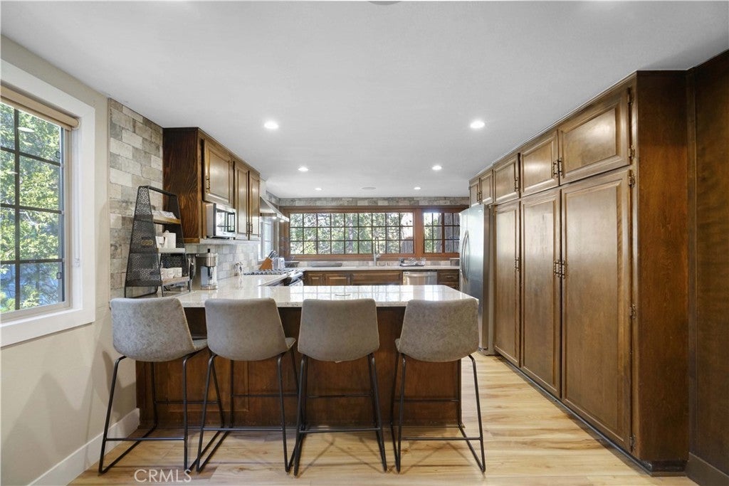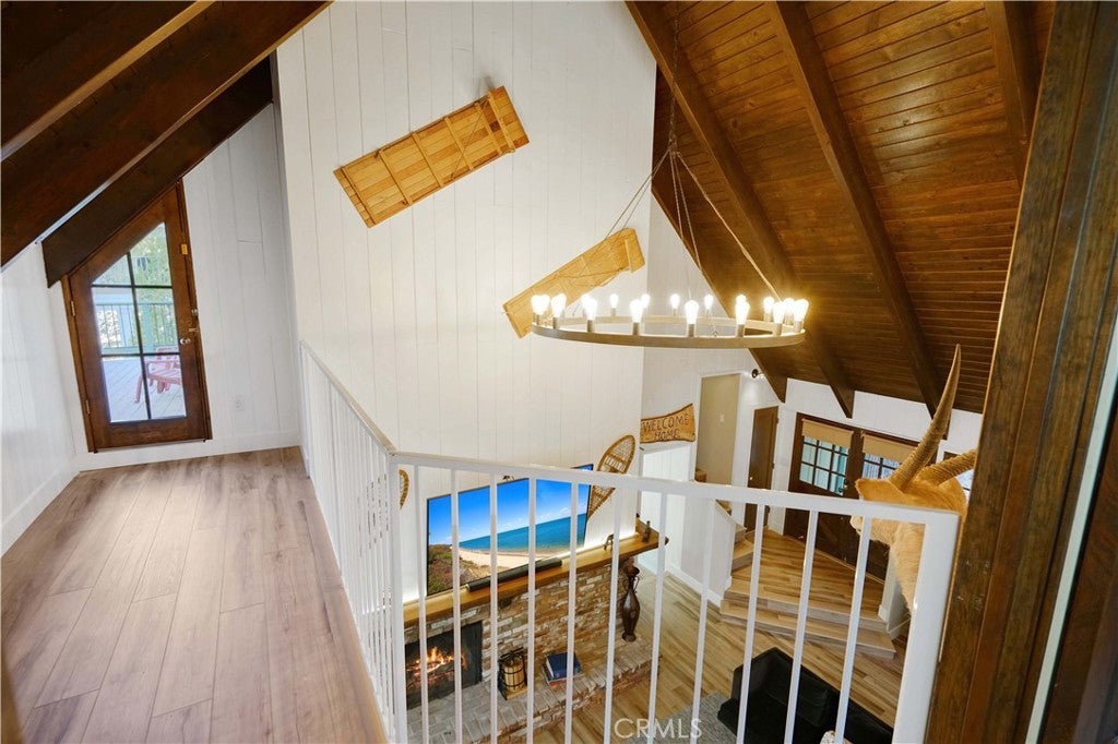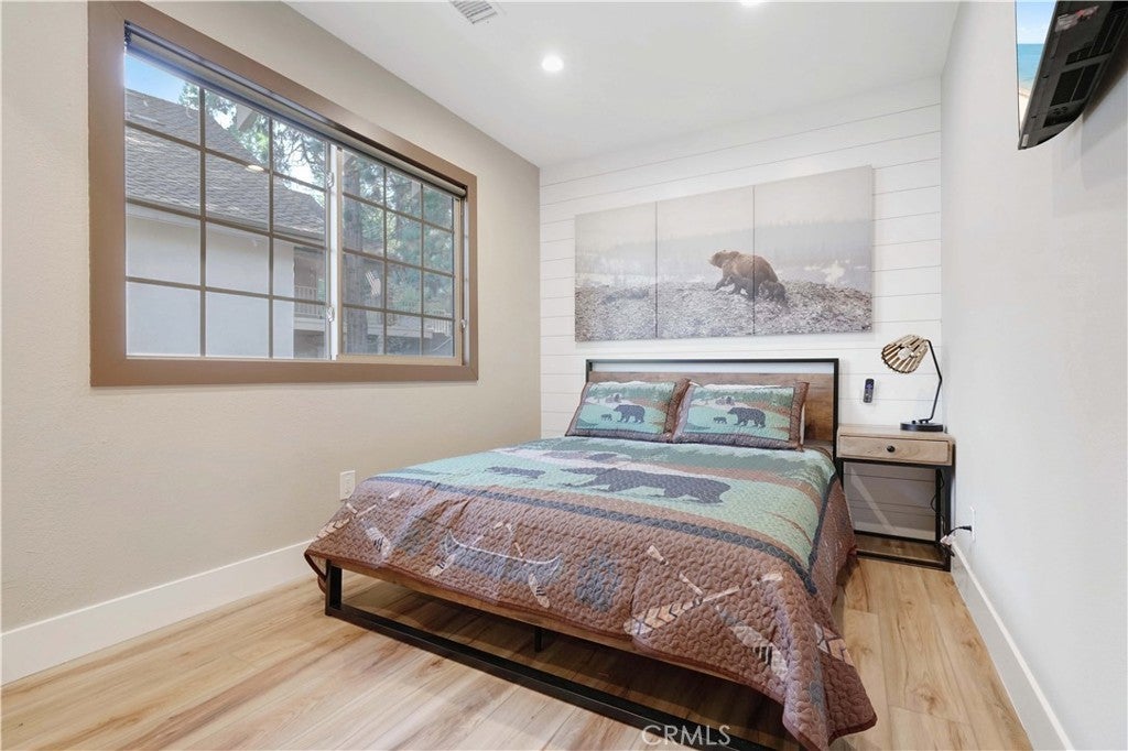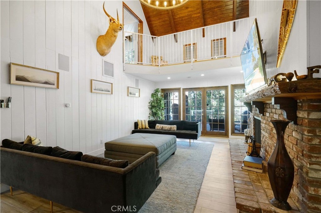 Stunning 5-Bedroom, 3-Bathroom Remodeled Home Key Features: Kitchen: Granite countertops, tile backsplash, stainless steel appliances, built-in ceiling speakers, peninsula, and island with phone pop charger. Living Room: Built-in wall speakers, wood/gas fireplace with LED lights, recessed lighting throughout, vaulted ceilings. Dining: Formal dining area with updated dual-pane windows. Climate Control: Two A/C units for upstairs and downstairs. Bedrooms: Luxury vinyl flooring. Bathrooms: All remodeled with glass enclosures, master bath with above-ground tub. Additional Rooms: Game/family room, washer and dryer room with storage. Garage: Oversized 2-car garage with Tesla charger. Outdoor: Three wood decks, BBQ area and back deck perfect for entertaining and enjoying the landscape, jacuzzi, steps leading to private Lake Arrowhead Country Club, long driveway, usable flat backyard. Extra: Two fireplaces, backup generator hook-ups, surveillance cameras. Investment Opportunity: Airbnb Info: House rents for approximately $100K gross each year. Perfect for luxury living and entertaining!