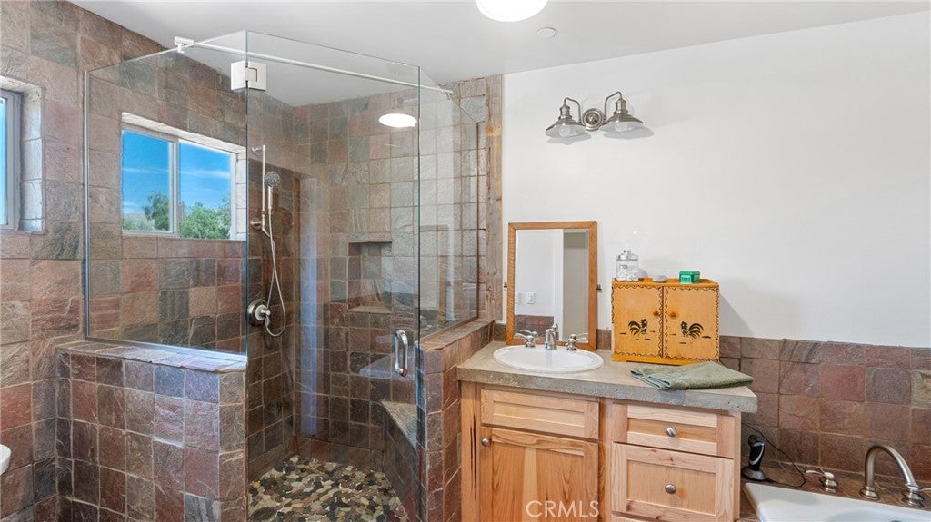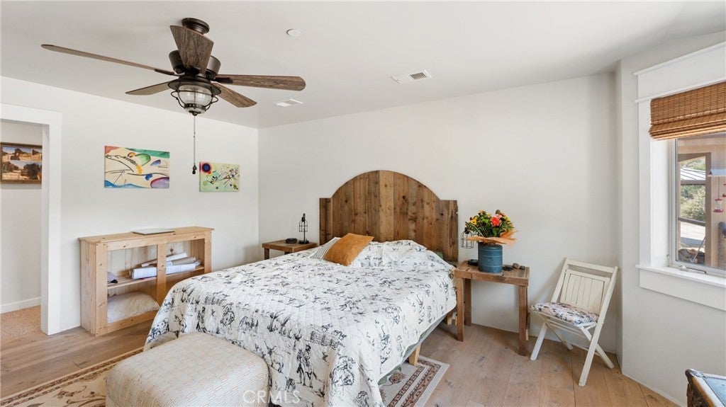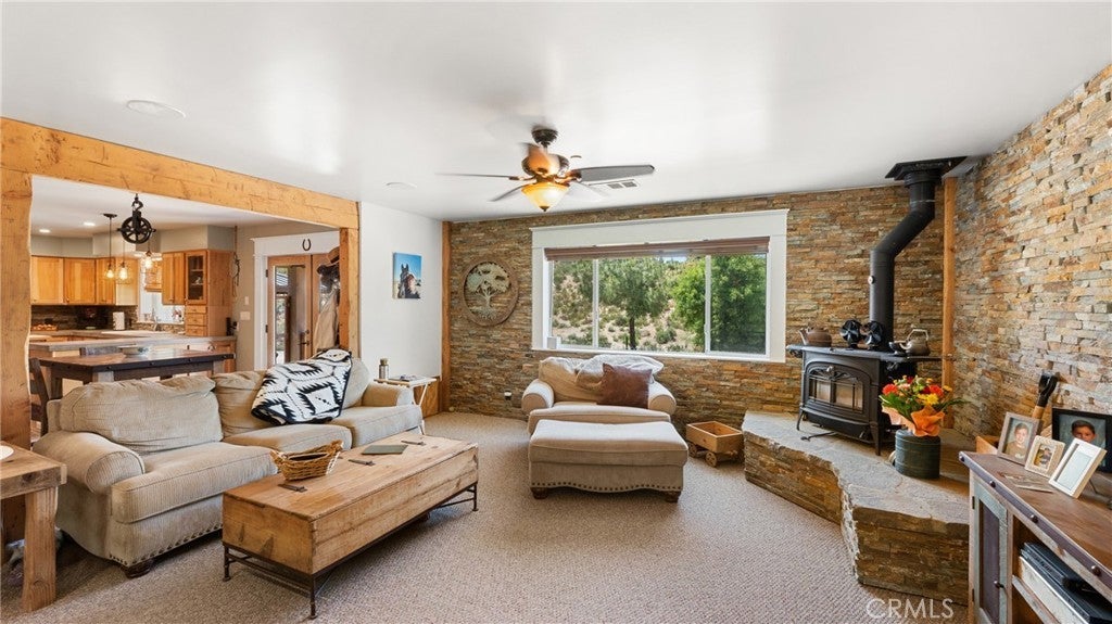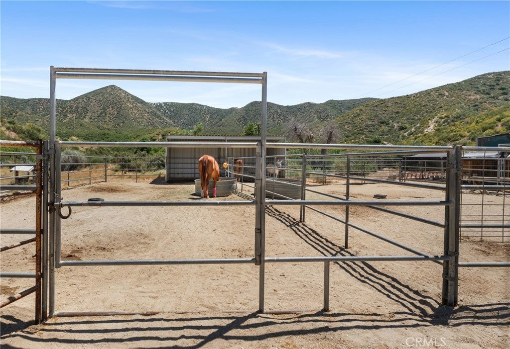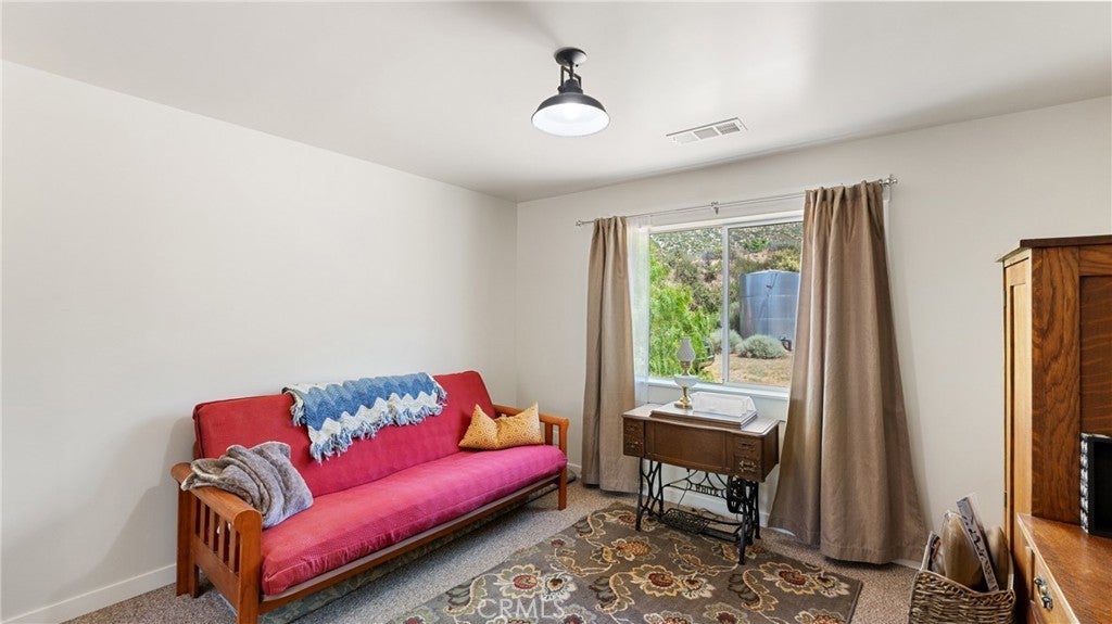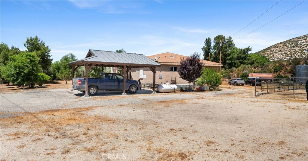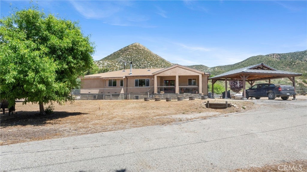 Nestled in the serene and picturesque landscape of Acton, this custom-built home from 2015 offers unparalleled privacy and breathtaking views across its expansive 11.51 acres. Designed with modern fire safety in mind, the property is equipped with an interior fire sprinkler system and a fire hydrant on the premises, ensuring peace of mind. Additionally, two 7,500-gallon water tanks provide ample water supply for emergencies. The dual glazed tempered windows further enhance the home's safety features. This 2,238 sq. ft. residence boasts rustic elegance with Douglas fir post and beam accents. The spacious living room features a stack stone wood-burning fireplace with a hearth, perfect for cozy evenings. The kitchen is a chef's dream, complete with custom concrete countertops, under-cabinet lighting, custom cabinets with pull-outs, and a pantry with a charming barn door. The primary bedroom is a sanctuary with French white oak flooring and a private bath featuring a garden tub and a stall shower with tiled accents. Additional amenities include a private dining room, a laundry room with ample storage, and an attached 2-car garage with a work area. The property is a haven for nature lovers, with mature olive trees, a covered patio, a hay barn, a tack room, a pump house, and a horse turnout with an electric solar fence. A seasonal creek adds to the natural beauty of the surroundings. Modern conveniences such as a tankless hot water heater, a house recirculating pump, and a water filtration system ensure comfort and efficiency. This home is not just a residence; it's a lifestyle. Experience the perfect blend of safety, luxury, and nature in this exceptional Acton property.