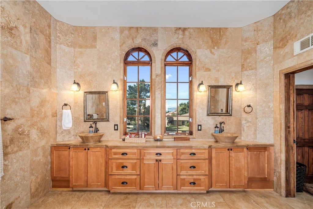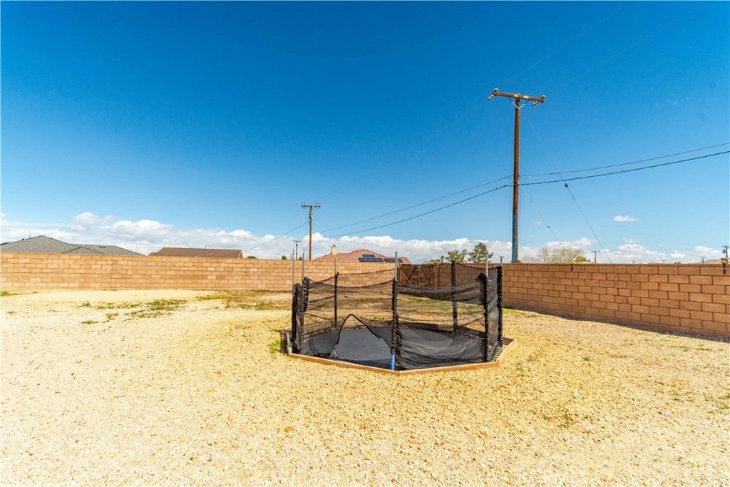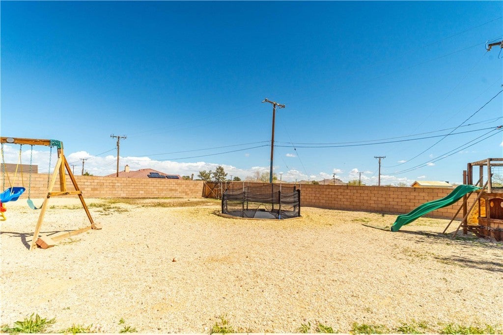**Welcome to Your Dream Home!** Nestled on a quiet cul-de-sac in North California City, this stunning custom-built Mediterranean-style executive home offers elegance, comfort, and high-end finishes throughout. Step inside to a beautifully designed main floor featuring vaulted beam ceilings, arched windows, and a custom electric fireplace that adds warmth and charm to the spacious living area. Enjoy natural travertine flooring throughout, a gourmet kitchen equipped with granite countertops, Viking stove, built-in oven, microwave, dishwasher, refrigerator, and a walk-in pantry. The kitchen flows seamlessly into the dining area, making it perfect for entertaining. Downstairs also features a guest bedroom and full bath. Upstairs, the luxurious master suite is a true retreat, complete with walk-in closets, French doors leading to the patio, and a spa-inspired bathroom with floor-to-ceiling travertine, a heated jacuzzi tub, and a skylight that fills the space with natural light. Generously sized secondary bedrooms offer large walk-in closets, while additional upgrades throughout the home include fresh interior paint, recessed lighting, tinted windows, ceiling fans, a water filtration system, solar panels, and dual A/C units for year-round comfort. The spacious 3-car garage boasts epoxy flooring, and the entertainer's backyard is ready for gatherings with a 12-ft tall pergola, above-ground pool, and an in-ground trampoline for endless fun. This home truly has it all—style, function, and luxury. Don't miss your opportunity to own this incredible property!