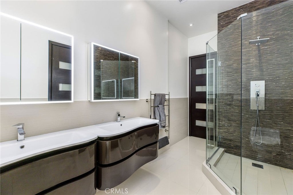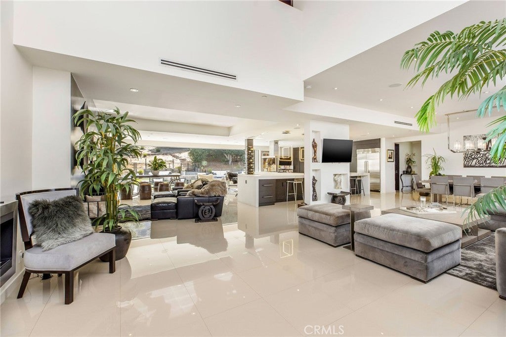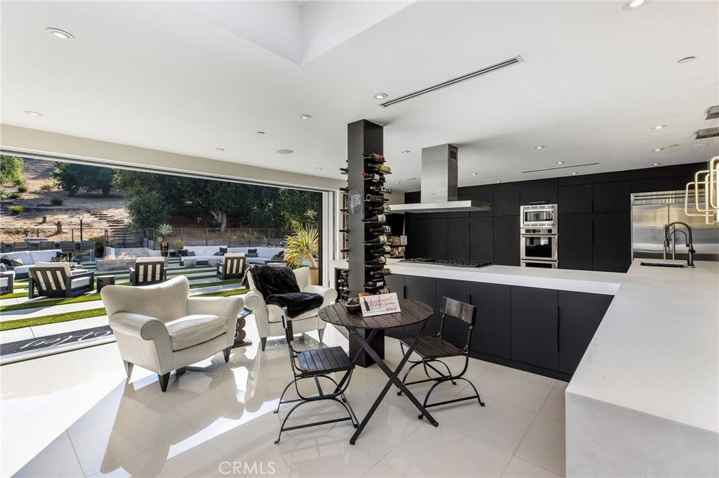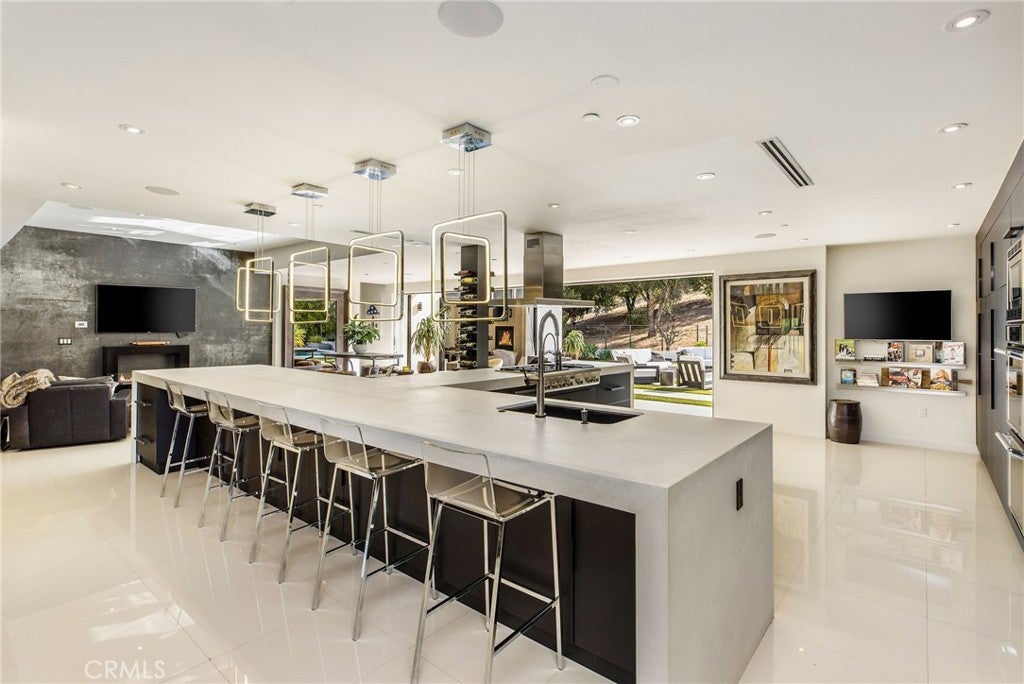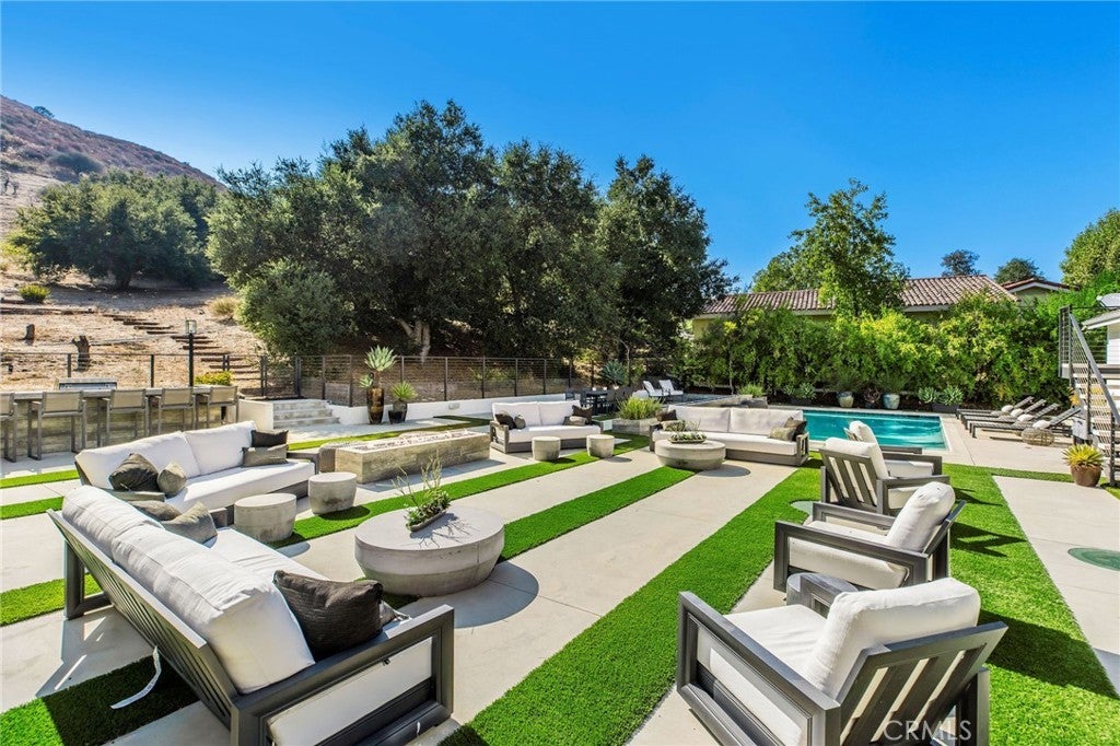 This gorgeous, model sharp home has been beautifully expanded and remodeled throughout. Nestled on a very private 1.23 acre lot in the guard gated community of Bell Canyon, this very sophisticated, yet casually elegant home features a sunny, open floor plan that's bathed in natural light. Highlights include a superb chef's kitchen with custom crafted island, leathered stone countertops, contemporary lighting, and an architectural pillar serving as a statement piece for wine lovers, with all flowing seamlessly into the dining area, living room, and great room featuring stunning white stone flooring, a stone fireplace and sliding walls of glass that open to the spacious rear grounds. The downstairs primary suite is one of four bedrooms on the main level and it serves as a private oasis that includes a luxurious bath complete with dual showers, a circular soaking tub, and generous, dual walk-in closets. There are two big upstairs bedrooms, one with its own private veranda and a separate staircase to the rear grounds. The large backyard offers a large sparkling pool & spa, fully equipped barbecue center, big firepit with patio seating, lush landscaping, mature fruit trees, and room for your own farm to table garden, plus loads of space for year-round relaxation or hosting family gatherings, all framed by peaceful views of the surrounding hills & nearby mountains. "Villa Saddlebow" is also served by the highly regarded Las Virgenes School District, which provides convenient bus service for Bell Canyon residents. Don't miss this home which has much to offer for the discriminating buyer.