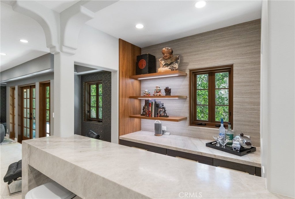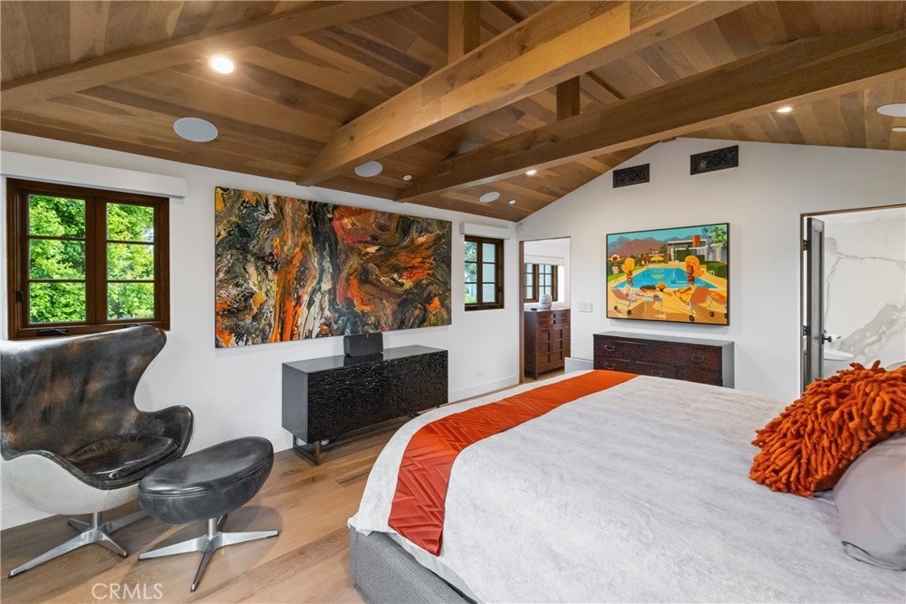 Beamed Ceilings, Breakfast Bar, Cathedral Ceiling(s), Eat-in Kitchen, Recessed Lighting, Bar, Bedroom on Main Level, Primary Suite, Balcony, Built-in Features, Wired for Data, Wired for Sound