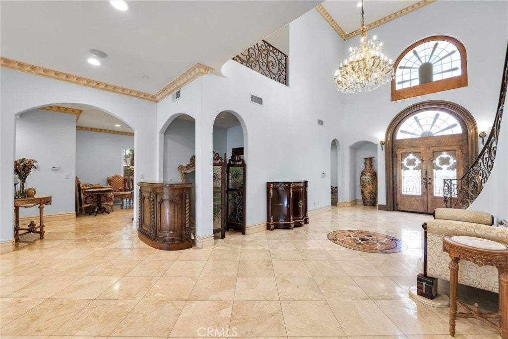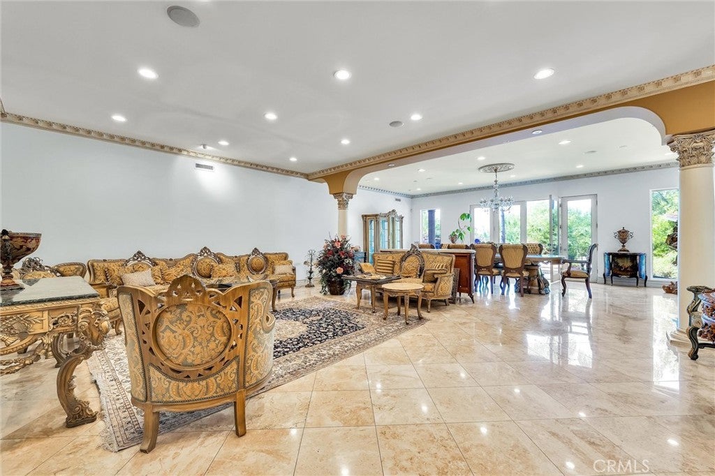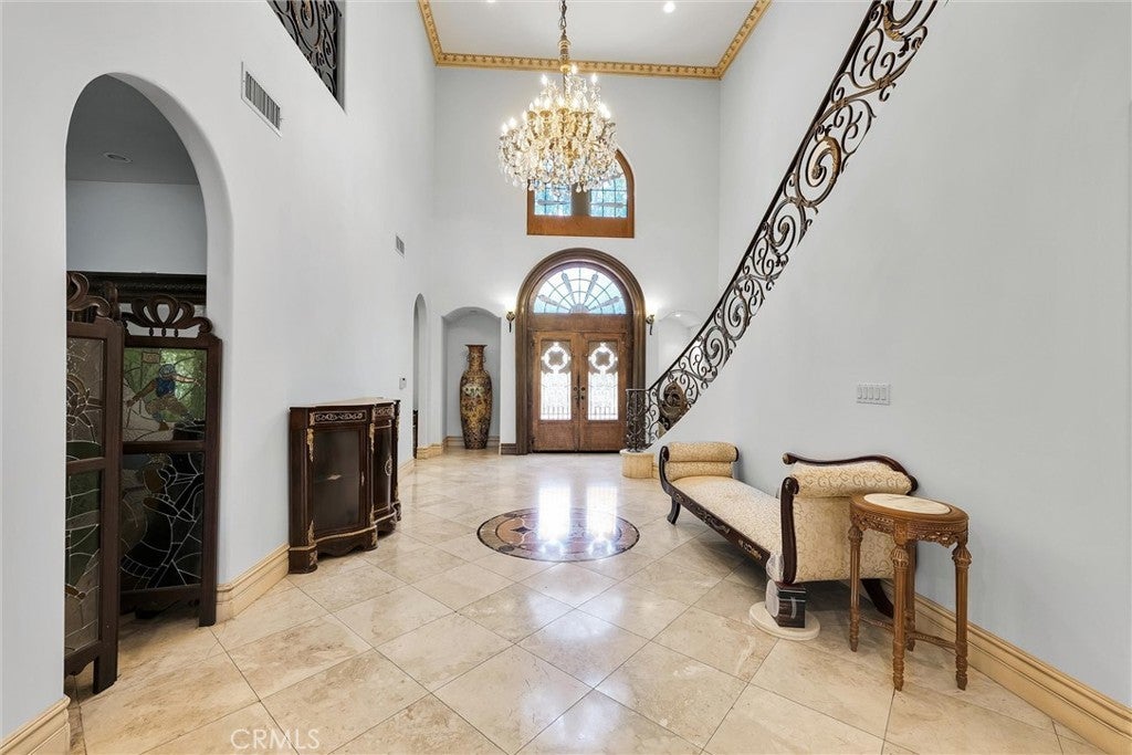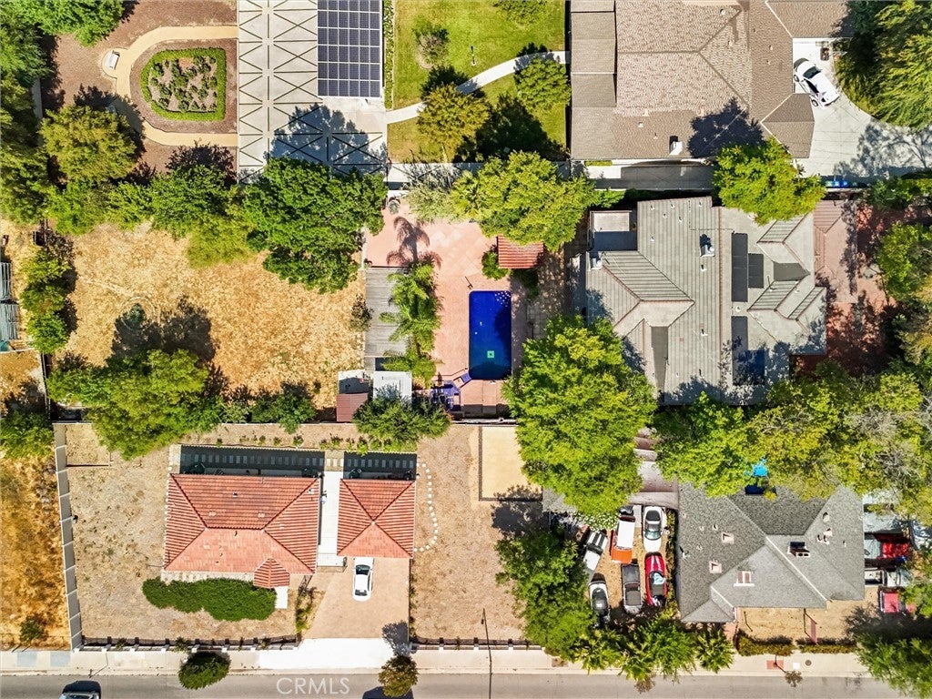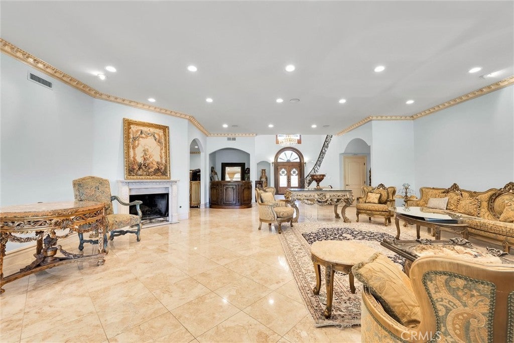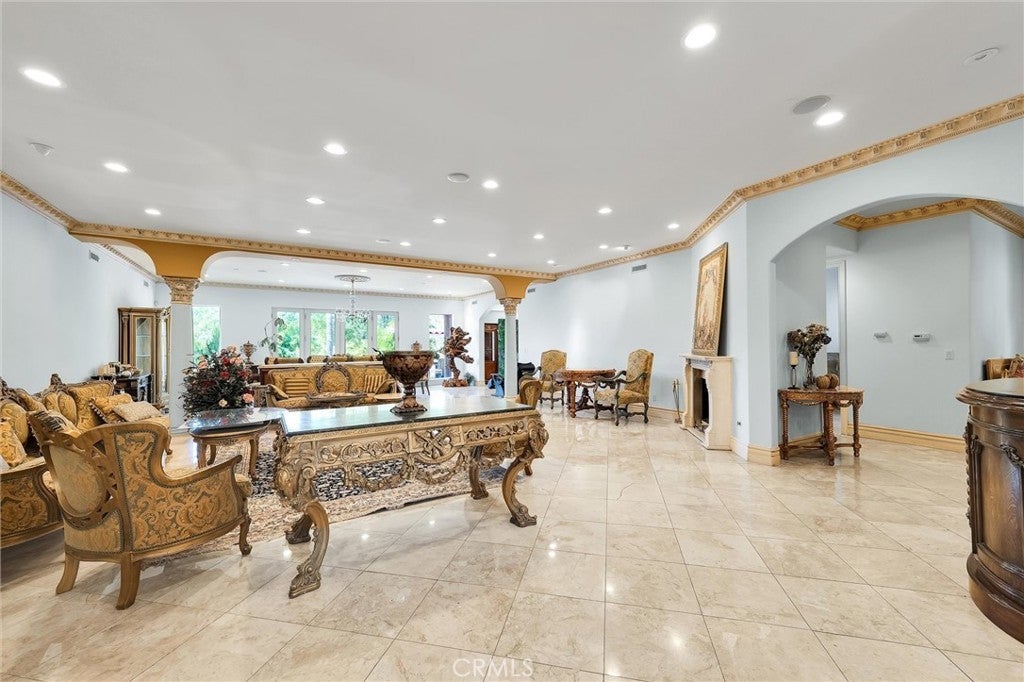 Nestled on a quiet, tree-lined street, this exquisite residence was rebuilt in 2007 and offers over 6,250 sq ft of luxurious living space on a sprawling 22,804 sq ft lot. Designed for comfort and entertaining, the home features 6 spacious bedrooms, 7.5 bathrooms, and a versatile bonus room — with two bedrooms and the bonus room conveniently located on the first floor. Step through the grand double-door entry into a dramatic foyer with soaring vaulted ceilings, elegant crown molding, and a spacious formal living room with a marble fireplace. The bright, French-style kitchen is a chef's dream, showcasing custom European Craftsman cabinetry, granite countertops, a large center island, and top-of-the-line Sub-Zero and Wolf appliances. A charming breakfast area overlooks the expansive, flat backyard with a sparkling swimming pool - ideal for hosting guests or enjoying peaceful mornings. Upstairs, a custom antique wrought iron staircase leads to a gallery landing with hardwood flooring and and four deluxe bedrooms. The luxurious primary suite includes a private balcony, dual walk-in closets, and a cozy fireplace. Additional highlights include marble flooring on the first level, an integrated sound system, a fully gated semi-circular driveway, a 3-car garage, and solar panels for energy efficiency. Blending timeless elegance with modern amenities, this exceptional home is a rare opportunity to enjoy premium living in one of Woodland Hills' most desirable neighborhoods. Furnished is negotiable.
