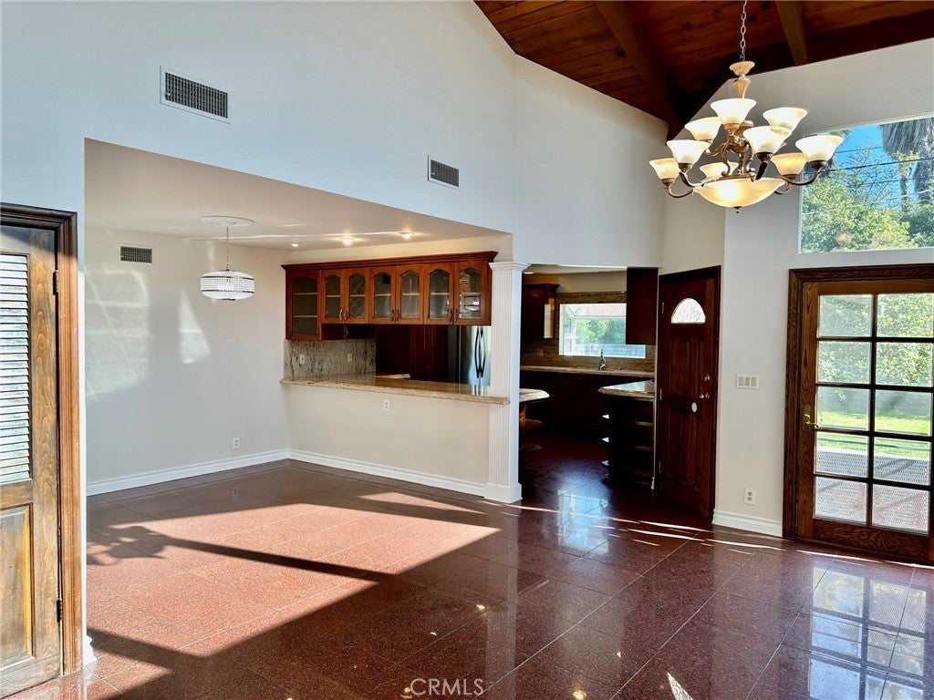 Welcome to Lake Balboa! This charming house offers open floor plan with spacious rooms, great for entertaining. Light and bright. Double door formal entry with Italian tile floors lead to a large step-down living room with fireplace and Brazilian cherry hardwood floors. Step-down family room with 17 ft open beam ceiling and granite floors. Formal dining area. Amazing, remodeled kitchen with granite counter tops, newer microwave, recessed lighting, garden window, cherry wood cabinets with glass fronts, wine cabinet and granite floors overlooking the backyard. Primary suite with walk-in closet, private bathroom with granite counter tops and double sink. Stainless Steel Refrigerator, washer and dryer is included. Other features include central air and heat, copper plumbing, newer kitchen and bathroom faucets, few bedrooms with newer cordless window coverings, ceiling fans and crown moldings. Private and beautiful backyard with brick patio, grassy area, and fruit tree. Gated driveway with 2 car detached garage. Storage shed. Prime location.