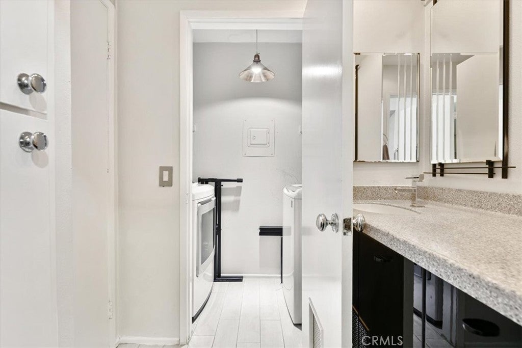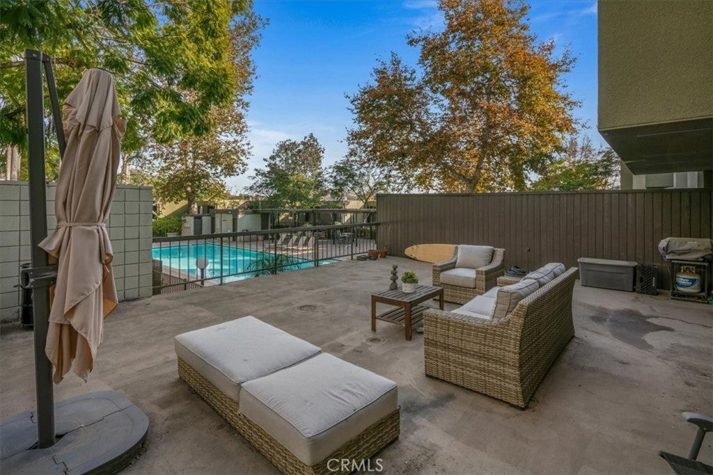 Welcome to Temple Terrace, a modern oasis in the heart of Los Angeles. This first floor home offers a rare opportunity to purchase a unit with a vast private patio that provides an incredible outdoor living space! Overlooking the pool, this feels like resort living. This stylish 2-bedroom, 1-bathroom residence also offers a spacious and comfortable living space, perfect for those seeking a blend of urban convenience and serene living. Step inside to discover a thoughtfully designed interior featuring a remodeled kitchen with a sleek breakfast bar, ideal for casual dining and entertaining. The open layout seamlessly connects the living area, creating a welcoming atmosphere for relaxation and gatherings. Enjoy the convenience of a washer and dryer in the unit and Central Heat/AC. Residents will appreciate the common outdoor space, including pool and spa, perfect for enjoying the California sunshine, and the convenience of an elevator for easy access. Parking is a breeze with 2 assigned garage parking spaces with EV charging available.