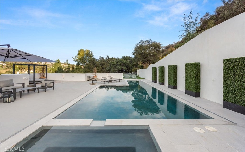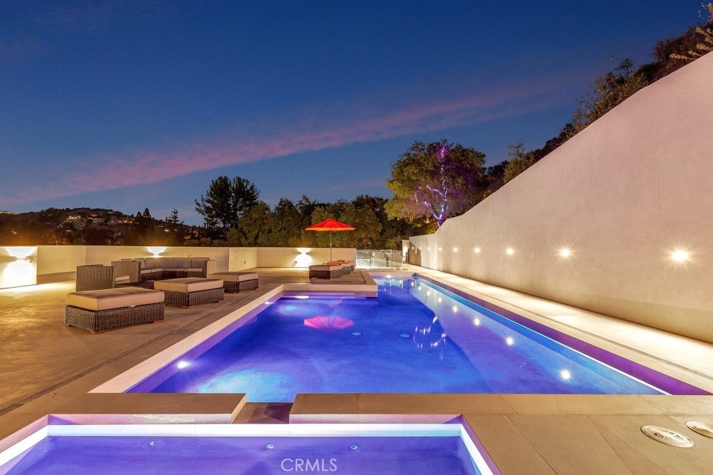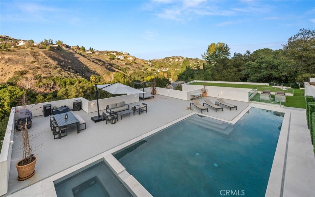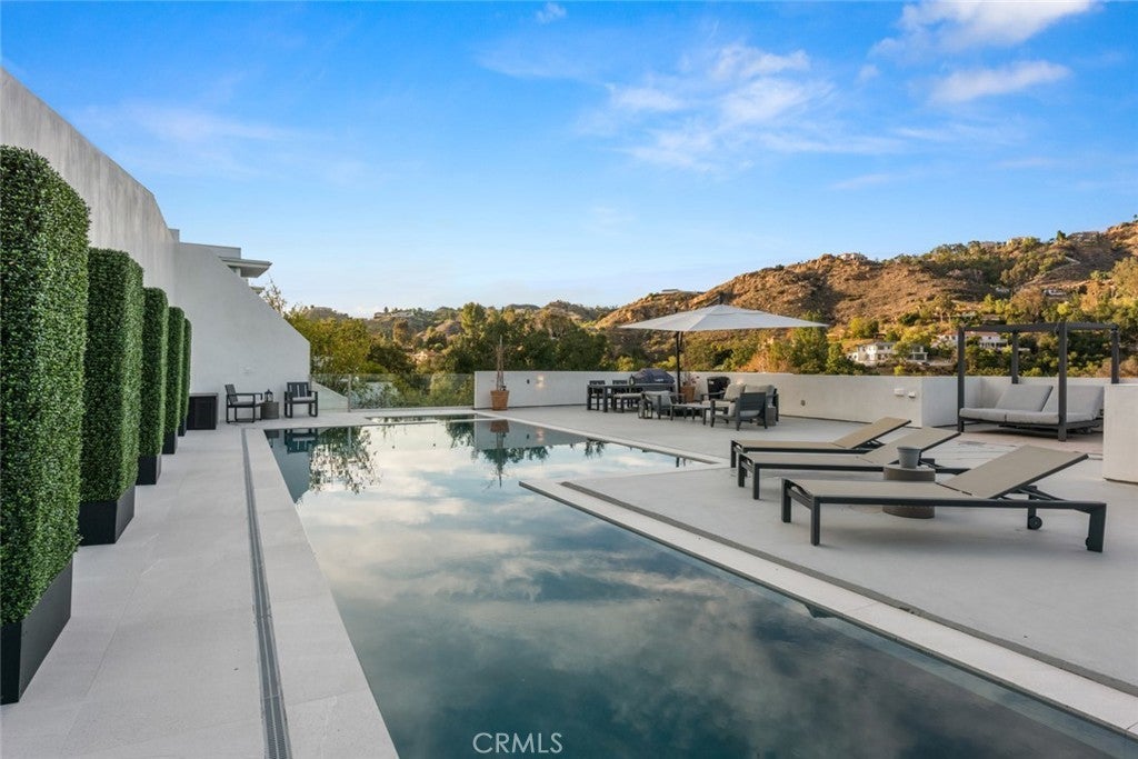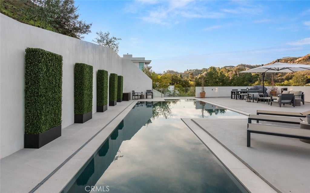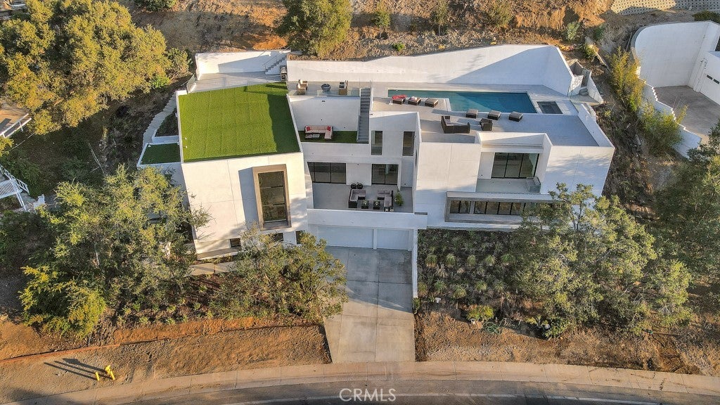 Exquisite Modern Masterpiece in Prestigious Bell Canyon Step into a furnished, meticulously designed modern home where exquisite architectural attention to detail meets luxury living. Enjoy high ceilings and abundant natural light in the expansive living areas. Entertain guests in a spacious kitchen with an inviting quartz top center island, contemporary cabinetry, and premium appliances, including quadruple Bosch ovens, a Viking Thermador refrigerator, and double sinks. The boundlessly open living room features floor-to-ceiling glass pocket doors for seamless indoor/outdoor flow, a glass-enclosed illuminated wine cellar under the stairway, and a 22ft by 20ft 5k Laser projector for watching your favorite games or movies. Ascend to the upper level via stairway or elevator to find a chic primary bedroom with a floor-to-ceiling glass window offering picturesque views of serene greenery and mountains. The suite includes an abundant walk-in closet and a sleek master bathroom with an enormous shower and a separate romantic tub. The massive rooftop deck boasts unobstructed mountain and sunset views, an invigorating in-ground pool, and a spa surrounded by lush green mountains. The lower level houses a full gym with a private entrance and bath that can be converted into a private office or movie theater. Located in the prestigious 24-hour, guard-gated community of Bell Canyon, renowned for its equestrian center, private parks, hiking trails, tennis courts, community center, and award-winning LVUSD schools.