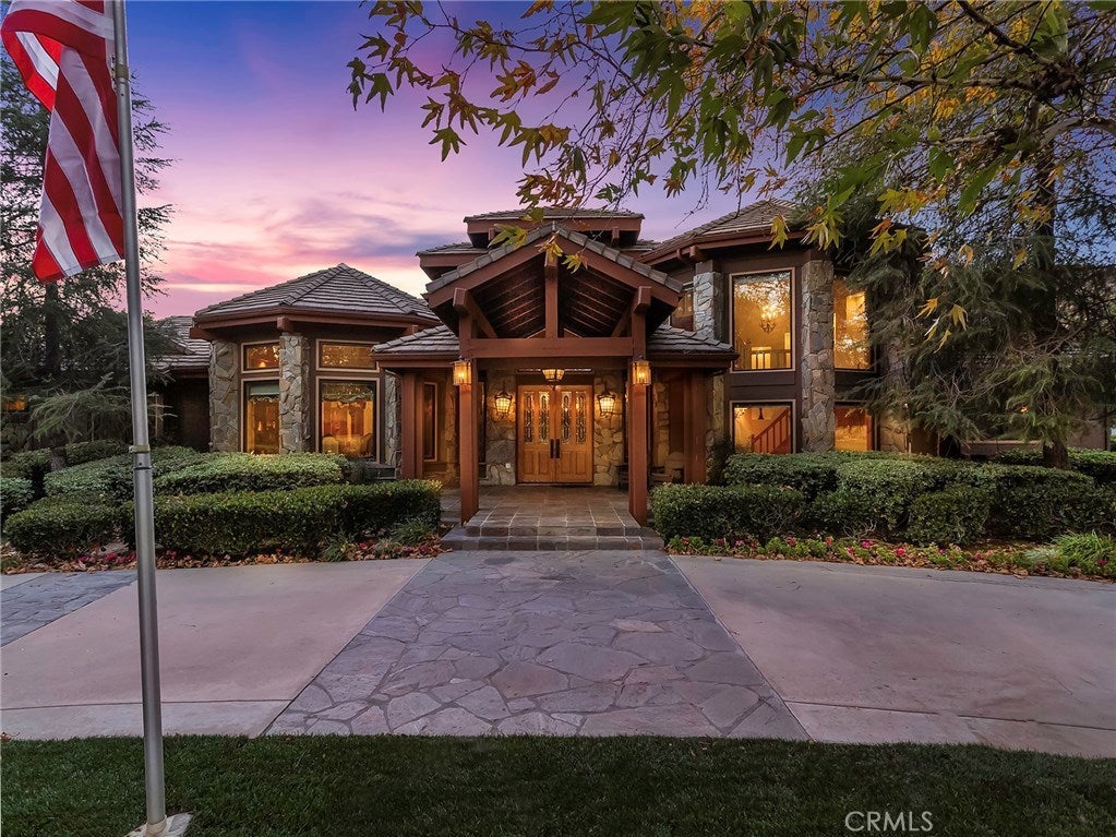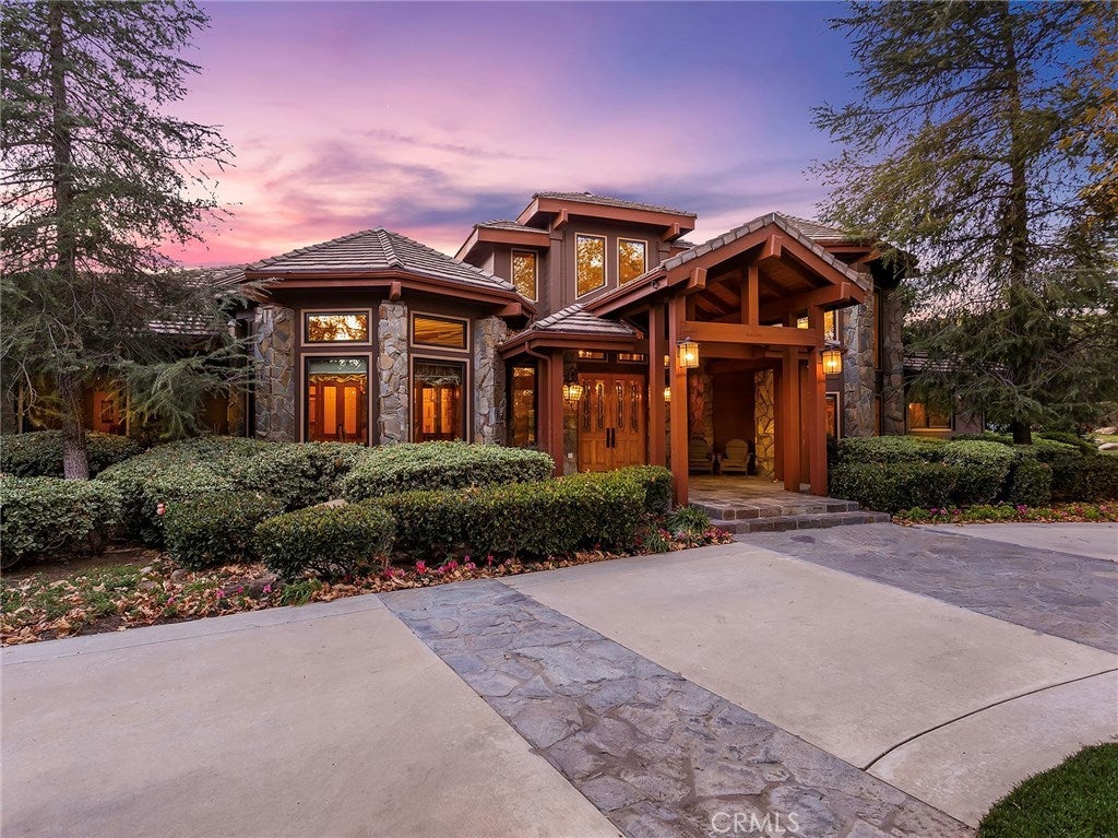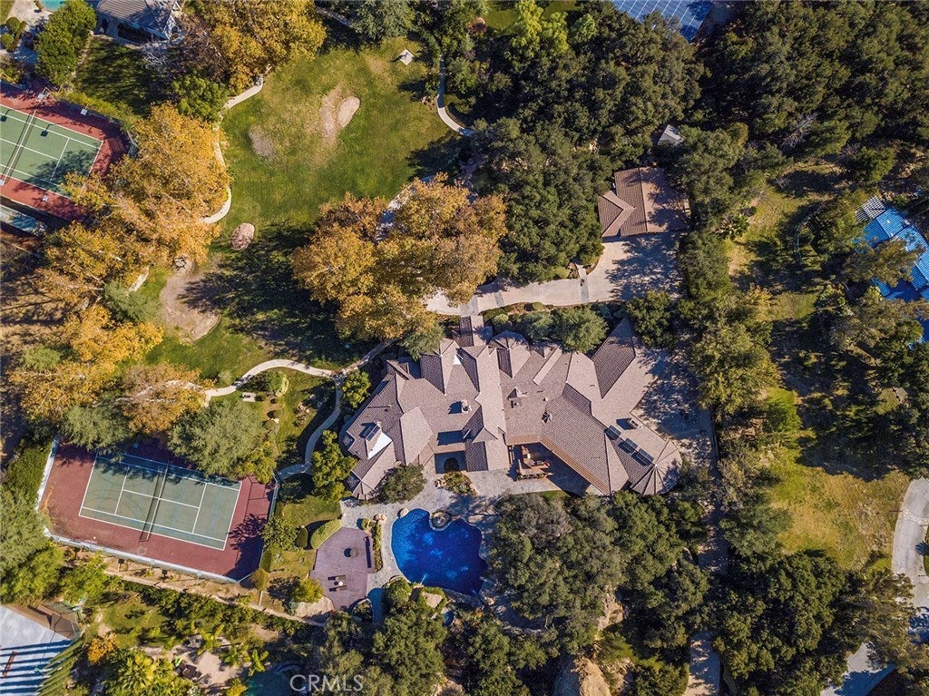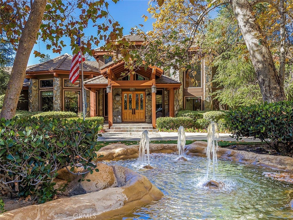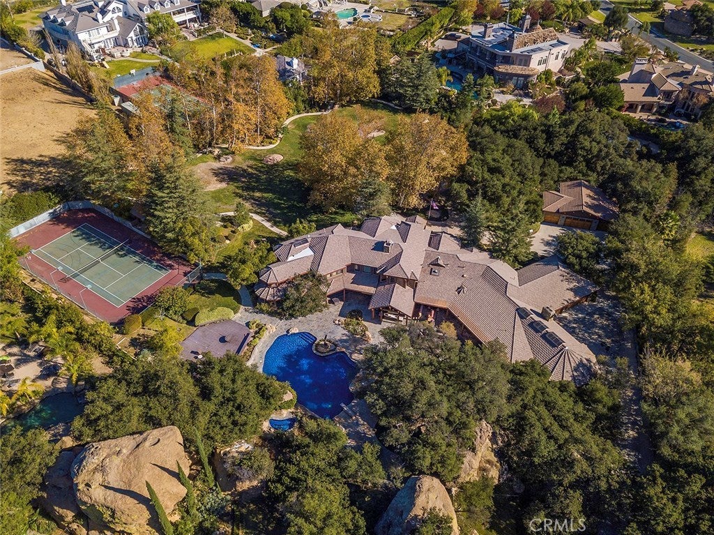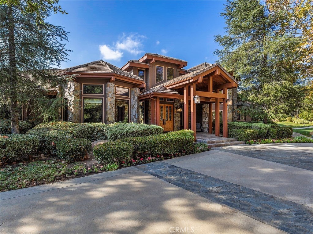 Vacation living all year round. Quiet and private. Set behind private gates & down a long driveway sits this amazing, 6 bed, 6 ½ bath, almost 8,500 square foot estate. Grand architecture with craftsman details. Enormous Great Room/Game Room featuring a wet-bar, built in entertainment center & double-sided stone fireplace with inglenook seating. The remodeled kitchen has granite counter tops, large center island, high-end stainless steel appliances, butler’s pantry & large walk-in pantry. There is also a large wine cellar. The Owner's suite encompasses the entire upstairs & incl. built-in dual desks, stone fireplace, dual closets, large balcony & exquisite bath with dual vanities, jetted tub & steam shower. No luxury has been overlooked. The additional 5 bedrooms are on the main level & in each you will find a walk-in closet &en-suite bath. Garage parking for 8 cars plus additional RV and motorcycle parking. The approx. 2 ½ acre lot incl. a lighted N/S Tennis Court w/ covered viewing pavilion, fire pit, pitch & putt golf course,Dual BBQ Center & a truly breathtaking fully-tiled pool & spa crowned with a waterfall that cascades from natural rock formations. Truly a resort, no detail was overlooked, no amenity is lacking, and this estate is exceptional in every way. Coveted 24-hour guard gated neighborhood is convenient to 118-fwy, dining, and entertainment.