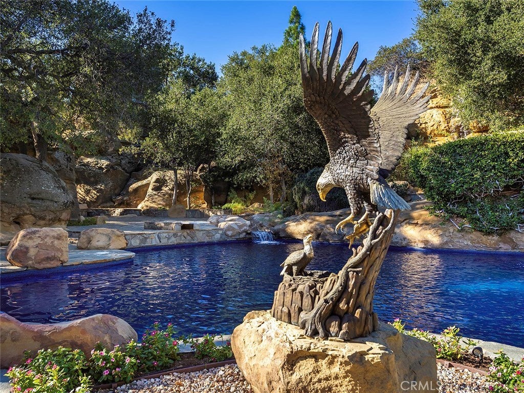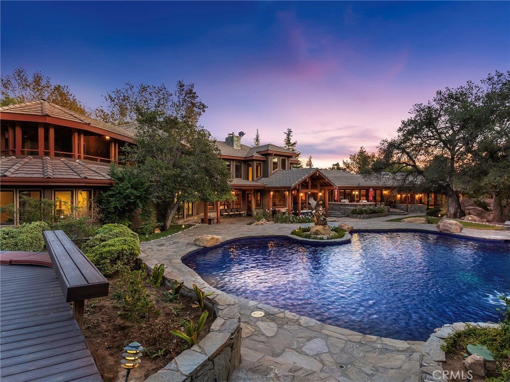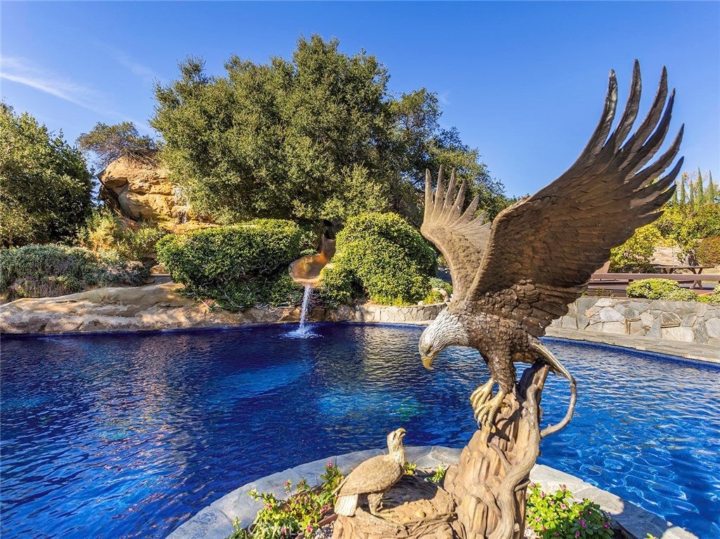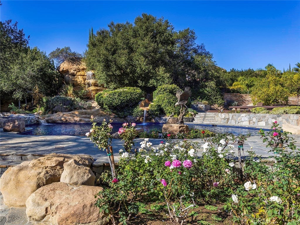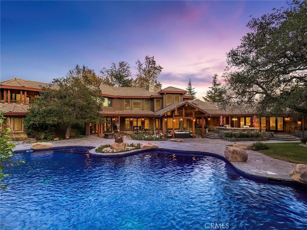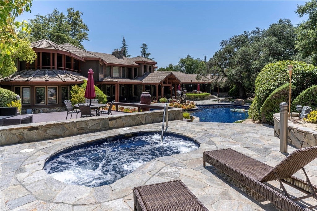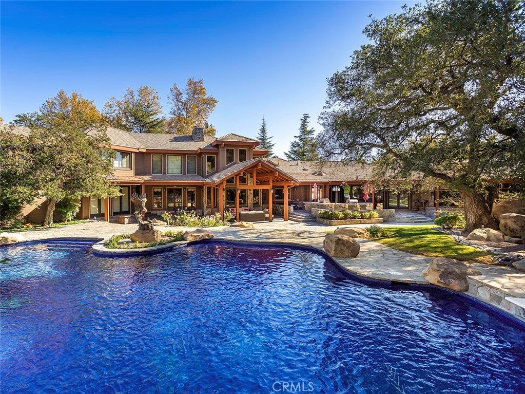 Vacation living all year round. Quiet and private. Set behind private gates & down a long driveway sits this amazing, 6 bed, 6 ½ bath, almost 8,500 square foot estate. Grand architecture with craftsman details. Enormous Great Room/Game Room featuring a wet-bar, built in entertainment center & double-sided stone fireplace with inglenook seating. The remodeled kitchen has granite counter tops, large center island, high-end stainless steel appliances, butler’s pantry & large walk-in pantry. There is also a large wine cellar. The Owner's suite encompasses the entire upstairs & incl. built-in dual desks, stone fireplace, dual closets, large balcony & exquisite bath with dual vanities, jetted tub & steam shower. No luxury has been overlooked. The additional 5 bedrooms are on the main level & in each you will find a walk-in closet &en-suite bath. Garage parking for 8 cars plus additional RV and motorcycle parking. The approx. 2 ½ acre lot incl. a lighted N/S Tennis Court w/ covered viewing pavilion, fire pit, pitch & putt golf course,Dual BBQ Center & a truly breathtaking fully-tiled pool & spa crowned with a waterfall that cascades from natural rock formations. Truly a resort, no detail was overlooked, no amenity is lacking, and this estate is exceptional in every way. Coveted 24-hour guard gated neighborhood is convenient to 118-fwy, dining, and entertainment.