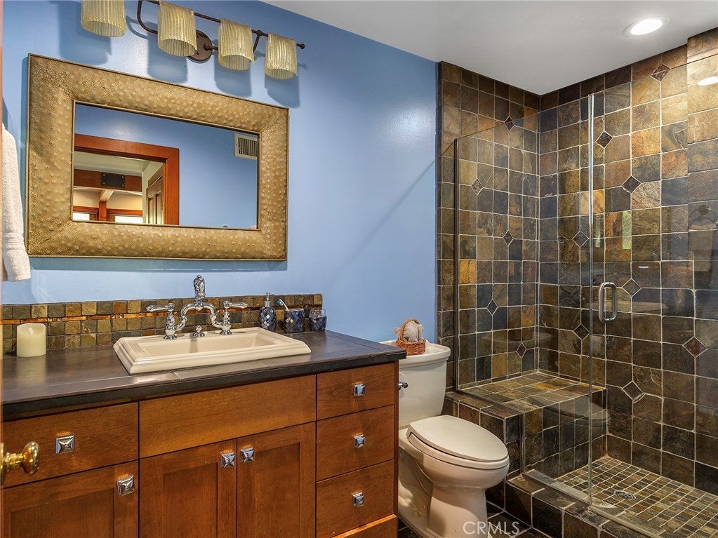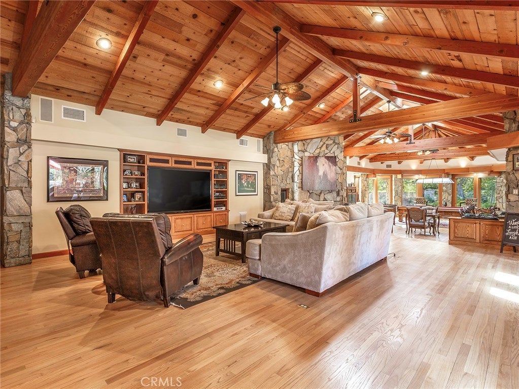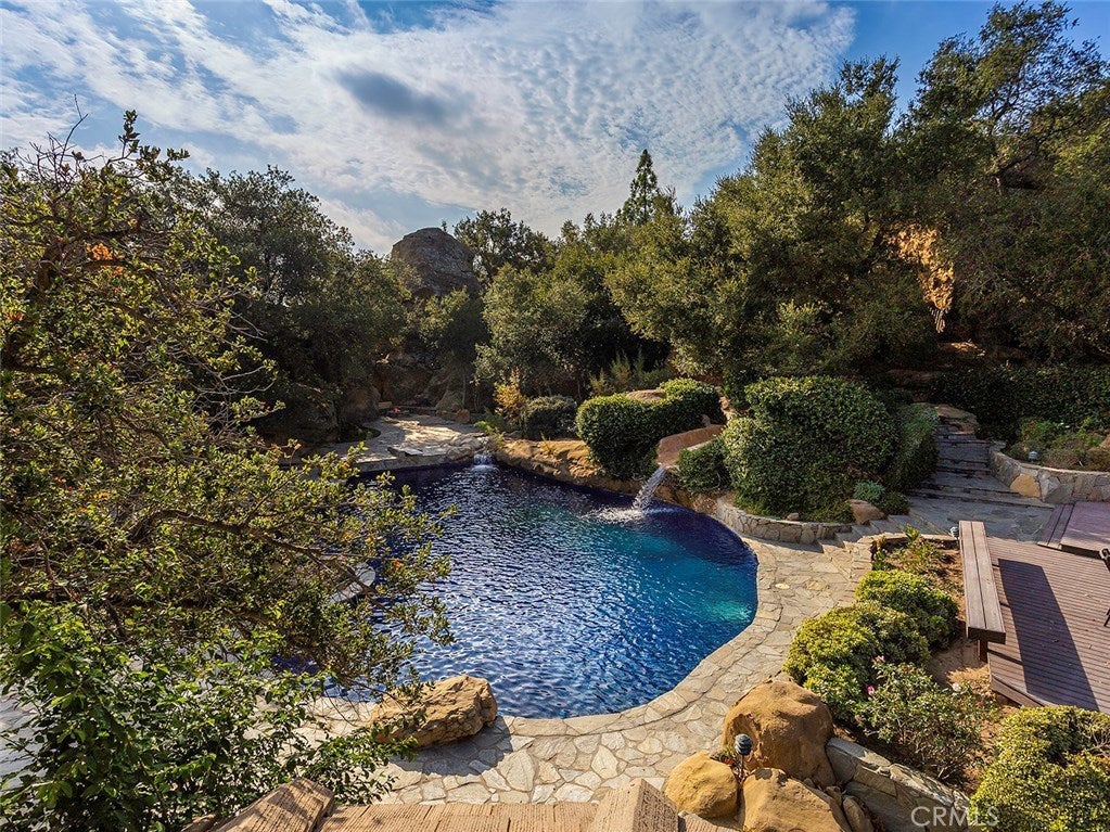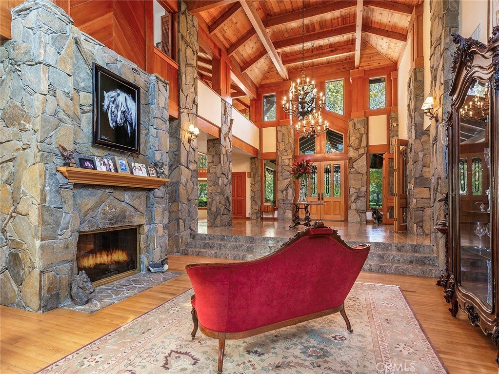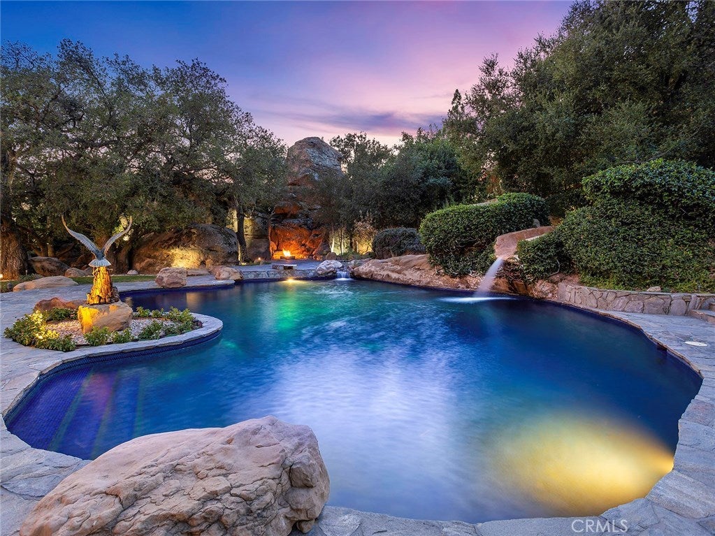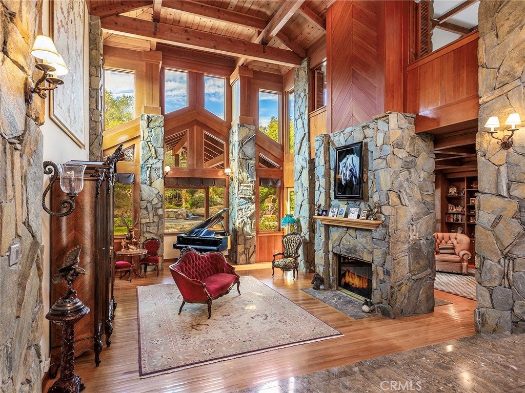 Vacation living all year round. Quiet and private. Set behind private gates & down a long driveway sits this amazing, 6 bed, 6 ½ bath, almost 8,500 square foot estate. Grand architecture with craftsman details. Enormous Great Room/Game Room featuring a wet-bar, built in entertainment center & double-sided stone fireplace with inglenook seating. The remodeled kitchen has granite counter tops, large center island, high-end stainless steel appliances, butler’s pantry & large walk-in pantry. There is also a large wine cellar. The Owner's suite encompasses the entire upstairs & incl. built-in dual desks, stone fireplace, dual closets, large balcony & exquisite bath with dual vanities, jetted tub & steam shower. No luxury has been overlooked. The additional 5 bedrooms are on the main level & in each you will find a walk-in closet &en-suite bath. Garage parking for 8 cars plus additional RV and motorcycle parking. The approx. 2 ½ acre lot incl. a lighted N/S Tennis Court w/ covered viewing pavilion, fire pit, pitch & putt golf course,Dual BBQ Center & a truly breathtaking fully-tiled pool & spa crowned with a waterfall that cascades from natural rock formations. Truly a resort, no detail was overlooked, no amenity is lacking, and this estate is exceptional in every way. Coveted 24-hour guard gated neighborhood is convenient to 118-fwy, dining, and entertainment.