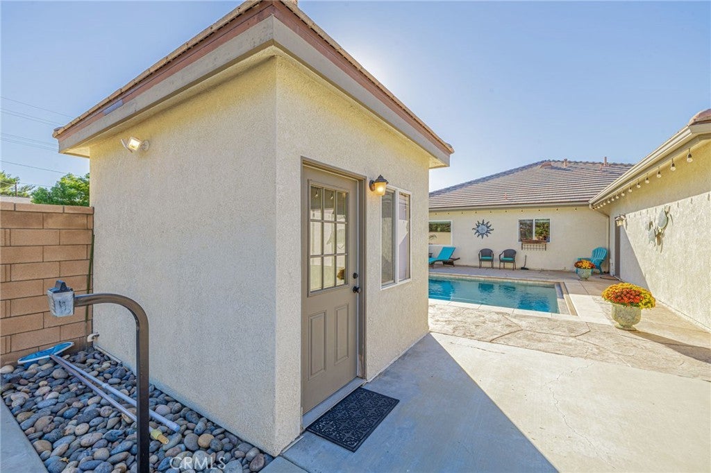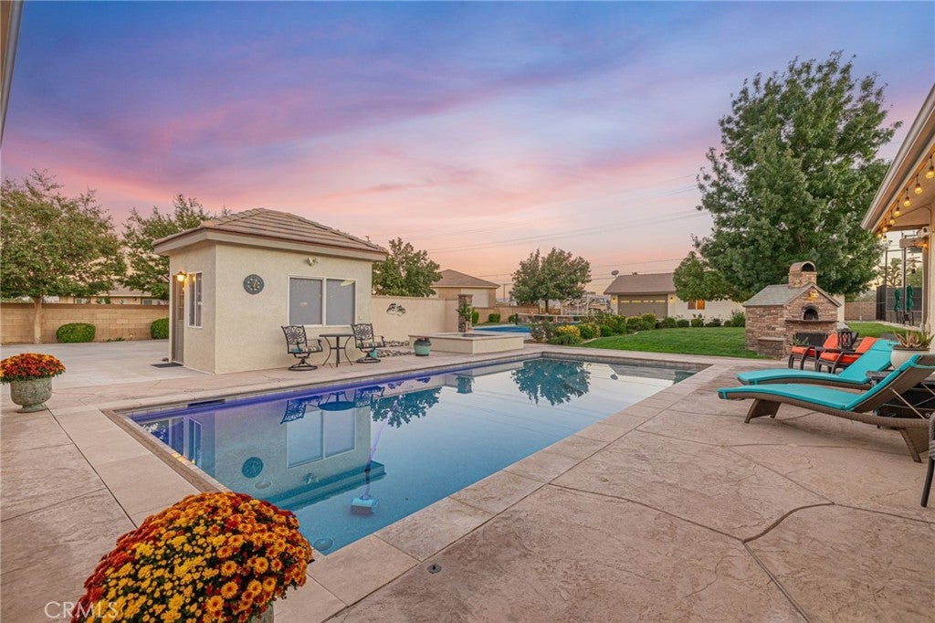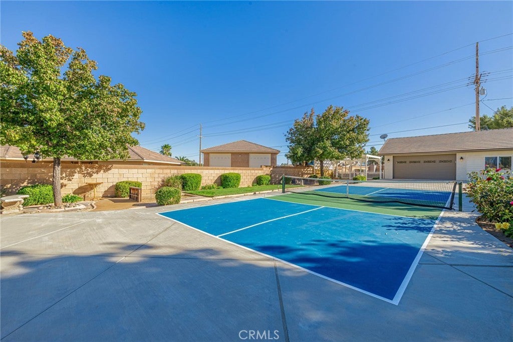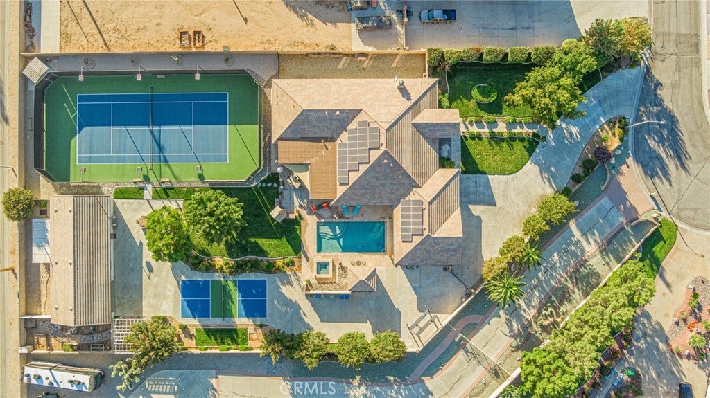 Five Star Resort Living! Tennis before breakfast and a swim after work -are just two of the exciting amenities found in this gorgeous property! Desert Rose Custom home w/ everything you can dream of! Elegant 5 bedroom, 4 bath single story home on 1 Acre +/- lot. Energy Efficient owned Solar system. This exclusive home offers a spacious floorplan with a soothing feel. Wide hallways, expansive rooms, custom upgrades everywhere you look. Large formal living rm, formal dining rm, open family rm. Excellent kitchen with center island and roomy pantry area. Double oven, 5 burner cooktop, large stainless steel refrigerator and all the amenities a home chef needs. The bedroom wing offers 4 sizable bedrooms, 2 full bathrooms plus the enormous double door entry master bedroom suite and tranquil master bathroom with jacuzzi tub. Large walk in organized closet and private door to the wonderful patio area. Moving on to the other exciting features of this home - The attached 4+ car super sized and insulated garage is truly a showplace. Epoxy floors, space saving cabinets & shelves and excellent lighting. You won't believe how much space this garage offers. Plenty of paved driveway and RV parking area, Top of the line fully lighted tennis court plus a full size pickleball court. In-ground pebbletech pool with auto cover and lounge deck and luxurious spa. Detached Pool house with outdoor shower. Horseshoe pits. First class covered patio with the ultimate grillmasters entertainment area. The outdoor kitchen includes a smoker, BBQ, refrigerator, 2 burners, built-in sound system, mounted TV, ceiling fans and granite countertop bar that seats 8. Crowd pleasing Wood burning pizza oven imported from Italy with cultured rock exterior and copper roof. Plenty of room to relax and enjoy! Last but not least -the approx 1100sf detached guest house, 2 bed/2 bth, w/living rm & kitchen with oversized 2 c. gar and extra storage(originally permitted as garage and workshop). The list goes on & on!