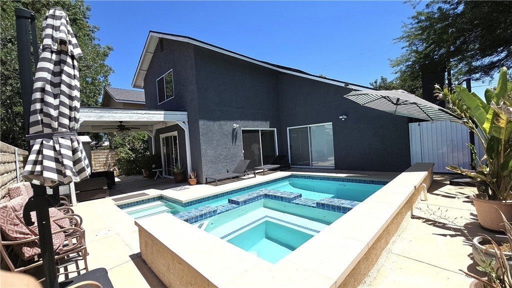 The front of the home is beautifully manicured and features impressive Roman-style pillars that immediately catch your eye. Welcome to this incredible hidden gem located in the heart of the Valley! As you step through the charming accented front door, you are instantly drawn to the open floor plan, which includes a formal living room complete with a custom fireplace. The formal dining area adds a touch of elegance, with large sliding doors that allow abundant natural light and provide a stunning view of the beautiful water features in the pool area. The perfectly designed kitchen features stainless steel appliances, granite countertops, and a cozy breakfast nook. It opens seamlessly into the family room and eating area, which boasts two additional sliding doors that grant you multiple access points to the fantastic backyard. A versatile office area downstairs can serve as a library or study, complete with a 3/4 bath. Upstairs, you will find three bedrooms and two bathrooms. The main suite is exceptionally spacious, featuring vaulted ceilings, mirrored closet doors, and an en-suite bathroom. The main bathroom has dual sinks and a luxurious Jacuzzi tub, offering a relaxing retreat after a long day at work. Adjacent to the master is a separate area that can be utilized as a home gym or yoga studio. Solar panels and battery.