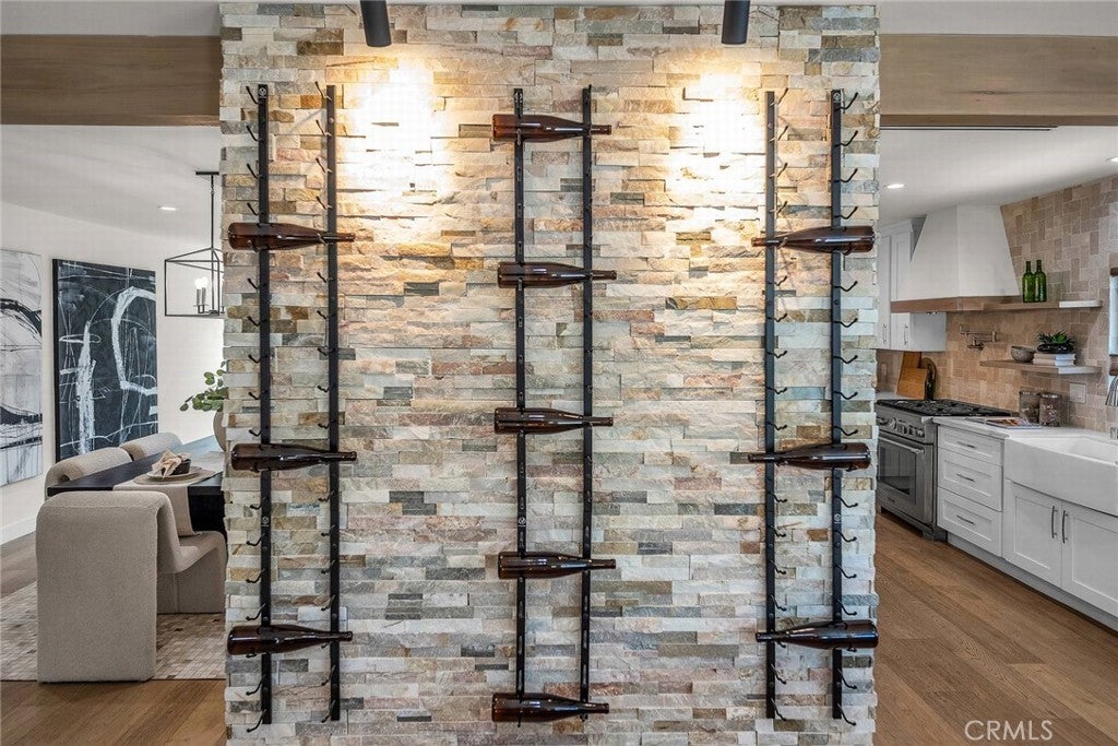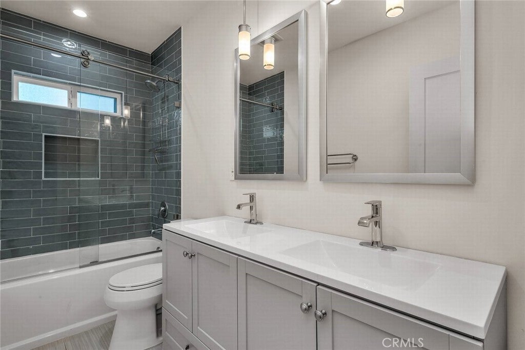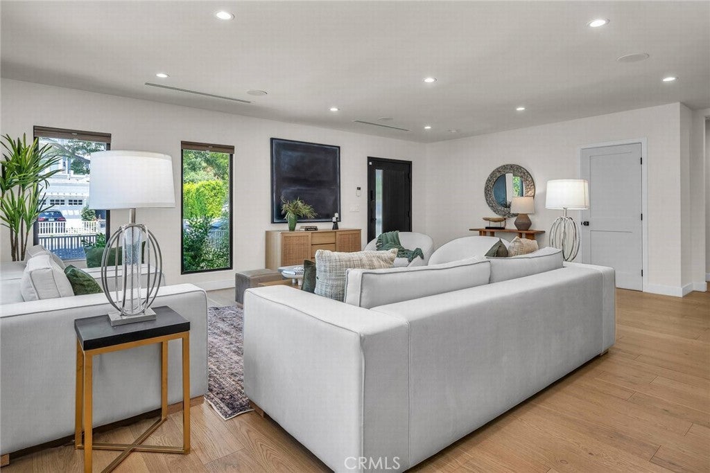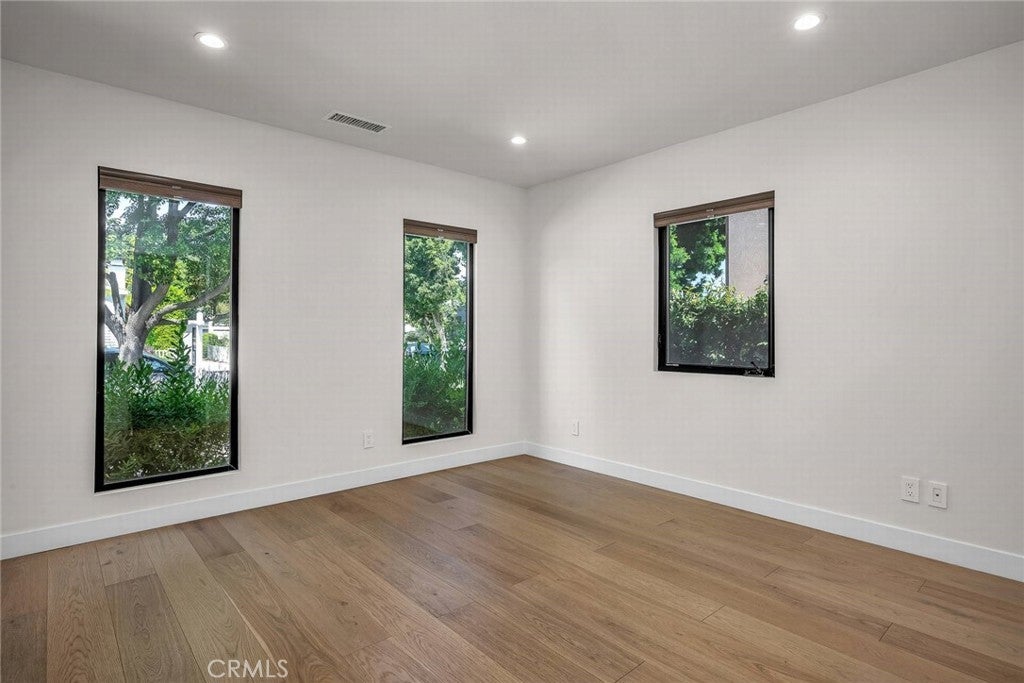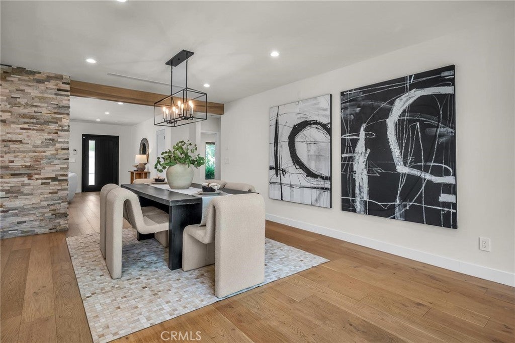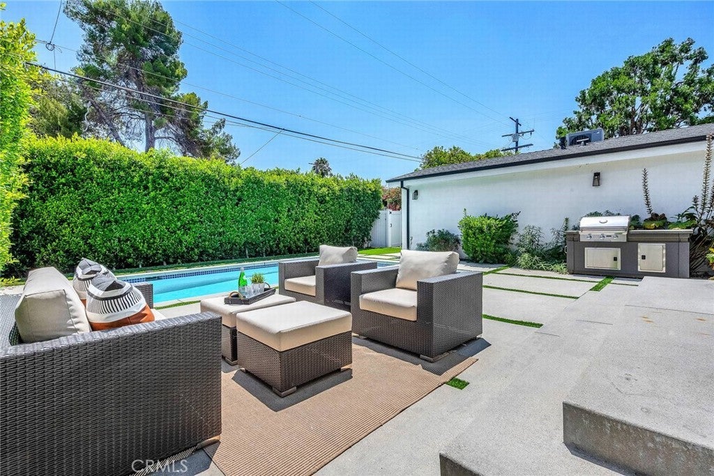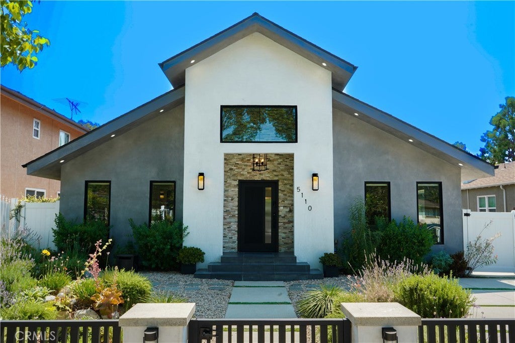 Welcome to this stylish and thoughtfully designed modern French farmhouse in the heart of Sherman Oaks. From the moment you arrive, the bold front entry—featuring a contemporary chandelier and stone accent wall—sets the tone for what’s inside. Step into a bright, open two-story layout filled with natural light, wire-brushed Sahara oak floors, and custom designer touches throughout. The living and dining areas flow together seamlessly, highlighted by a striking stone wine wall and built-in ceiling speakers, perfect for entertaining. The chef’s kitchen is equipped with custom cabinetry, quartz countertops, and a premium Thermador appliance package. The adjacent family room features a large fireplace with elegant stonework and custom built-ins on both sides. Glass sliders open to a private backyard retreat with a built-in BBQ, sparkling pool and spa, and a fully equipped 2-bedroom, 1-bath guest house with its own kitchen, laundry, and separate address (5108 Greenbush Ave). Ideal for extended family, a guest suite, or rental income. Upstairs, the junior suite includes a full bathroom and Juliet balcony overlooking the pool. The spacious primary suite offers its own Juliet balcony and a spa-like bath with soaking tub, oversized rain shower, and skylight. Two additional junior suites are located on the main level, each with their own en-suite bathrooms. Smart features include built-in ceiling speakers (including patio), Ring doorbell, Ecobee smart thermostat, pre-wired WiFi/TV in every room, and a full alarm system. A gated front entry and elegant powder room add convenience and privacy. Lush, Low-Maintenance Garden Raised planter boxes with automatic irrigation overflow with tomatoes, herbs, and vegetables, while drought-resistant landscaping features charming South-of-France-style rocailles. Milkweed and flowering shrubs attract monarchs and hummingbirds, and a prolific lime tree and mature lemon tree provide fresh citrus year-round.