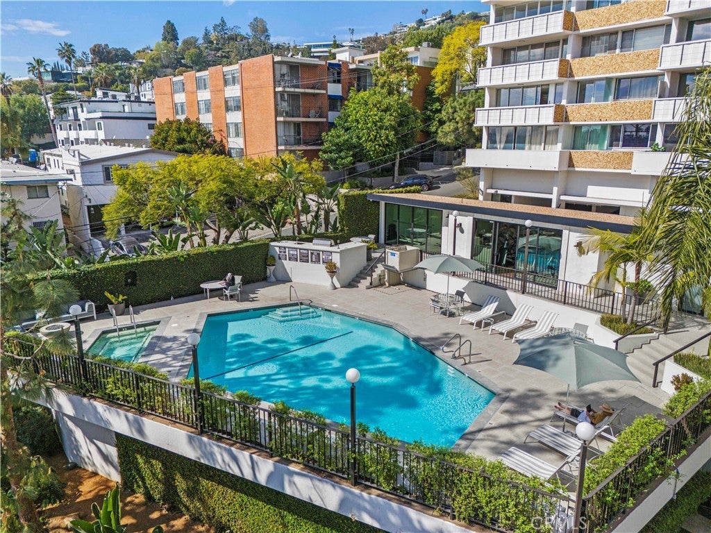 Welcome to a luxurious retreat in the heart of West Hollywood, located in the prestigious and iconic full service building, Shoreham Towers. Just steps away from the renowned Sunset Plaza, this rare corner unit contemporary condo features one spacious bedroom and a beautifully appointed bathroom. The open-plan living area is graced with exquisite architectural elements including high ceilings, built-in bookcases with storage, crown molding, hardwood floors, and a mix of sconces and recessed lighting throughout. All amenities are accentuated by the floor-to-ceiling windows that flood the space with gorgeous natural light. Embracing a beautiful “home feeling" with its smart layout, ample custom closet space, and backdrop of lush greenery, this unit offers the embodiment of comfort. While the fully appointed kitchen, that leads to a uniquely separate dining room area, provides the perfect backdrop for entertaining. Enjoy your morning coffee or evening cocktails in this private corner unit retreat and immerse yourself in the peaceful Hollywood Hills refuge. As a resident you’ll have access to the building's extensive services, such as 24-hour concierge with door man for added security, as well as 24/7 valet parking for both yourself and ease of welcoming guests. Bonus features of a private dog park, fitness center, newly remodeled pool plus jacuzzi with fire pit and barbecue, all contribute to the inherent value of what Shoreham has to offer. Additional conveniences include all utilities, cable, and internet being covered by the monthly HOA fees. Experience the pinnacle of glamorous urban living in this exclusive West Hollywood residence!