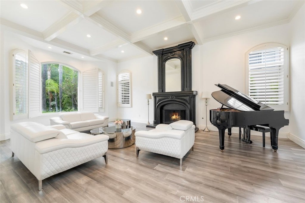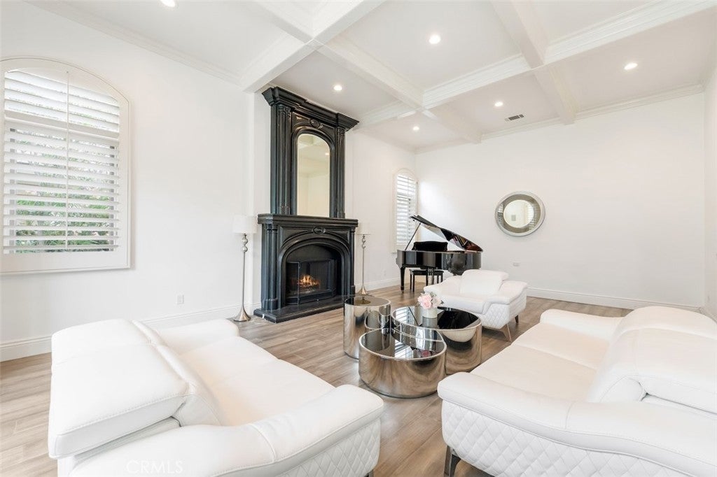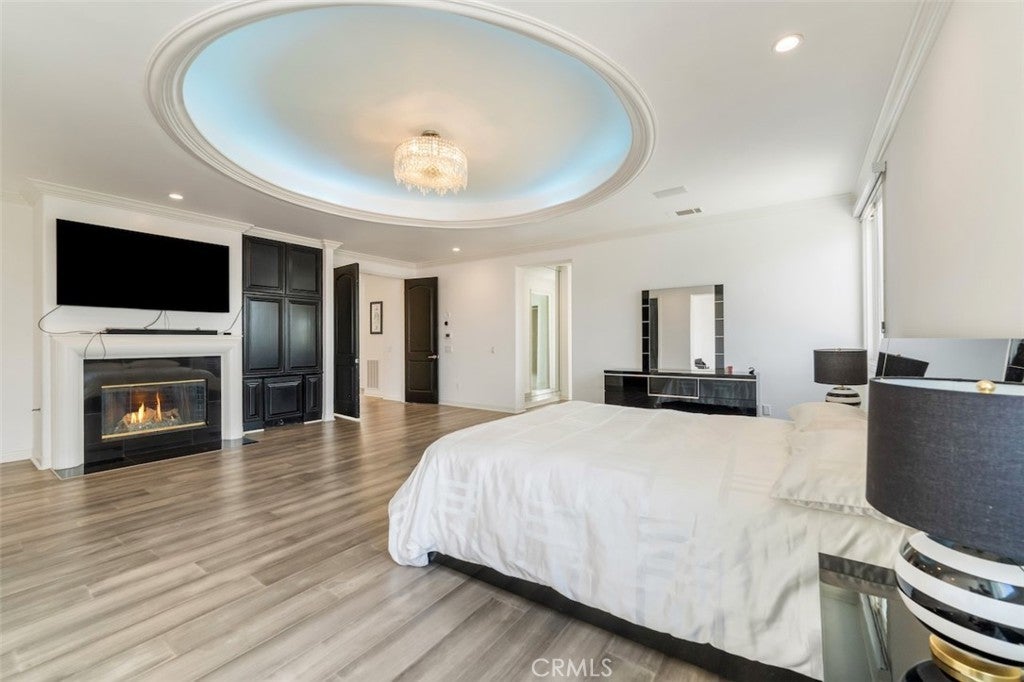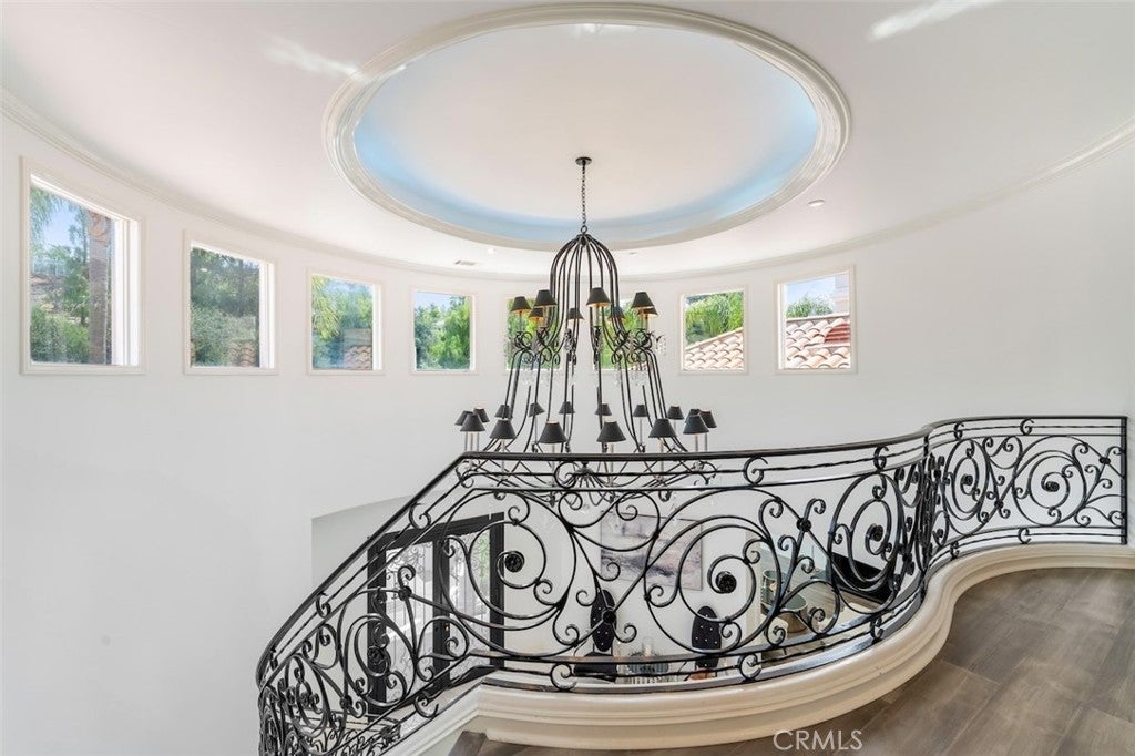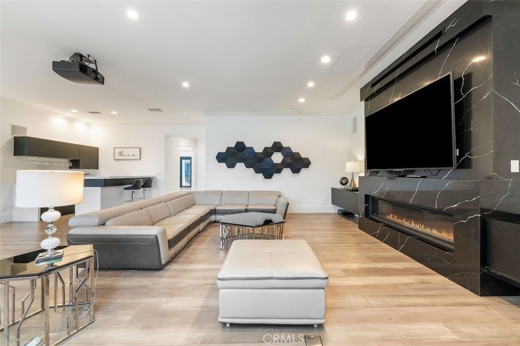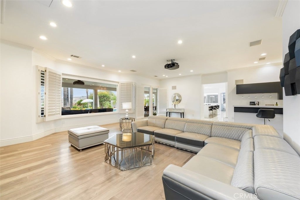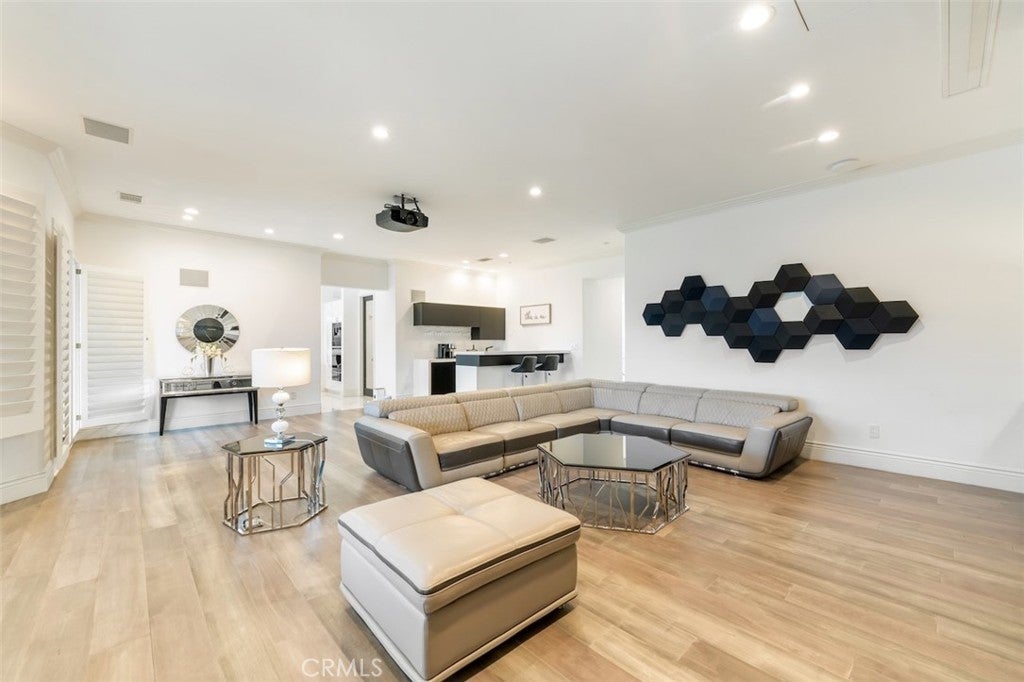 A rare opportunity to own an extraordinary 8,000+ sq ft luxury smart home set within a prestigious guard-gated Calabasas community. This fully upgraded residence showcases a dramatic grand entry with soaring ceilings, leading to a beautifully remodeled gourmet kitchen featuring Sub-Zero, Wolf, and Miele appliances, custom cabinetry, and a generous walk-in pantry. Designed for elevated modern living, the home is outfitted with Control4 home automation, LED lighting, Cat-6 wiring, and a whole-house sound system. The expansive family room is ideal for both entertaining and everyday comfort, complete with a fireplace, custom bar, built-in projector, and dual wine coolers—perfect for movie nights and gatherings. An oversized formal dining room comfortably accommodates 30+ guests. The luxurious primary suite serves as a private retreat with a sitting area, fireplace, dual walk-in closets, and a spa-inspired bath featuring a steam shower. Step outside to a resort-style backyard offering a saltwater pool, outdoor kitchen with BBQ, refrigerator, stove, and warming drawer, multiple covered seating areas, and an outdoor projector—creating the ultimate indoor-outdoor lifestyle. Additional highlights include a soundproof podcast studio and a temperature-controlled wine room capable of housing over 100 bottles. A true entertainer’s dream located in one of Calabasas’ most desirable gated neighborhoods.