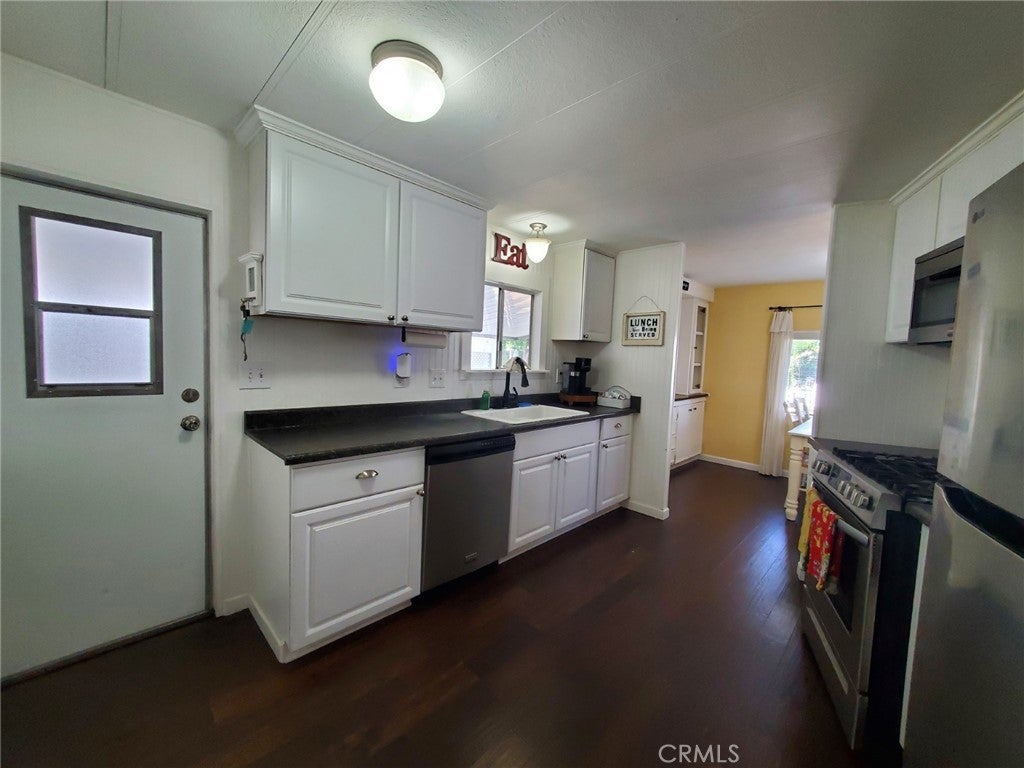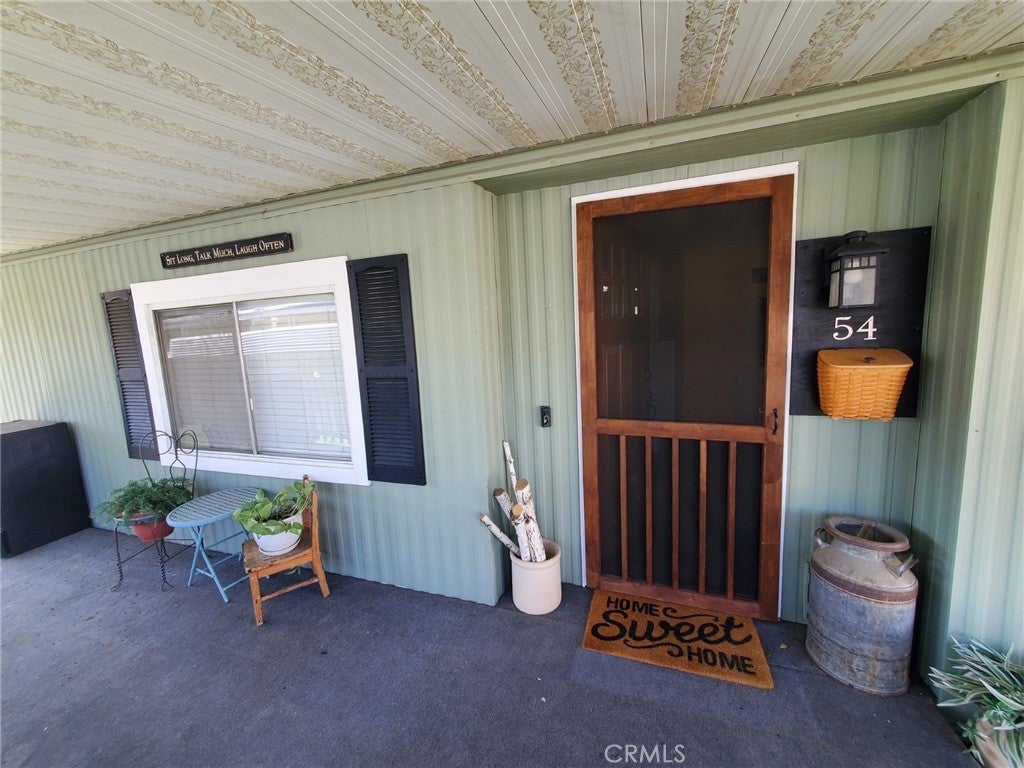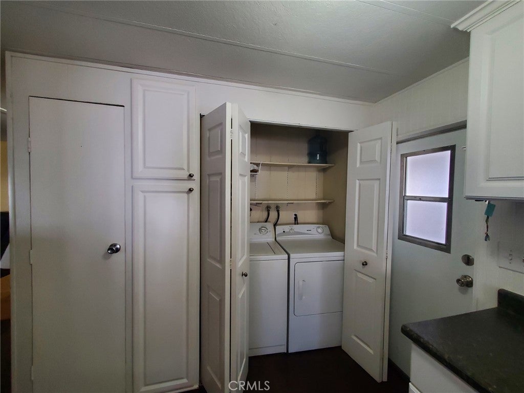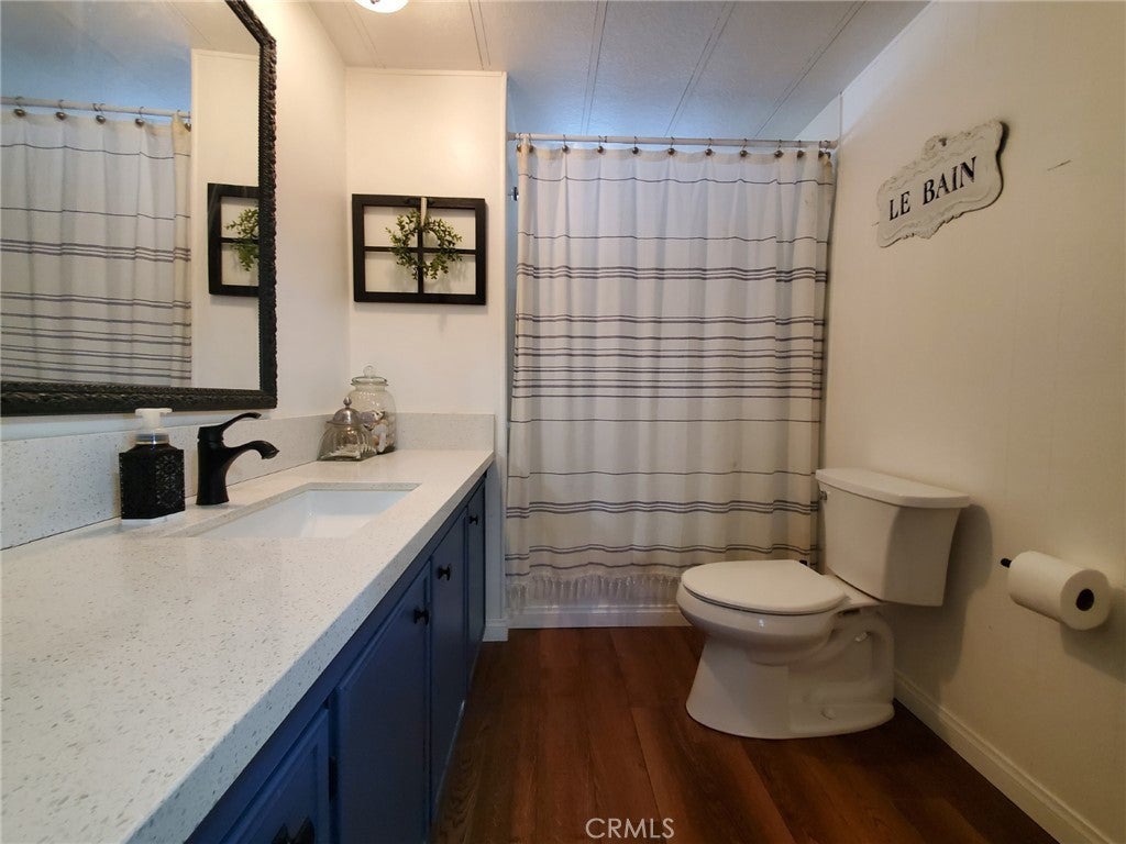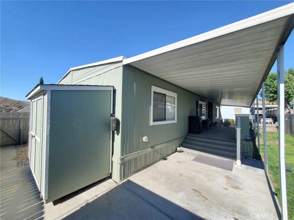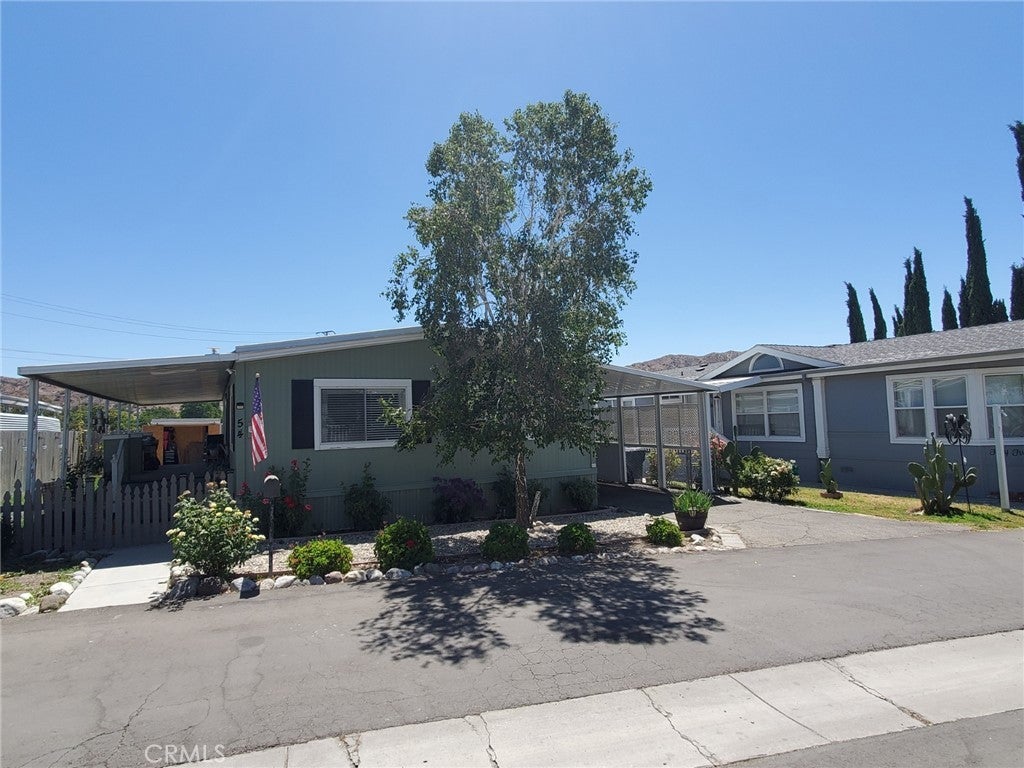 Welcome to your new home, this 2 bedroom 2 bath home has a country farmhouse feel, in a quiet family park with low space rent of only $977 per month. This home features a large open living room with laminate flooring and window blinds which allow lots of natural light. The dining room has a built in white hutch and chandelier. The kitchen has lots of storage and a pantry, stainless steel appliances, which include a dishwasher, refrigerator, oven/stovetop and built in microwave, wainscoting backsplash and a garbage disposal. The full size washer and dryer are located in a closet in the kitchen. The den is off the kitchen and living room and has the same laminate flooring as the living room, dining room and kitchen as well as a built in storage area by the front door. The main bathroom has a new blue vanity with stone countertop and a shower/tub combination. The bedroom can accommodate a queen size bed and has a large walk in closet. The primary bedroom has a large closet, plantation shutters on the window and a private bathroom. The private bathroom has planation shutters, a large vanity with stone countertop, a walk in shower with white subway tile surround. This home has an enclosed yard with a picket fence, 2 sheds, a large inviting front porch, laminate flooring throughout, a craftsman style front door and a wooden screen door. The seller has photos of all renovations done to the property, so you can see the transformation! Schedule an appointment today to see this amazing home!