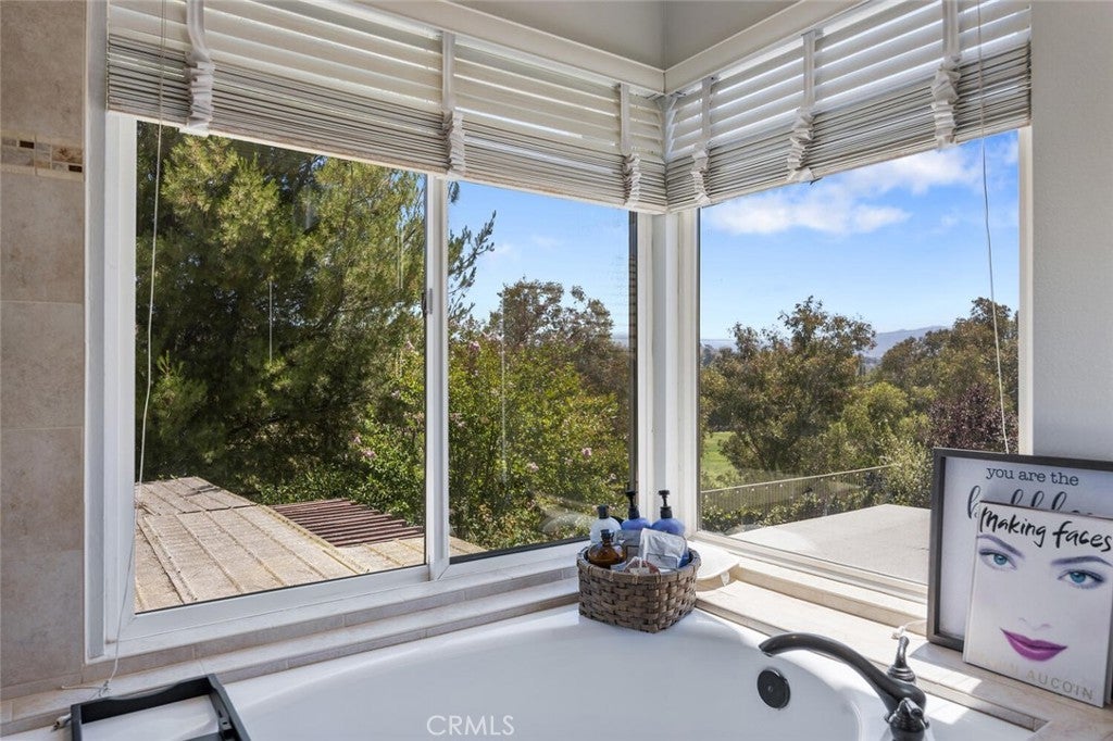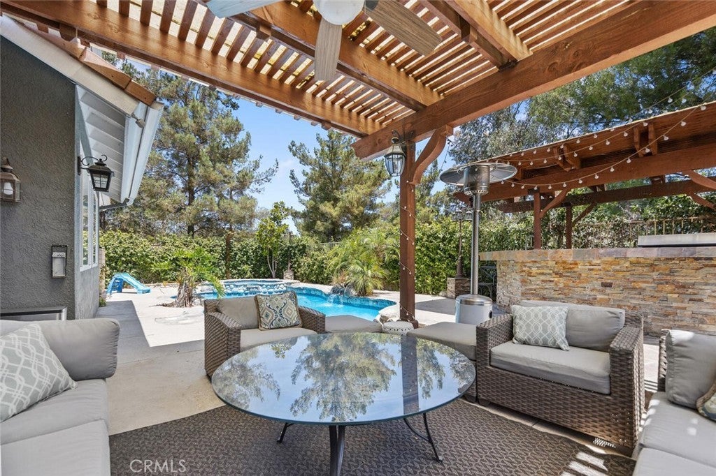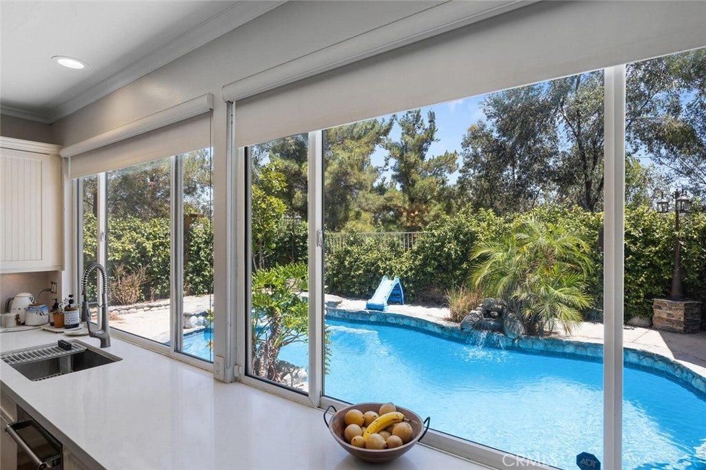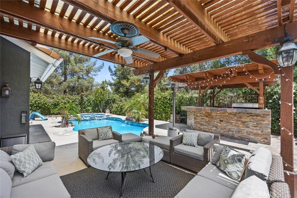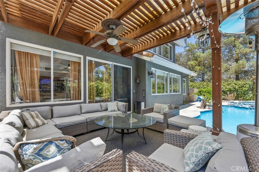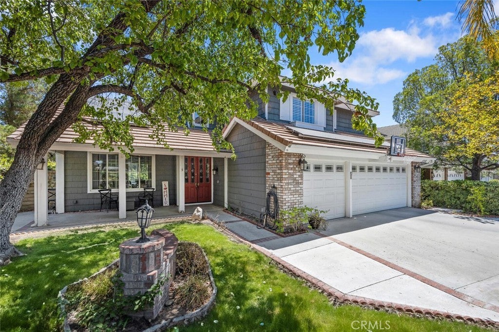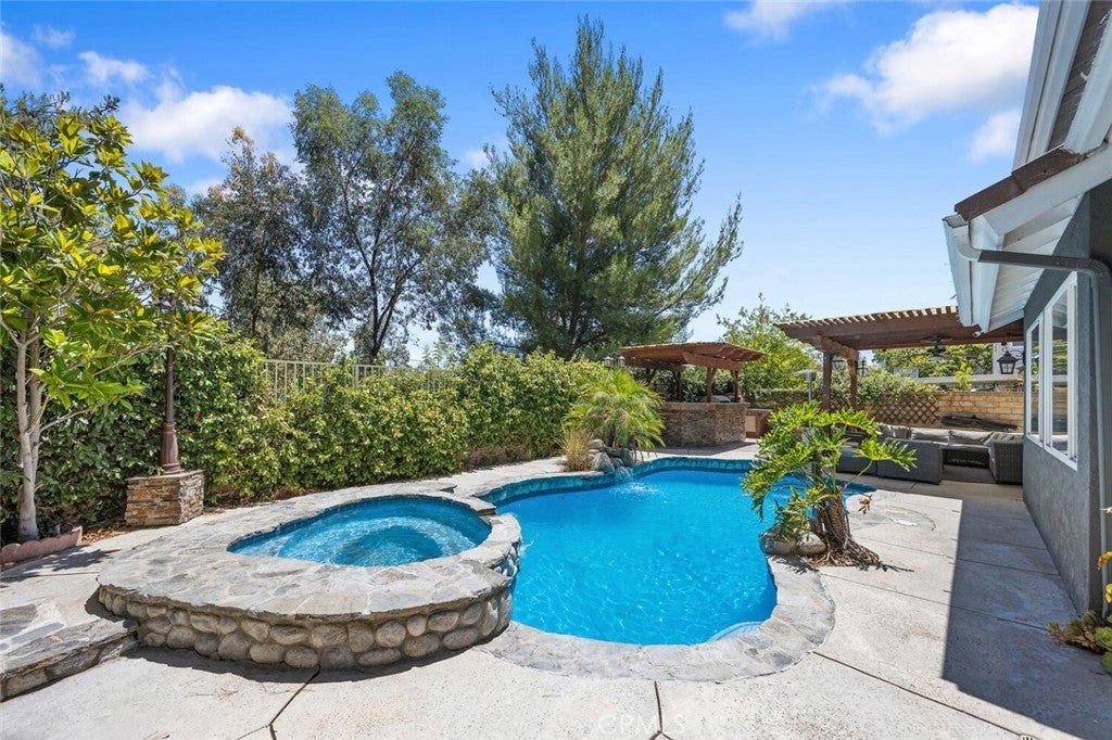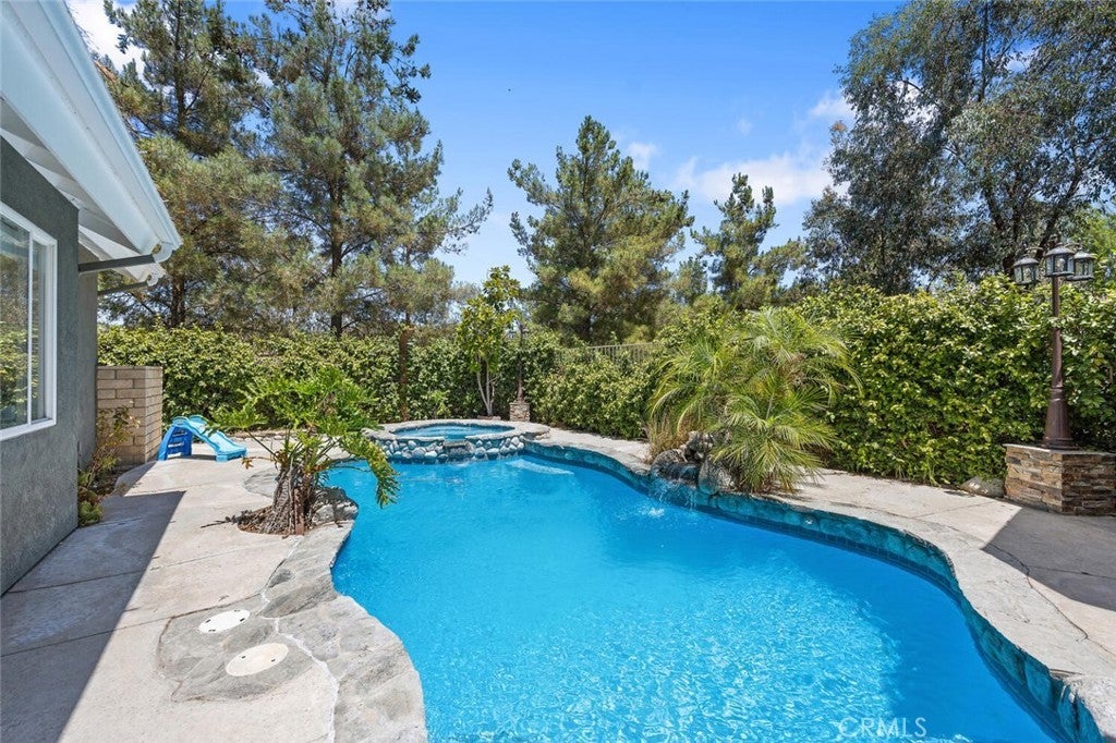 Exquisite Northbridge POOL, SPA and VIEW home on sweeping Flag Lot at the top of a tree lined cul de sac street with OWNED SOLAR! This beautifully upgraded 2 story home features 4 bedrooms and 3 full bathrooms (one on the MAIN FLOOR) plus a 3-car garage with tons of storage and epoxy coated flooring! The soaring cathedral ceilings, regal winding staircase and plethora of picture windows offers abundant natural light leaving a lasting impression upon entering this beautiful home! With neutral, wide luxury vinyl plank flooring, recessed lighting and designer finishes this Valencia home is truly move-in ready! The light and bright living room flows seamlessly into the formal dining area, highlighted by large windows and an elegant chandelier! The heart of the home is the beautifully upgraded kitchen featuring a gorgeous, quartz topped center island with bar seating, stainless steel appliances and glass cabinetry accents! The kitchen conveniently opens to the spacious and inviting family room complete with brick fireplace, wood mantle, crown molding, and ceiling fan! This main living space overlooks the sparkling swimming pool, covered patio and built-in BBQ! The main floor also boasts a huge DOWNSTAIRS BEDROOM AND BATH! Tastefully upgraded with pebble like flooring, glass accents and designer lighting! Adjacent you will find the convenient laundry room complete with utility sink and extra storage leading to the 3 car garage! The entertainer’s backyard is a true retreat with a sparkling pool and spa, cascading waterfall, covered patio, and a stone bar top complete with built-in BBQ, refrigerator, and brick pizza oven/smoker! With no rear neighbors, this space offers exceptional privacy for gatherings and outdoor fun! Upstairs, the expansive primary suite boasts a double-sided fireplace, pool views, media niche, walk-in closet, and a spa-like bathroom with dual vanities, pedestal tub and a floor-to-ceiling glass shower! The 2 additional secondary upstairs bedrooms share a spacious hall bathroom with dual sinks, granite countertop, and tub/shower combo! Additional highlights include OWNED SOLAR, upgraded lighting, and neutral palette that lends to any style! Valencia Northbridge offers some of the best community amenities in town including pools, tennis courts, playgrounds, and paseos! A short distance to Valencia High School, The Paseo Club, Santa Clarita Trail System and Wolf Creek Brewery! This is a home you will cherish for years to come!
