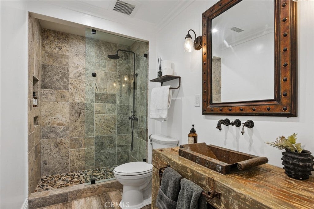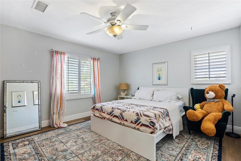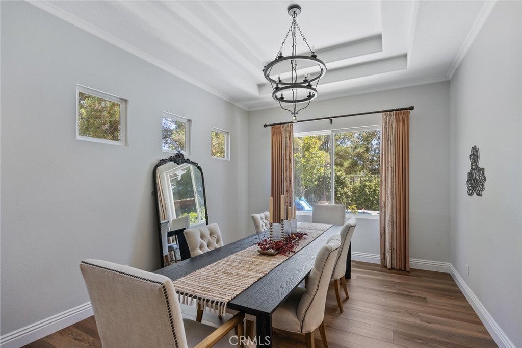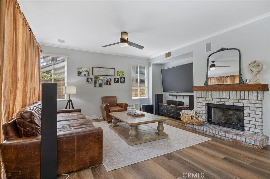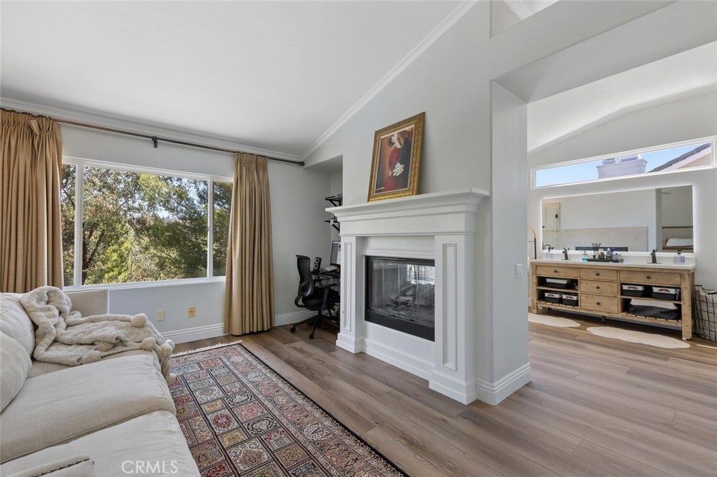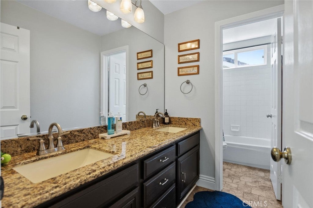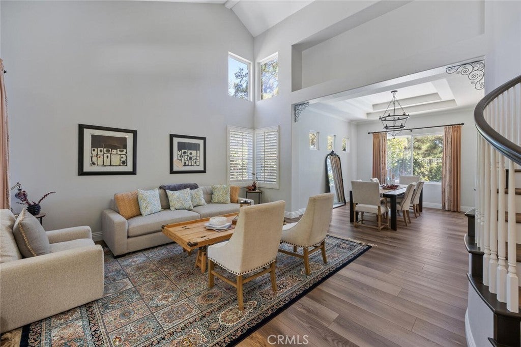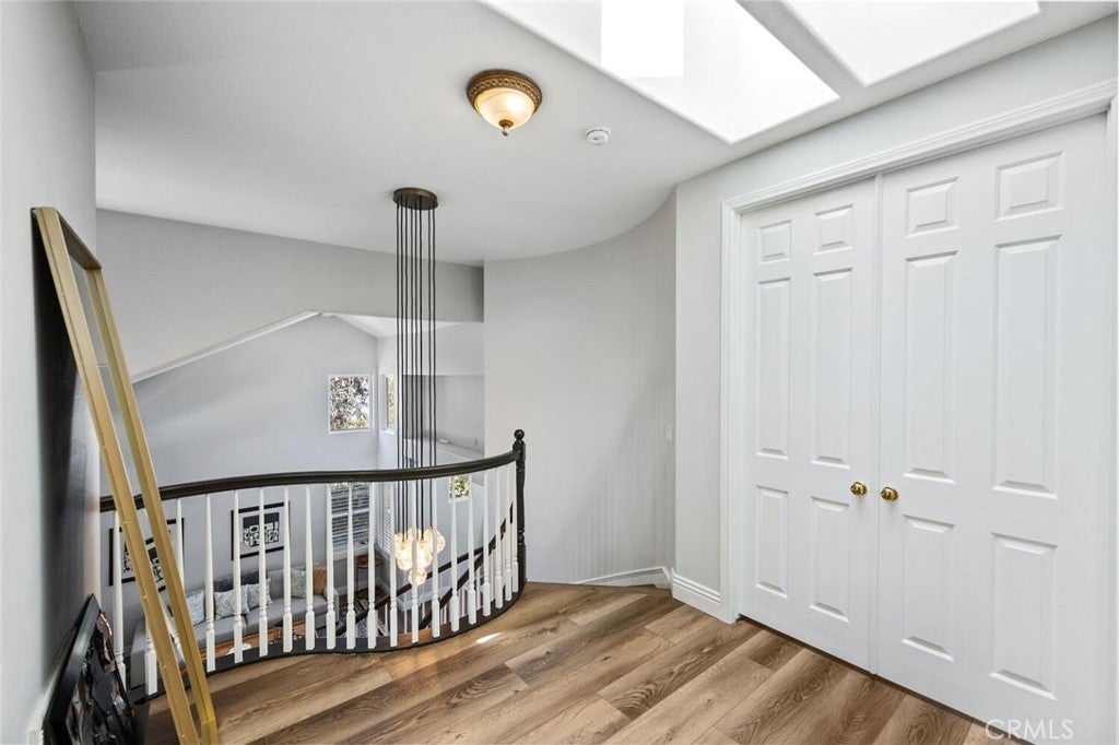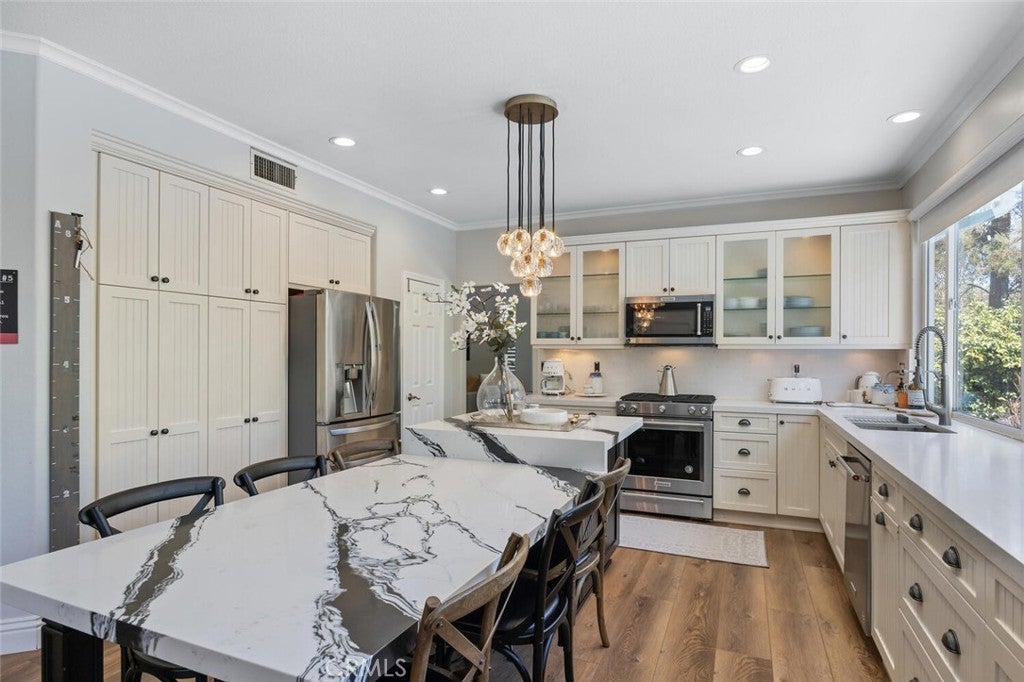 Exquisite Northbridge POOL, SPA and VIEW home on sweeping Flag Lot at the top of a tree lined cul de sac street with OWNED SOLAR! This beautifully upgraded 2 story home features 4 bedrooms and 3 full bathrooms (one on the MAIN FLOOR) plus a 3-car garage with tons of storage and epoxy coated flooring! The soaring cathedral ceilings, regal winding staircase and plethora of picture windows offers abundant natural light leaving a lasting impression upon entering this beautiful home! With neutral, wide luxury vinyl plank flooring, recessed lighting and designer finishes this Valencia home is truly move-in ready! The light and bright living room flows seamlessly into the formal dining area, highlighted by large windows and an elegant chandelier! The heart of the home is the beautifully upgraded kitchen featuring a gorgeous, quartz topped center island with bar seating, stainless steel appliances and glass cabinetry accents! The kitchen conveniently opens to the spacious and inviting family room complete with brick fireplace, wood mantle, crown molding, and ceiling fan! This main living space overlooks the sparkling swimming pool, covered patio and built-in BBQ! The main floor also boasts a huge DOWNSTAIRS BEDROOM AND BATH! Tastefully upgraded with pebble like flooring, glass accents and designer lighting! Adjacent you will find the convenient laundry room complete with utility sink and extra storage leading to the 3 car garage! The entertainer’s backyard is a true retreat with a sparkling pool and spa, cascading waterfall, covered patio, and a stone bar top complete with built-in BBQ, refrigerator, and brick pizza oven/smoker! With no rear neighbors, this space offers exceptional privacy for gatherings and outdoor fun! Upstairs, the expansive primary suite boasts a double-sided fireplace, pool views, media niche, walk-in closet, and a spa-like bathroom with dual vanities, pedestal tub and a floor-to-ceiling glass shower! The 2 additional secondary upstairs bedrooms share a spacious hall bathroom with dual sinks, granite countertop, and tub/shower combo! Additional highlights include OWNED SOLAR, upgraded lighting, and neutral palette that lends to any style! Valencia Northbridge offers some of the best community amenities in town including pools, tennis courts, playgrounds, and paseos! A short distance to Valencia High School, The Paseo Club, Santa Clarita Trail System and Wolf Creek Brewery! This is a home you will cherish for years to come!