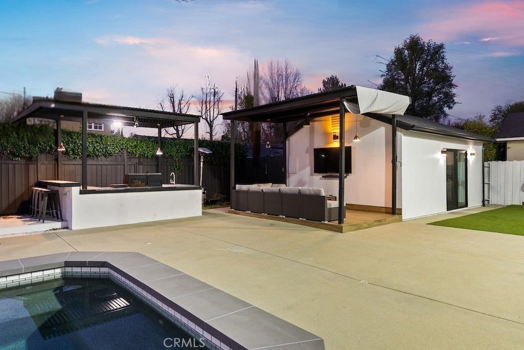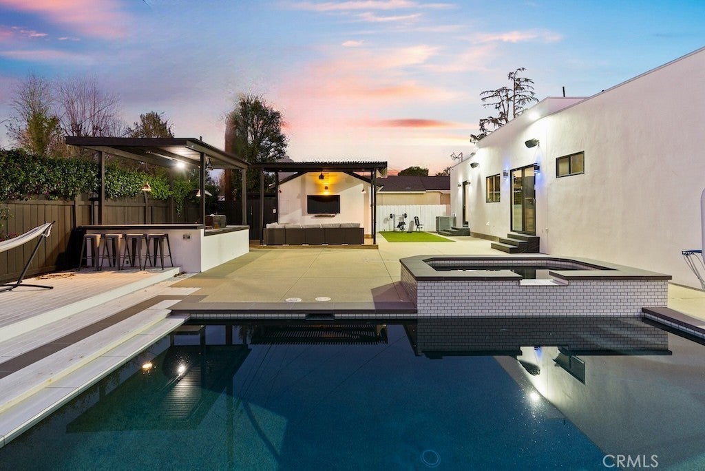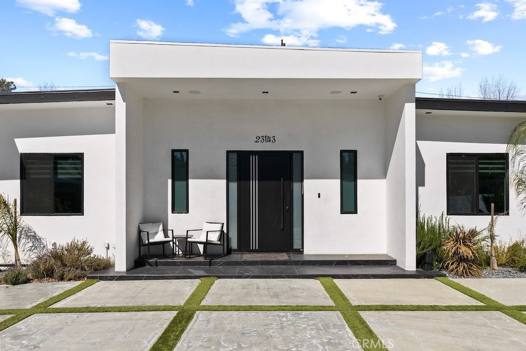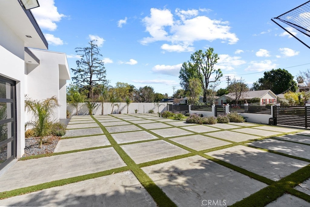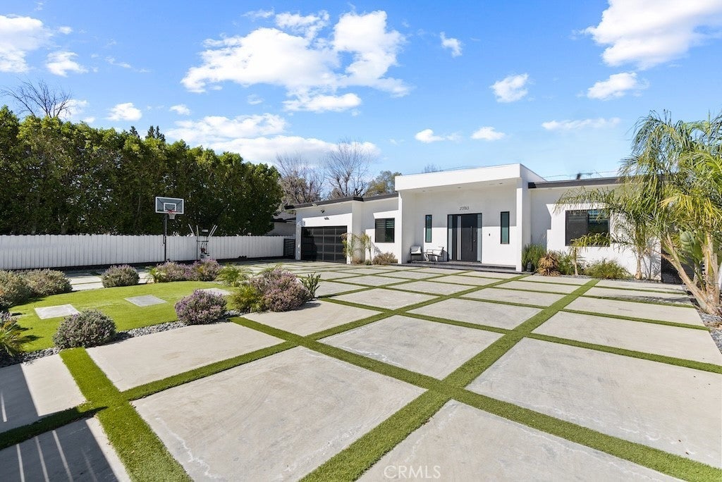 Welcome to this unique one-story modern masterpiece in the highly sought-after Walnut Acres Adjacent neighborhood of Woodland Hills. Fully rebuilt and reimagined, this expansive 3,300 sq. ft. estate offers 5 bedrooms and 4 bathrooms, including a detached guest house with 1 bedroom and 1 bathroom.From the moment you arrive, the electrical double-gated entry and circular driveway set the tone for privacy and elegance, providing parking for multiple vehicles, an RV, or even a boat. Step inside to a light-filled open floor plan with 14' soaring ceilings, bespoke Wisconsin hardwood accent walls, custom built-ins blended with soft LED lighting, and a striking modern fireplace that together create a warm yet sophisticated atmosphere. The chef’s kitchen is designed for both beauty and function, complete with soft-close custom cabinetry, quartz countertops, a large island with breakfast bar, double sink, pot filler, high-end appliances, and plenty of workspace. The dining area, overlooking the backyard, creates the perfect setting for intimate dinners or lively gatherings. The primary suite is a serene retreat featuring vaulted ceilings, a massive walk-in closet, and a spa-inspired en-suite with dual faucets and a walk-in shower. Two spacious bedrooms share a modern Jack & Jill bath, while a junior suite offers its own walk-in closet & full bath. The detached guest house is a true bonus with its own fireplace, walk-in closet, and full bath, ideal for guests, a home office, gym, or rental income. Step outside to your private backyard paradise, a resort-style escape with a sparkling saltwater pool & spa, raised tanning deck, and covered patio with ceiling fan for year-round comfort. Host unforgettable gatherings with the outdoor kitchen, complete with double BBQ grill and built-in bar, then unwind by the sleek fire pit or dine al fresco in the covered lounge, all surrounded by lush, mature landscaping. Additional features include luxury tile flooring throughout, custom window blinds, and smart home system that controls interior and exterior sound, security cameras, intercom, central A/C with individual climate control for each bedroom to maximize comfort and energy efficiency. Perfectly located just one block north of Ventura Blvd and minutes from the 101 freeway, this home offers easy access to The Calabasas Commons, premier shopping, fine dining, and award-winning schools. This is your opportunity to own one of Woodland Hills’ finest modern estates.