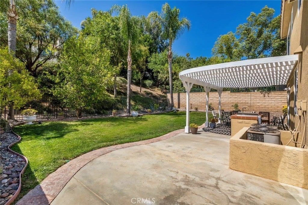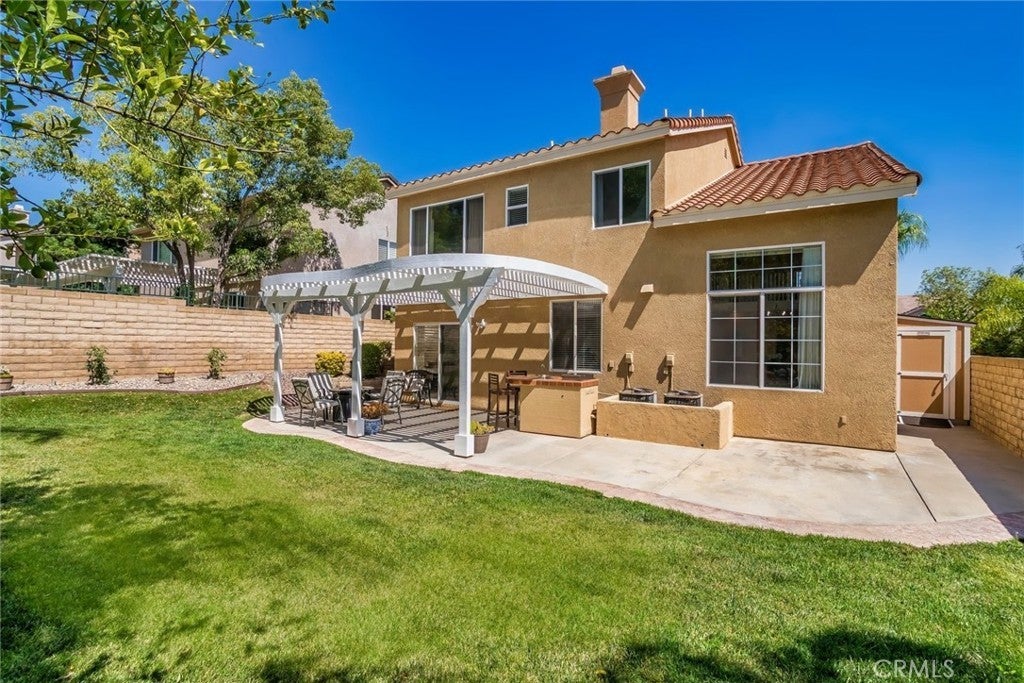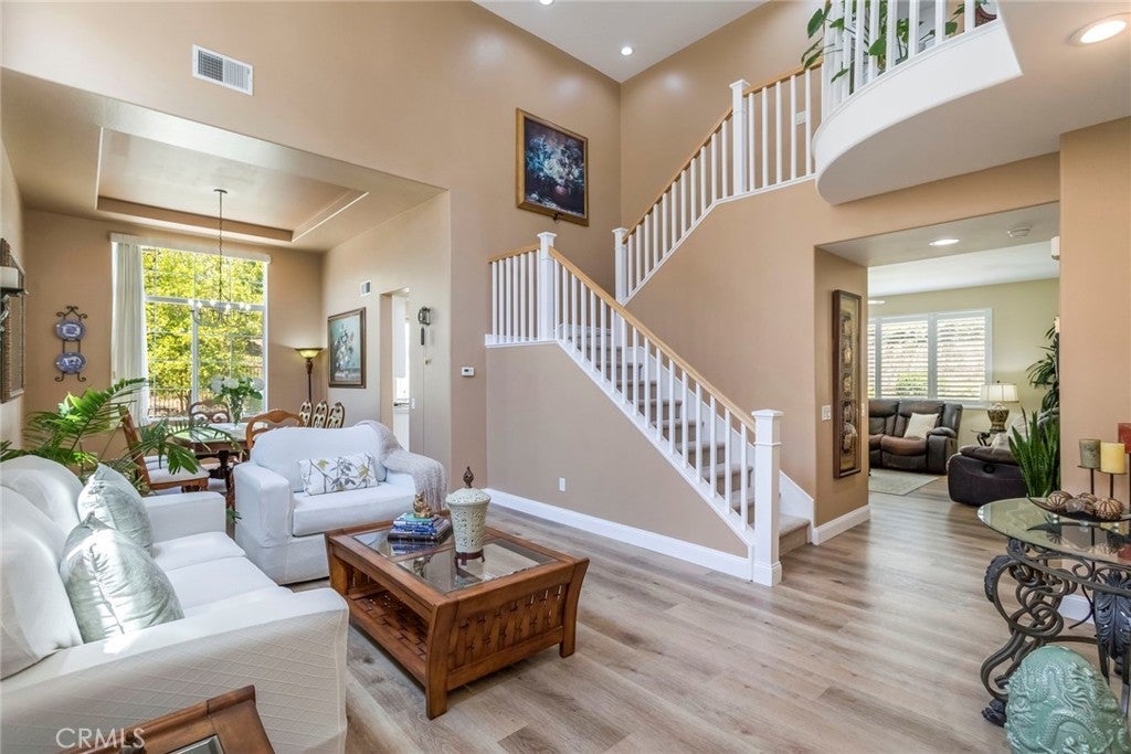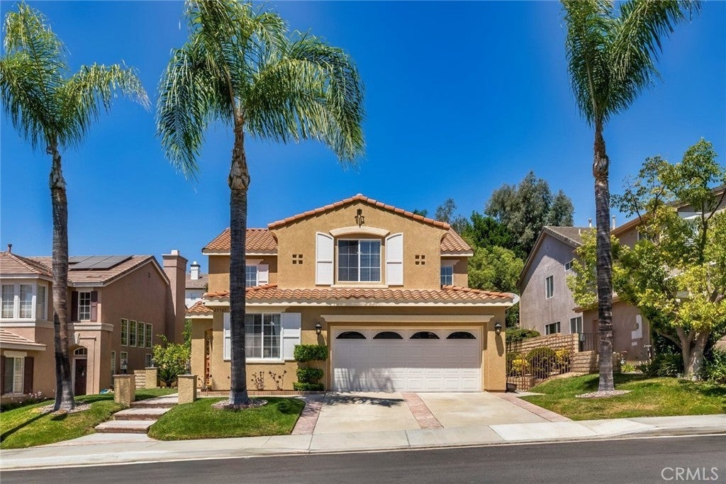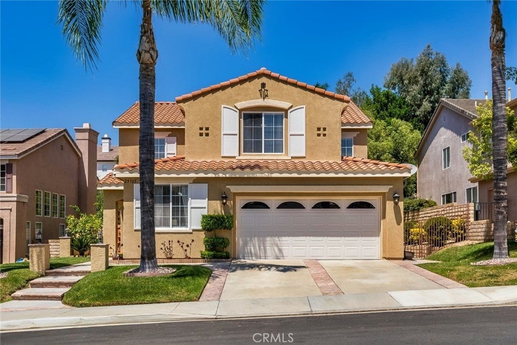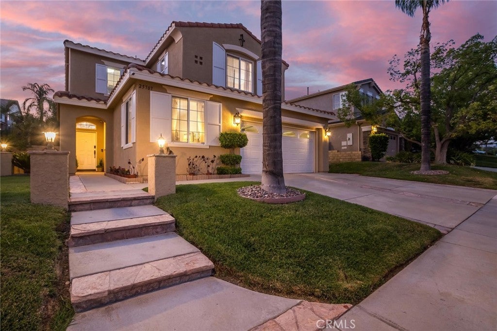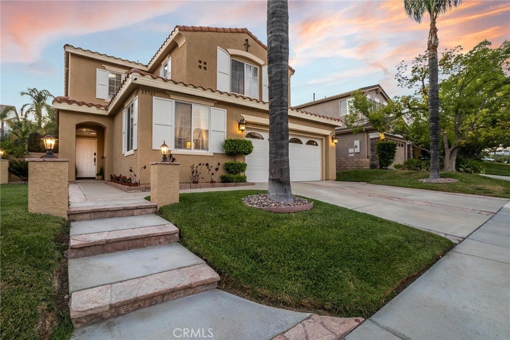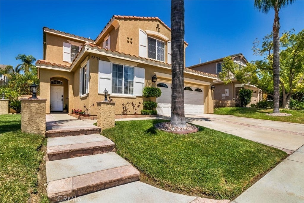 Welcome to this stunning Executive Home, ideally located in the highly sought-after upper Stevenson Ranch neighborhood on a picturesque street that radiates pride of ownership. From the moment you arrive, you will immediately notice the picture-perfect curb appeal adorned with meticulously manicured landscaping and featuring beautiful mature palms. Spanning nearly 3,000 square feet, this home boasts four bedrooms (one down,) den/bonus room, three baths, formal living and dining areas, family room, loft, spacious laundry room with sink, and upgrades throughout. As you walk in you will notice the soaring cathedral ceilings, beautiful LVP wide plank flooring in Canyon Oak, inviting paint selections, newer carpeting upstairs, and several windows flooding the space with natural light. The home's chef will love the updated kitchen including a wealth of cabinetry, stainless appliances, stylish quartz counters with seamless backsplash, spacious center island, and a convenient breakfast nook. The dining room is highlighted by a gorgeous chandelier, tray ceiling and views of the backyard. Entertain with ease in the large family room with a cozy fireplace and easy access to your entertainer's backyard. Upstairs, you will find the luxurious primary suite that is generous in size, includes a large walk in closet and enjoys views of the surrounding landscape. Enjoy the private ensuite bath, complete with dual sinks, an oversized soaking tub, and a separate walk in shower. The secondary bedrooms are generously sized and offer ample closet space. The hall bath features dual sinks and a private shower room. The loft is perfect for a home office or additional relaxation area. Step outside and discover an entertainer's space featuring a large covered patio, BBQ island and a huge grassy area for play. Don't miss the additional upgrades of a newer water heater, outdoor shed and newer exterior paint! Minutes away from shopping, Richard Rioux Park, award-winning schools, and effortless freeway access! This home embraces the essence of Southern California living at its best!