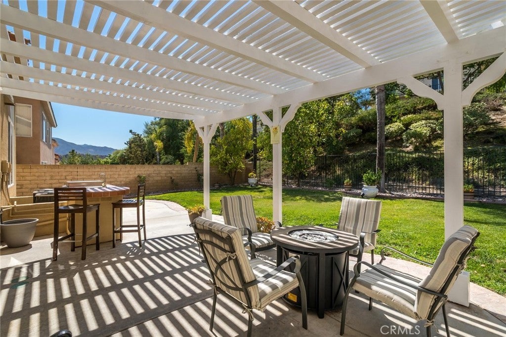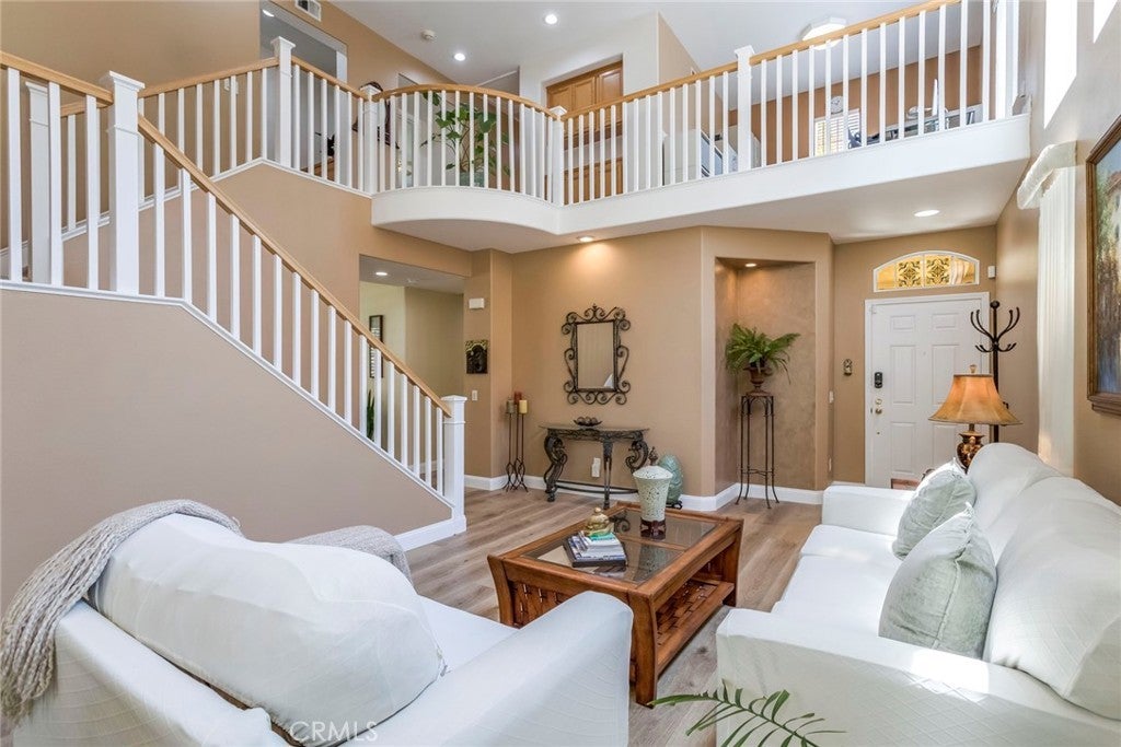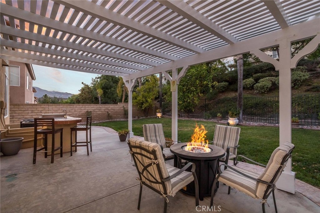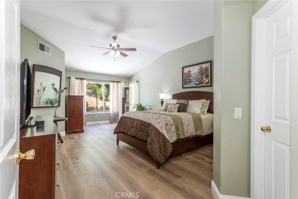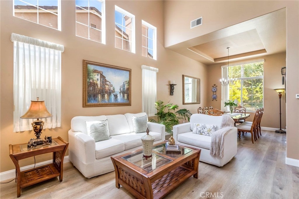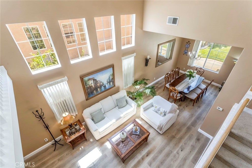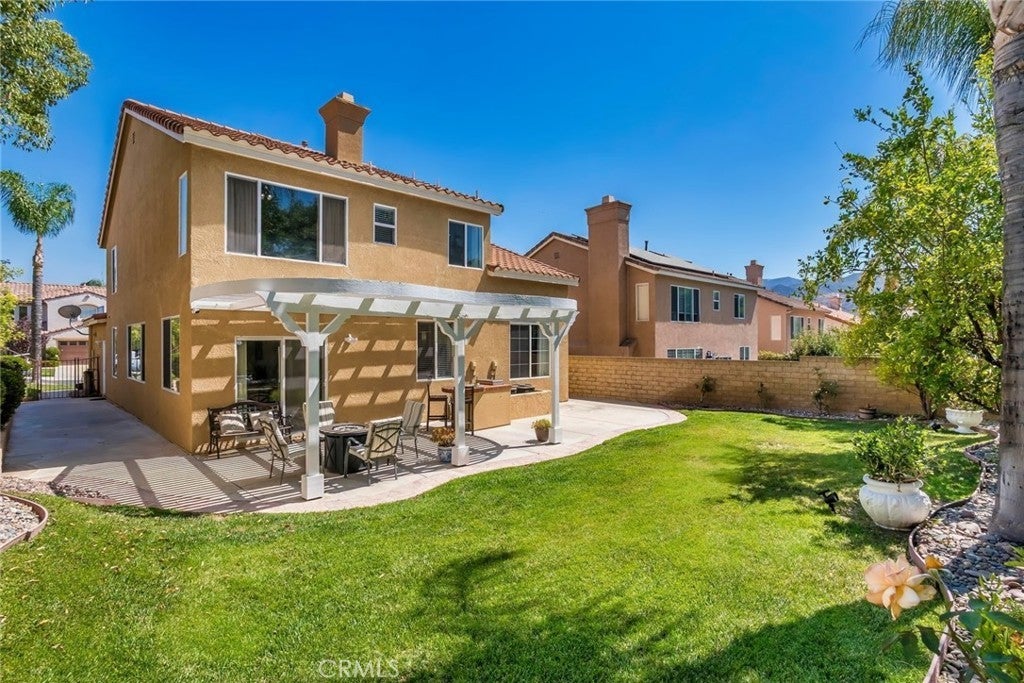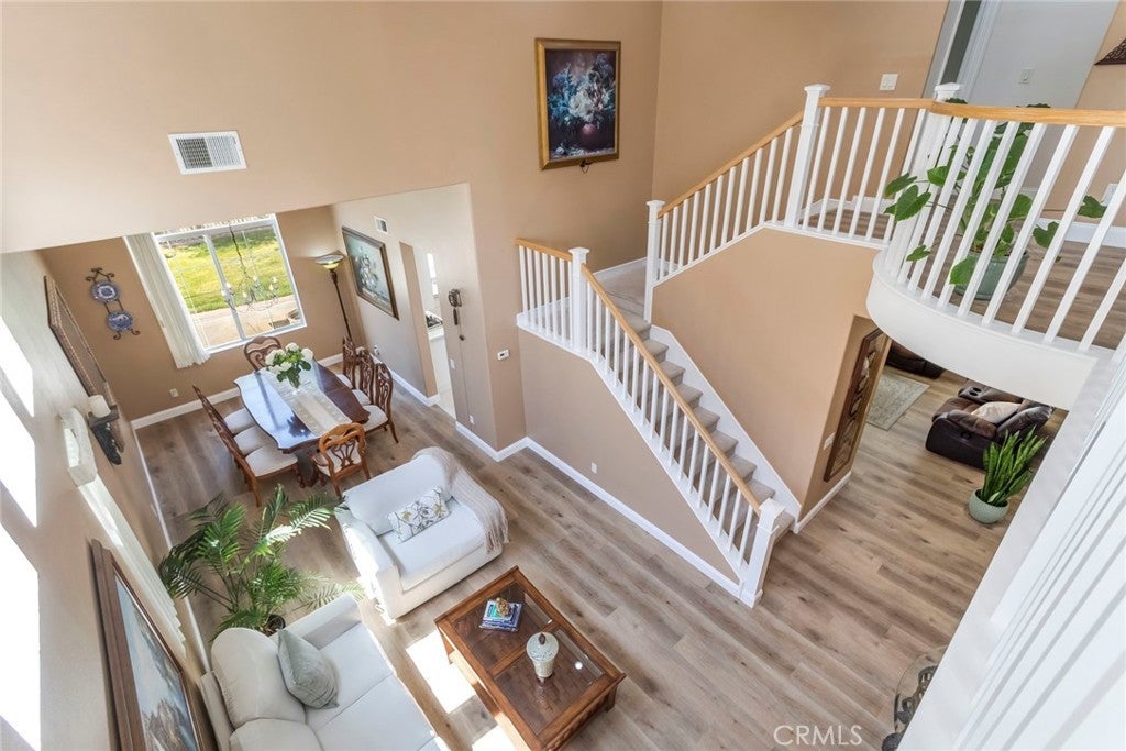 Welcome to this stunning Executive Home, ideally located in the highly sought-after upper Stevenson Ranch neighborhood on a picturesque street that radiates pride of ownership. From the moment you arrive, you will immediately notice the picture-perfect curb appeal adorned with meticulously manicured landscaping and featuring beautiful mature palms. Spanning nearly 3,000 square feet, this home boasts four bedrooms (one down,) den/bonus room, three baths, formal living and dining areas, family room, loft, spacious laundry room with sink, and upgrades throughout. As you walk in you will notice the soaring cathedral ceilings, beautiful LVP wide plank flooring in Canyon Oak, inviting paint selections, newer carpeting upstairs, and several windows flooding the space with natural light. The home's chef will love the updated kitchen including a wealth of cabinetry, stainless appliances, stylish quartz counters with seamless backsplash, spacious center island, and a convenient breakfast nook. The dining room is highlighted by a gorgeous chandelier, tray ceiling and views of the backyard. Entertain with ease in the large family room with a cozy fireplace and easy access to your entertainer's backyard. Upstairs, you will find the luxurious primary suite that is generous in size, includes a large walk in closet and enjoys views of the surrounding landscape. Enjoy the private ensuite bath, complete with dual sinks, an oversized soaking tub, and a separate walk in shower. The secondary bedrooms are generously sized and offer ample closet space. The hall bath features dual sinks and a private shower room. The loft is perfect for a home office or additional relaxation area. Step outside and discover an entertainer's space featuring a large covered patio, BBQ island and a huge grassy area for play. Don't miss the additional upgrades of a newer water heater, outdoor shed and newer exterior paint! Minutes away from shopping, Richard Rioux Park, award-winning schools, and effortless freeway access! This home embraces the essence of Southern California living at its best!