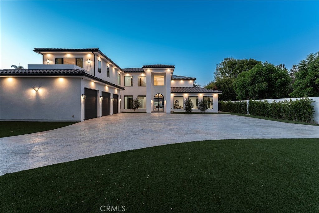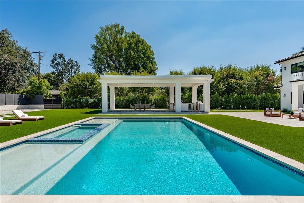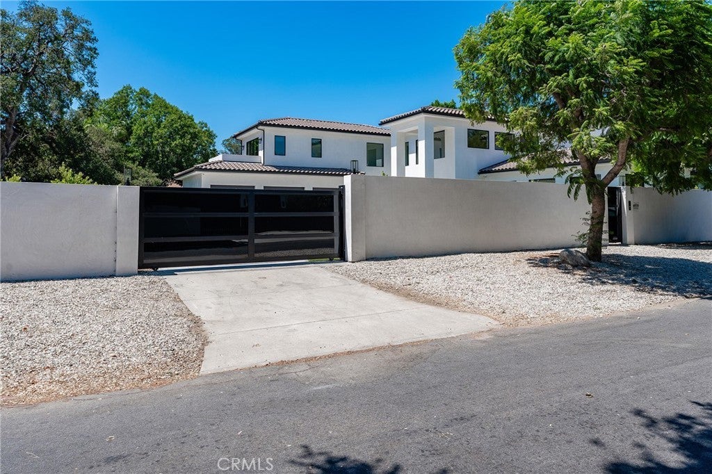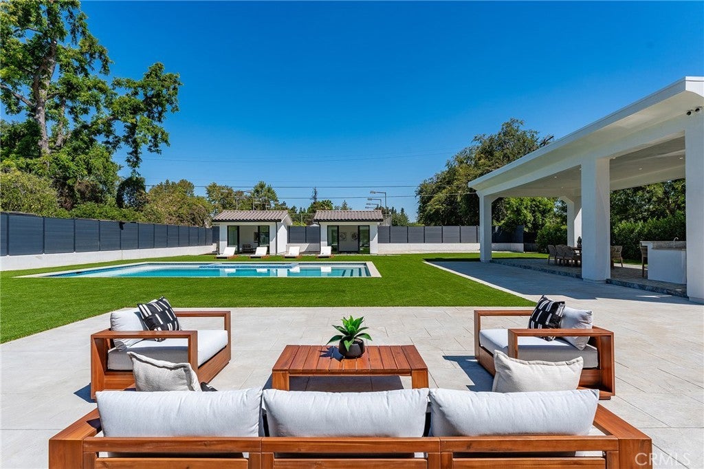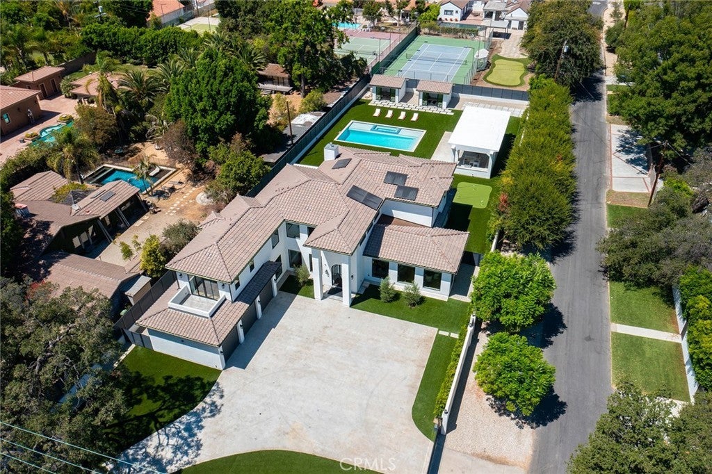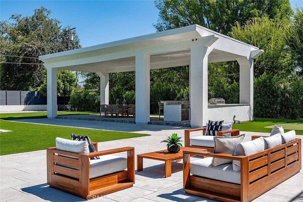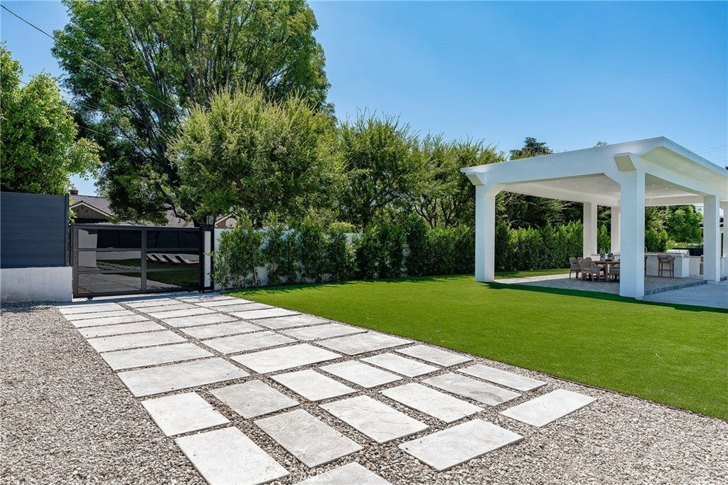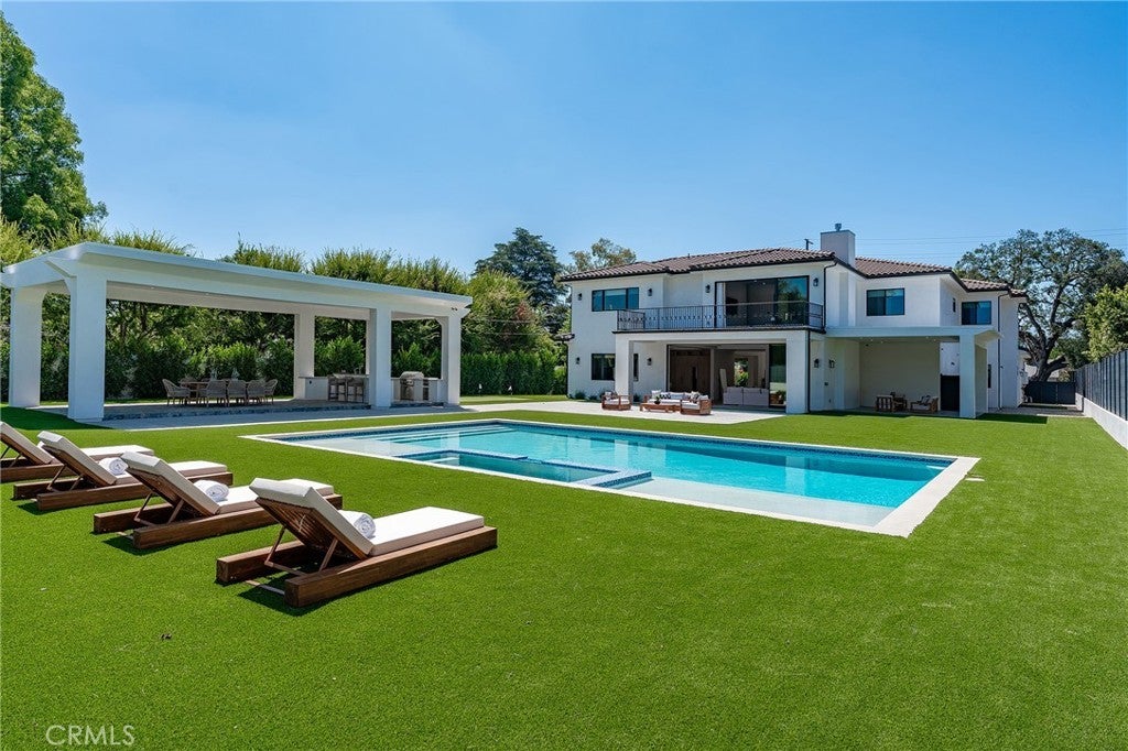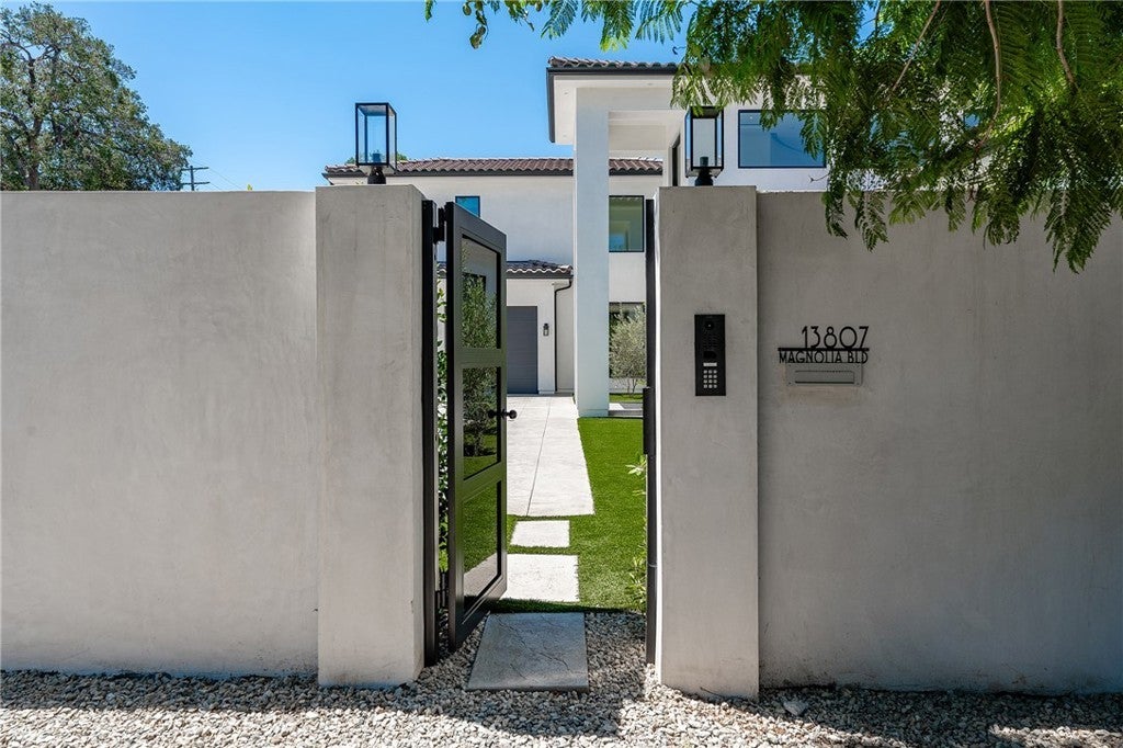 Welcome to this stunning newly constructed estate in the exclusive Weddington Estates enclave of Sherman Oaks. Set behind private gates on a sprawling corner lot, this home blends luxury, comfort, and smart living with effortless style. Featuring 5 spacious bedrooms and 4.5 luxurious bathrooms, the residence showcases white oak flooring, sophisticated smart home technology, and exceptional indoor-outdoor flow—perfect for entertaining. Step through custom arched iron double doors into a light-filled, open-concept layout designed for grand living. The formal living and dining areas unite into a dramatic great room with expansive windows that flood the space with natural light—ideal for both hosting and relaxing. The gourmet chef’s kitchen is equipped with top-of-the-line appliances, a built-in Thermador refrigerator and freezer, full-size wine fridge, and a butler’s pantry. It opens to the inviting family room, complete with a sleek fireplace and oversized Fleetwood pocket sliding doors that lead to your private, resort-style backyard. The main level also includes a media room, custom wet bar with wine fridge, and a versatile guest suite with en-suite bath—perfect for visitors or in-laws. Upstairs, you'll find three generously sized bedrooms, including two en-suites with custom walk-in closets. The primary suite is a luxurious retreat with pocket doors that open to a private balcony, his and hers walk-in closets with built-ins, and a spa-inspired bathroom with dual vanities, an oversized soaking tub, and a double rainfall shower. A conveniently located upstairs laundry room adds functionality. Outdoors, the resort-style backyard is designed for unforgettable gatherings. Enjoy a sparkling pool and spa, two enclosed recreation cabanas, a putting green, and two covered patios—including an oversized space with a fully equipped outdoor kitchen and BBQ area for the ultimate open-air lounge experience. This backyard is a true entertainer’s dream. Smart home automation powered by Control4 provides seamless control of lighting, integrated sound system including sonos, climate, pool, spa, and more—delivering unparalleled comfort, convenience, and modern luxury throughout. This estate also caters to the car enthusiast, featuring a spacious 3-car garage, three separate gated entrances, and an expansive driveway that offers ample parking for multiple vehicles.