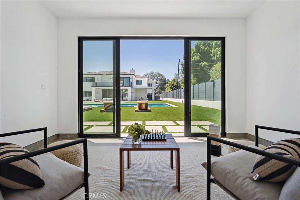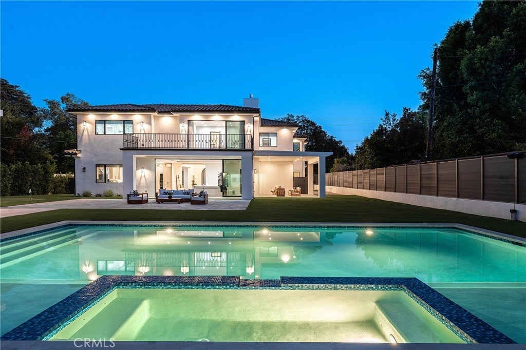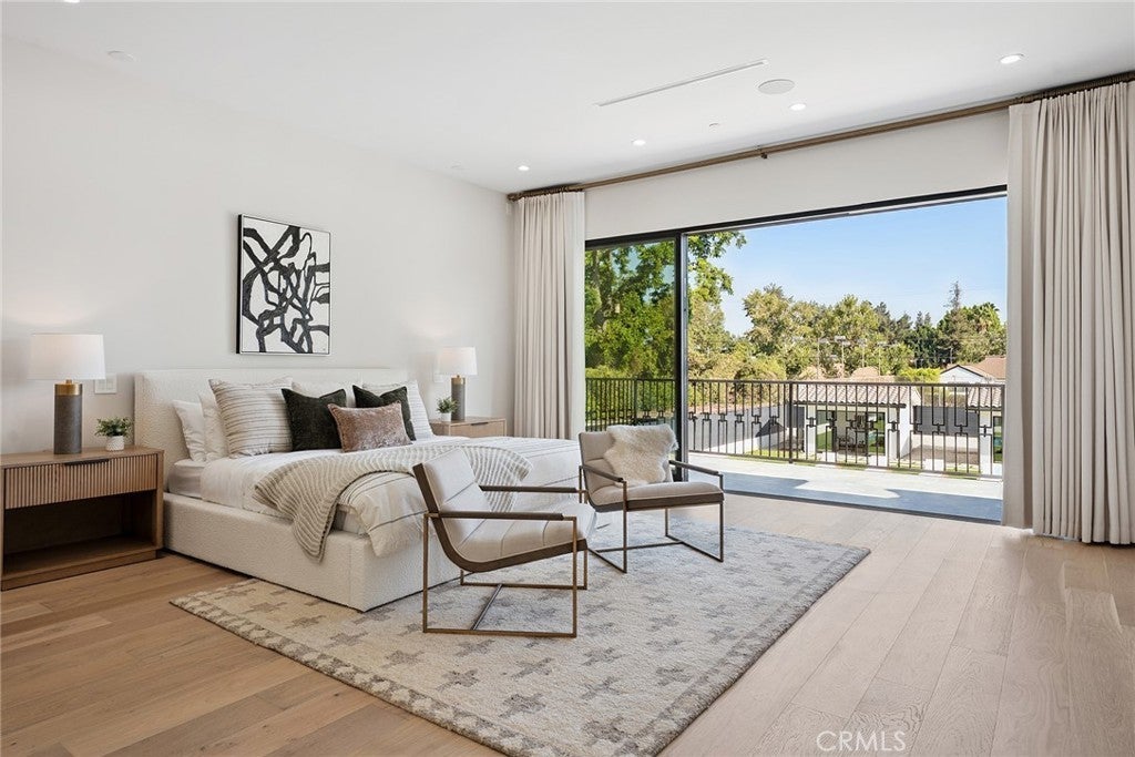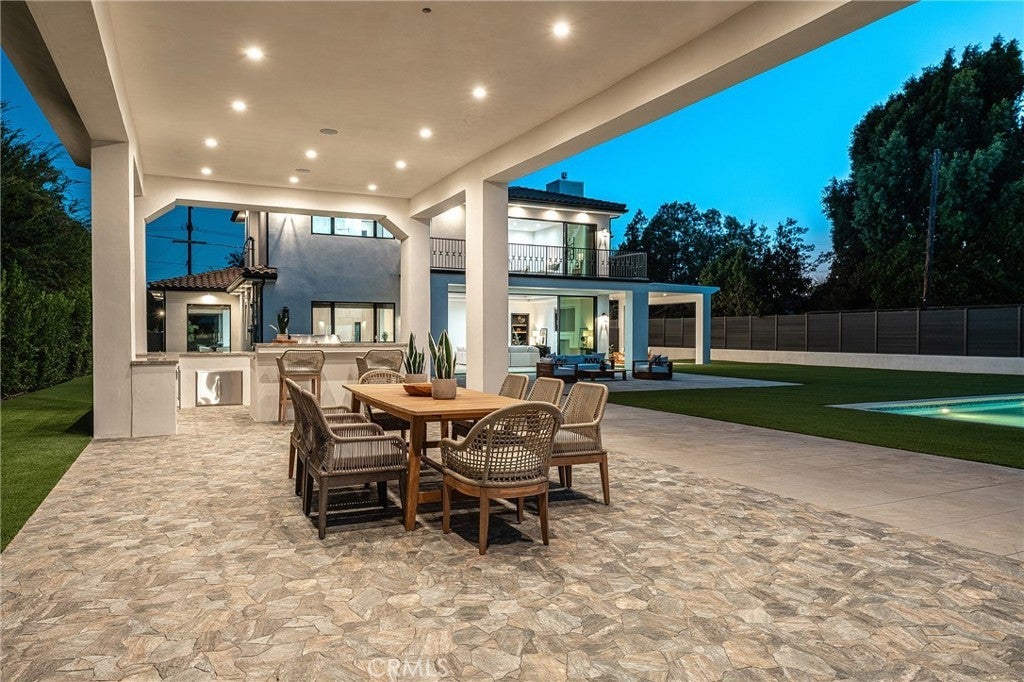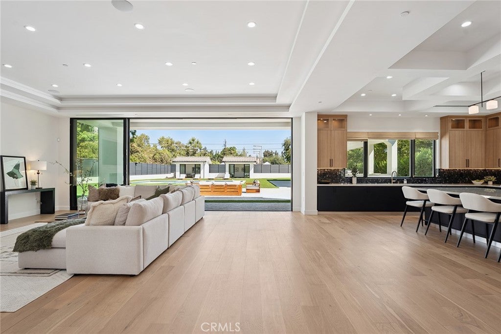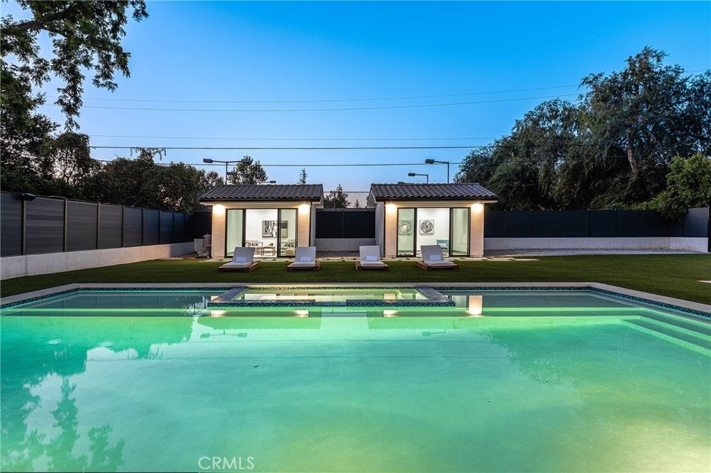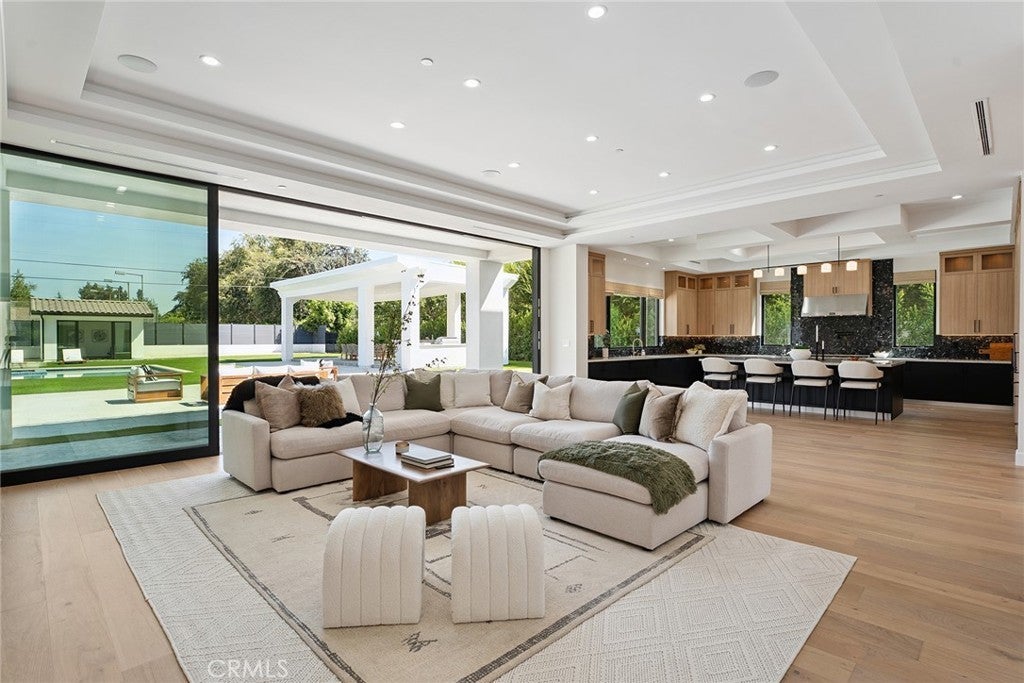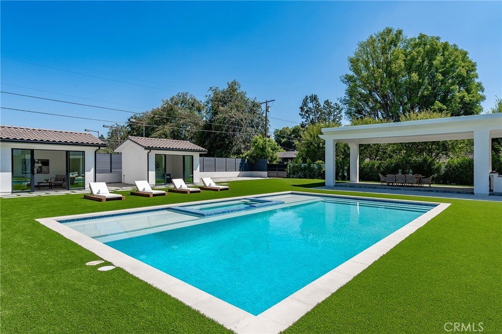 Welcome to this stunning newly constructed estate in the exclusive Weddington Estates enclave of Sherman Oaks. Set behind private gates on a sprawling corner lot, this home blends luxury, comfort, and smart living with effortless style. Featuring 5 spacious bedrooms and 4.5 luxurious bathrooms, the residence showcases white oak flooring, sophisticated smart home technology, and exceptional indoor-outdoor flow—perfect for entertaining. Step through custom arched iron double doors into a light-filled, open-concept layout designed for grand living. The formal living and dining areas unite into a dramatic great room with expansive windows that flood the space with natural light—ideal for both hosting and relaxing. The gourmet chef’s kitchen is equipped with top-of-the-line appliances, a built-in Thermador refrigerator and freezer, full-size wine fridge, and a butler’s pantry. It opens to the inviting family room, complete with a sleek fireplace and oversized Fleetwood pocket sliding doors that lead to your private, resort-style backyard. The main level also includes a media room, custom wet bar with wine fridge, and a versatile guest suite with en-suite bath—perfect for visitors or in-laws. Upstairs, you'll find three generously sized bedrooms, including two en-suites with custom walk-in closets. The primary suite is a luxurious retreat with pocket doors that open to a private balcony, his and hers walk-in closets with built-ins, and a spa-inspired bathroom with dual vanities, an oversized soaking tub, and a double rainfall shower. A conveniently located upstairs laundry room adds functionality. Outdoors, the resort-style backyard is designed for unforgettable gatherings. Enjoy a sparkling pool and spa, two enclosed recreation cabanas, a putting green, and two covered patios—including an oversized space with a fully equipped outdoor kitchen and BBQ area for the ultimate open-air lounge experience. This backyard is a true entertainer’s dream. Smart home automation powered by Control4 provides seamless control of lighting, integrated sound system including sonos, climate, pool, spa, and more—delivering unparalleled comfort, convenience, and modern luxury throughout. This estate also caters to the car enthusiast, featuring a spacious 3-car garage, three separate gated entrances, and an expansive driveway that offers ample parking for multiple vehicles.
