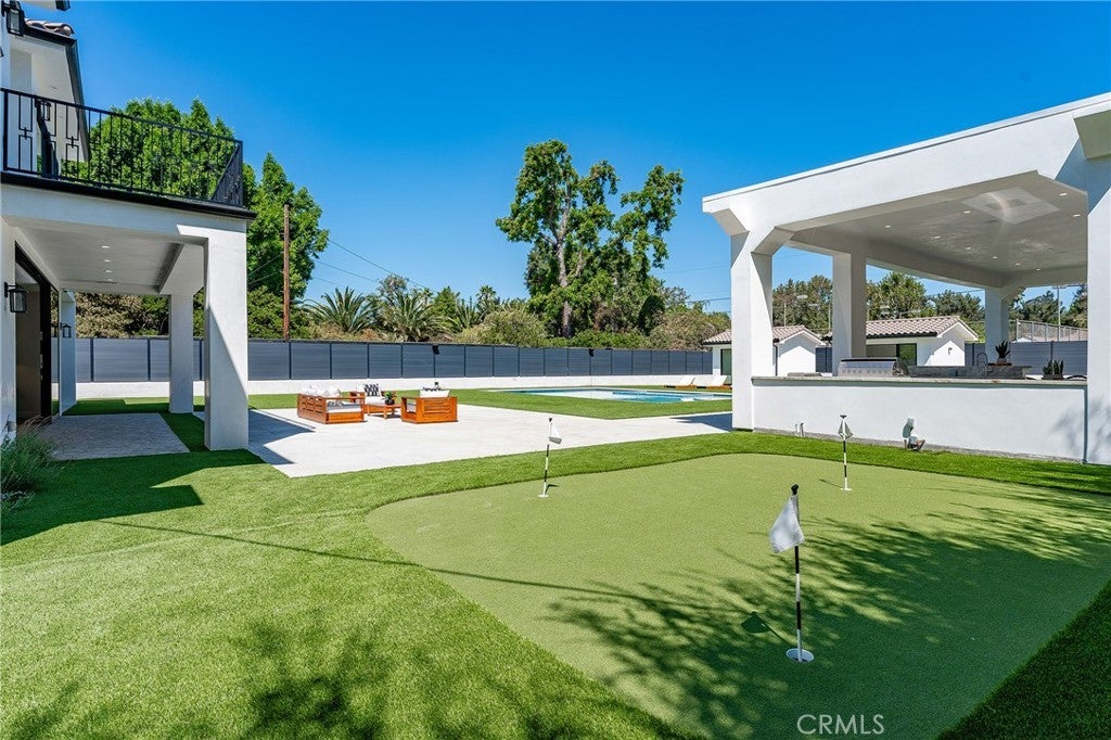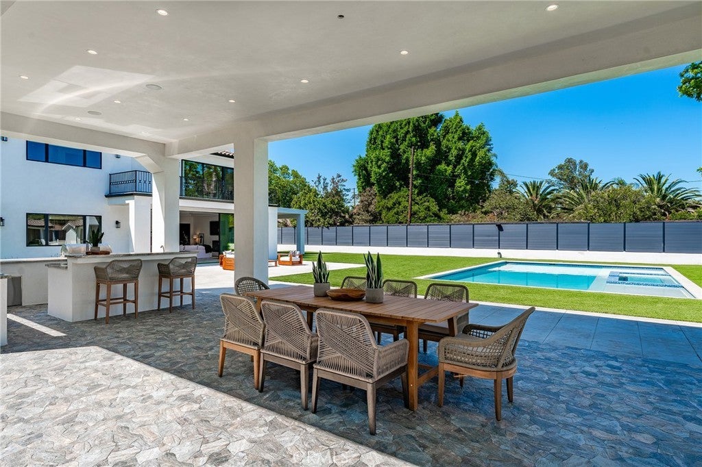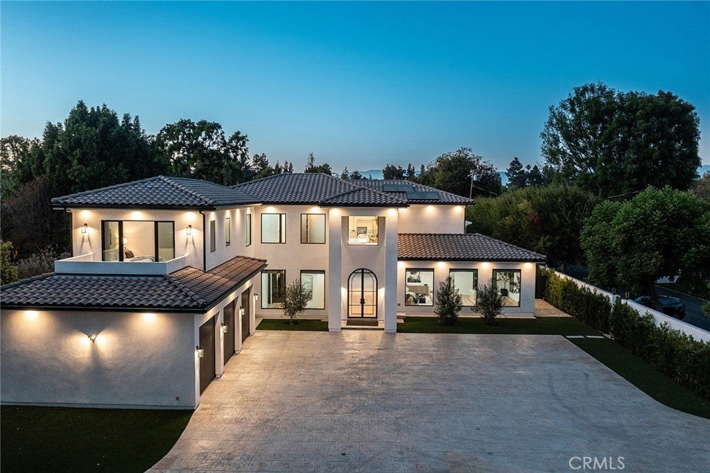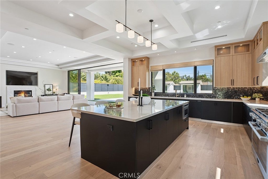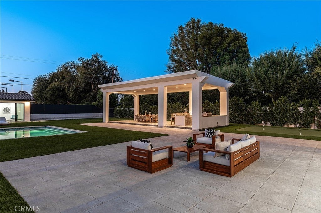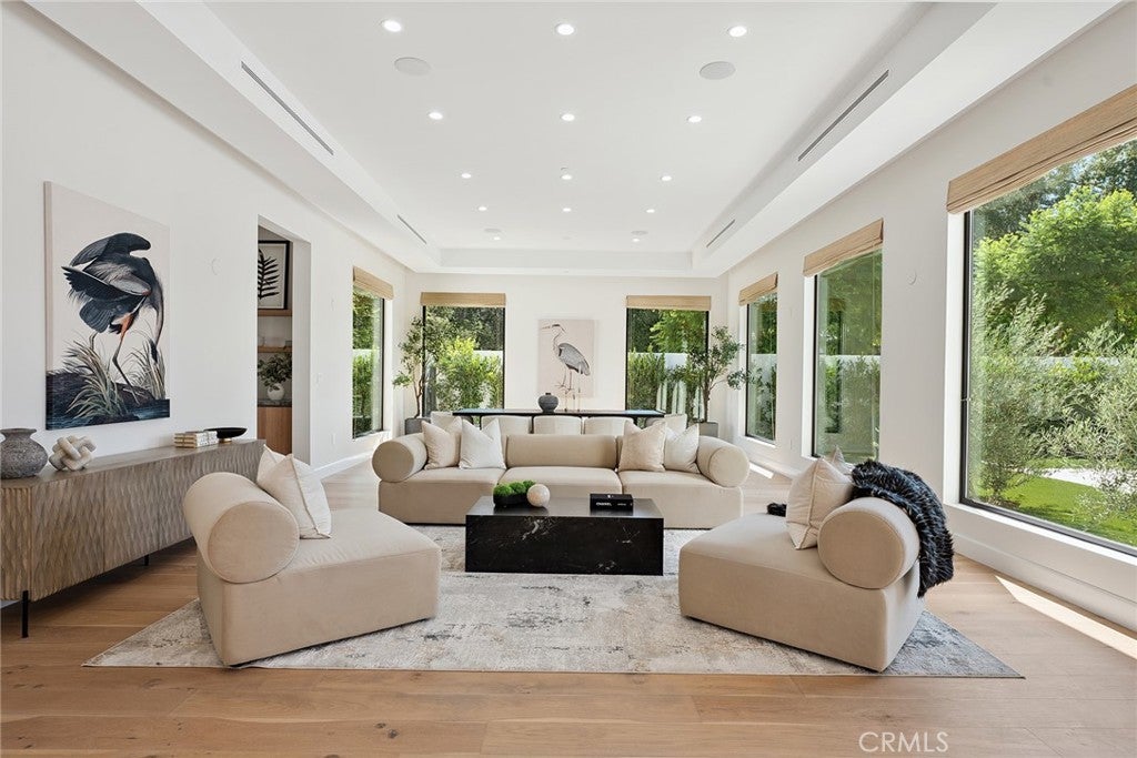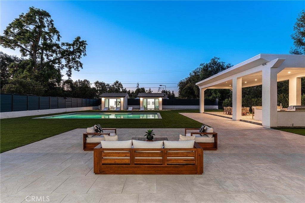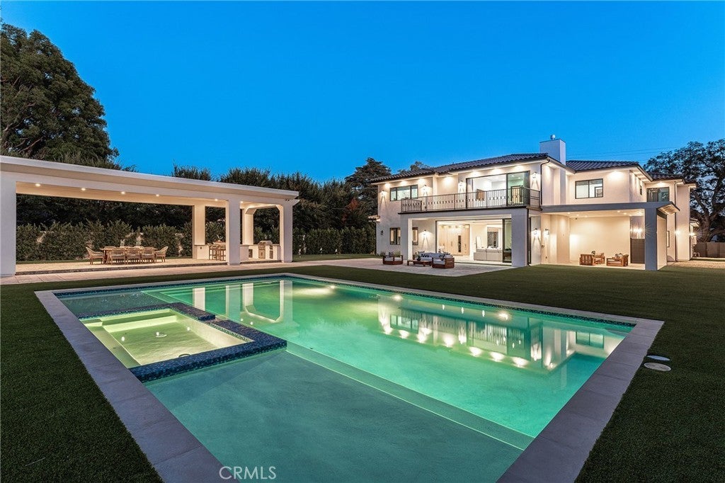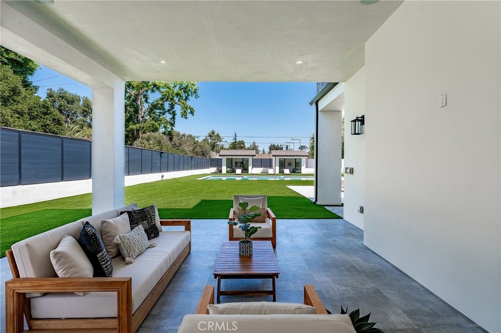 Welcome to this stunning newly constructed estate in the exclusive Weddington Estates enclave of Sherman Oaks. Set behind private gates on a sprawling corner lot, this home blends luxury, comfort, and smart living with effortless style. Featuring 5 spacious bedrooms and 4.5 luxurious bathrooms, the residence showcases white oak flooring, sophisticated smart home technology, and exceptional indoor-outdoor flow—perfect for entertaining. Step through custom arched iron double doors into a light-filled, open-concept layout designed for grand living. The formal living and dining areas unite into a dramatic great room with expansive windows that flood the space with natural light—ideal for both hosting and relaxing. The gourmet chef’s kitchen is equipped with top-of-the-line appliances, a built-in Thermador refrigerator and freezer, full-size wine fridge, and a butler’s pantry. It opens to the inviting family room, complete with a sleek fireplace and oversized Fleetwood pocket sliding doors that lead to your private, resort-style backyard. The main level also includes a media room, custom wet bar with wine fridge, and a versatile guest suite with en-suite bath—perfect for visitors or in-laws. Upstairs, you'll find three generously sized bedrooms, including two en-suites with custom walk-in closets. The primary suite is a luxurious retreat with pocket doors that open to a private balcony, his and hers walk-in closets with built-ins, and a spa-inspired bathroom with dual vanities, an oversized soaking tub, and a double rainfall shower. A conveniently located upstairs laundry room adds functionality. Outdoors, the resort-style backyard is designed for unforgettable gatherings. Enjoy a sparkling pool and spa, two enclosed recreation cabanas, a putting green, and two covered patios—including an oversized space with a fully equipped outdoor kitchen and BBQ area for the ultimate open-air lounge experience. This backyard is a true entertainer’s dream. Smart home automation powered by Control4 provides seamless control of lighting, integrated sound system including sonos, climate, pool, spa, and more—delivering unparalleled comfort, convenience, and modern luxury throughout. This estate also caters to the car enthusiast, featuring a spacious 3-car garage, three separate gated entrances, and an expansive driveway that offers ample parking for multiple vehicles.