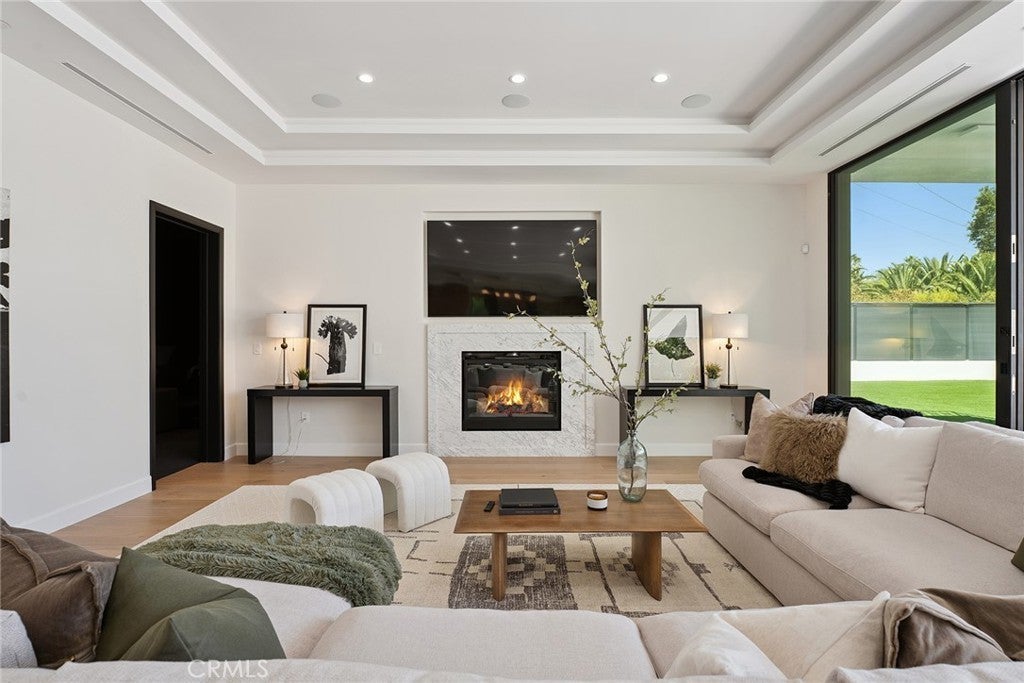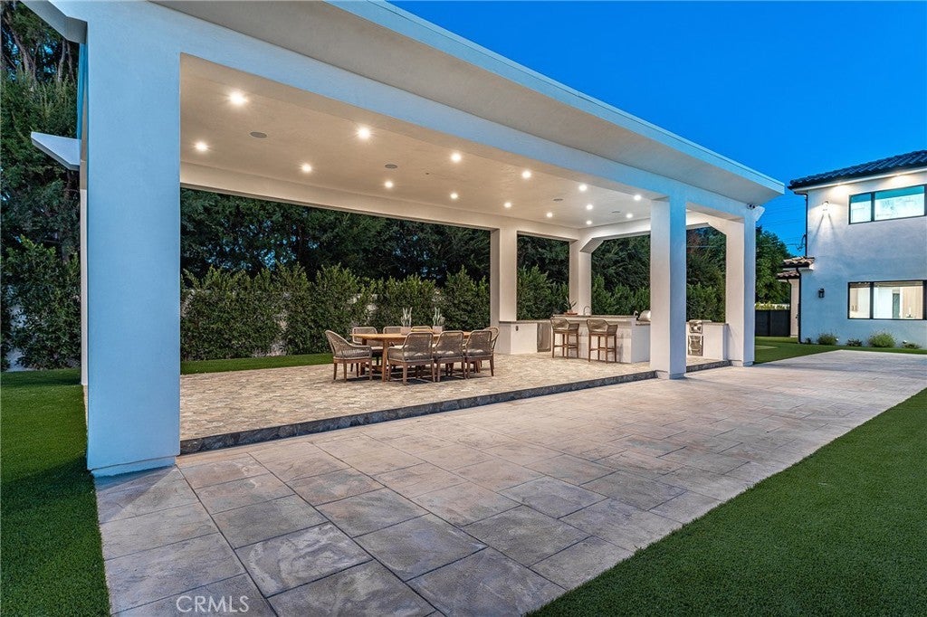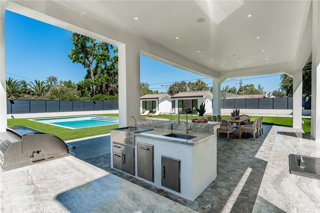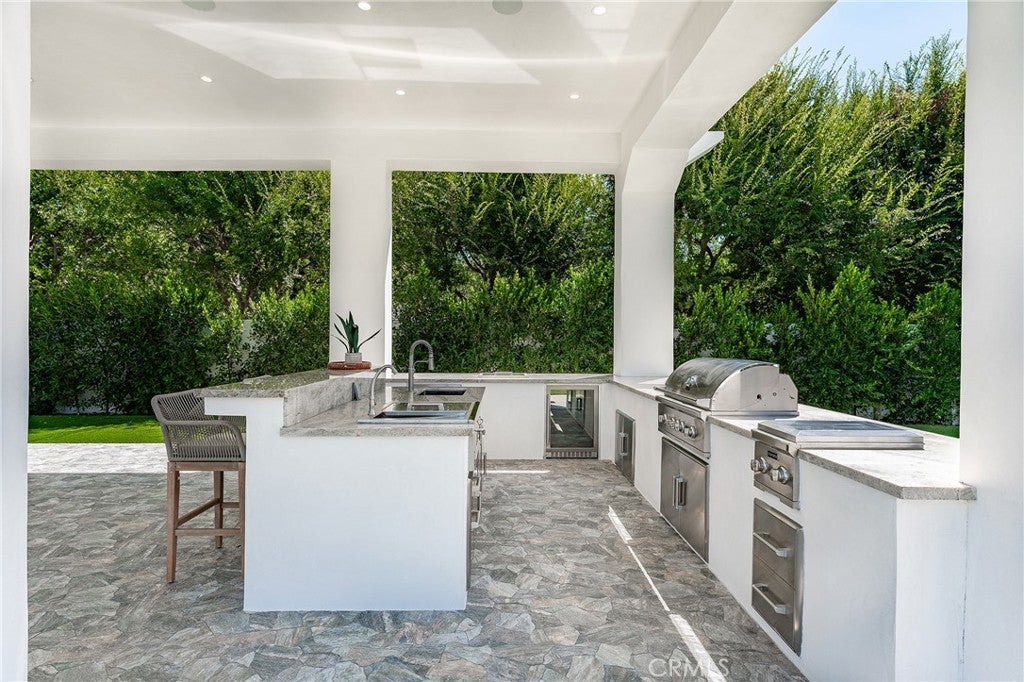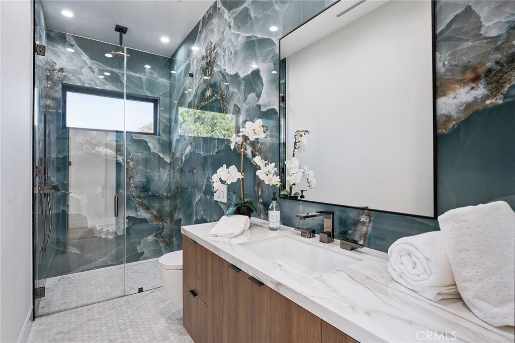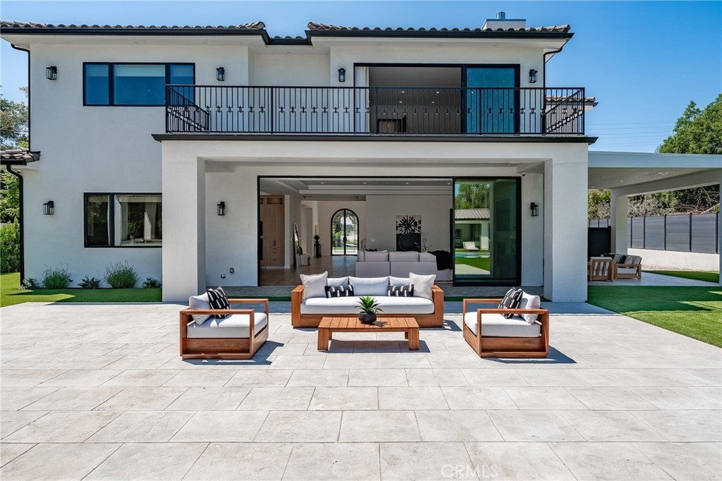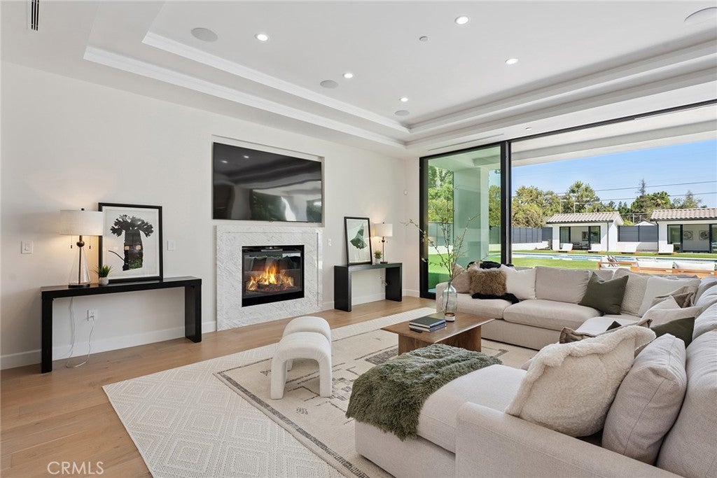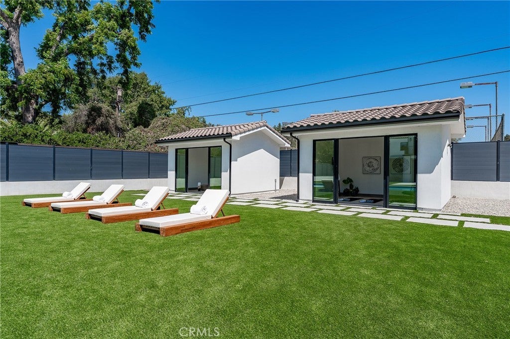 Welcome to this stunning newly constructed estate in the exclusive Weddington Estates enclave of Sherman Oaks. Set behind private gates on a sprawling corner lot, this home blends luxury, comfort, and smart living with effortless style. Featuring 5 spacious bedrooms and 4.5 luxurious bathrooms, the residence showcases white oak flooring, sophisticated smart home technology, and exceptional indoor-outdoor flow—perfect for entertaining. Step through custom arched iron double doors into a light-filled, open-concept layout designed for grand living. The formal living and dining areas unite into a dramatic great room with expansive windows that flood the space with natural light—ideal for both hosting and relaxing. The gourmet chef’s kitchen is equipped with top-of-the-line appliances, a built-in Thermador refrigerator and freezer, full-size wine fridge, and a butler’s pantry. It opens to the inviting family room, complete with a sleek fireplace and oversized Fleetwood pocket sliding doors that lead to your private, resort-style backyard. The main level also includes a media room, custom wet bar with wine fridge, and a versatile guest suite with en-suite bath—perfect for visitors or in-laws. Upstairs, you'll find three generously sized bedrooms, including two en-suites with custom walk-in closets. The primary suite is a luxurious retreat with pocket doors that open to a private balcony, his and hers walk-in closets with built-ins, and a spa-inspired bathroom with dual vanities, an oversized soaking tub, and a double rainfall shower. A conveniently located upstairs laundry room adds functionality. Outdoors, the resort-style backyard is designed for unforgettable gatherings. Enjoy a sparkling pool and spa, two enclosed recreation cabanas, a putting green, and two covered patios—including an oversized space with a fully equipped outdoor kitchen and BBQ area for the ultimate open-air lounge experience. This backyard is a true entertainer’s dream. Smart home automation powered by Control4 provides seamless control of lighting, integrated sound system including sonos, climate, pool, spa, and more—delivering unparalleled comfort, convenience, and modern luxury throughout. This estate also caters to the car enthusiast, featuring a spacious 3-car garage, three separate gated entrances, and an expansive driveway that offers ample parking for multiple vehicles.