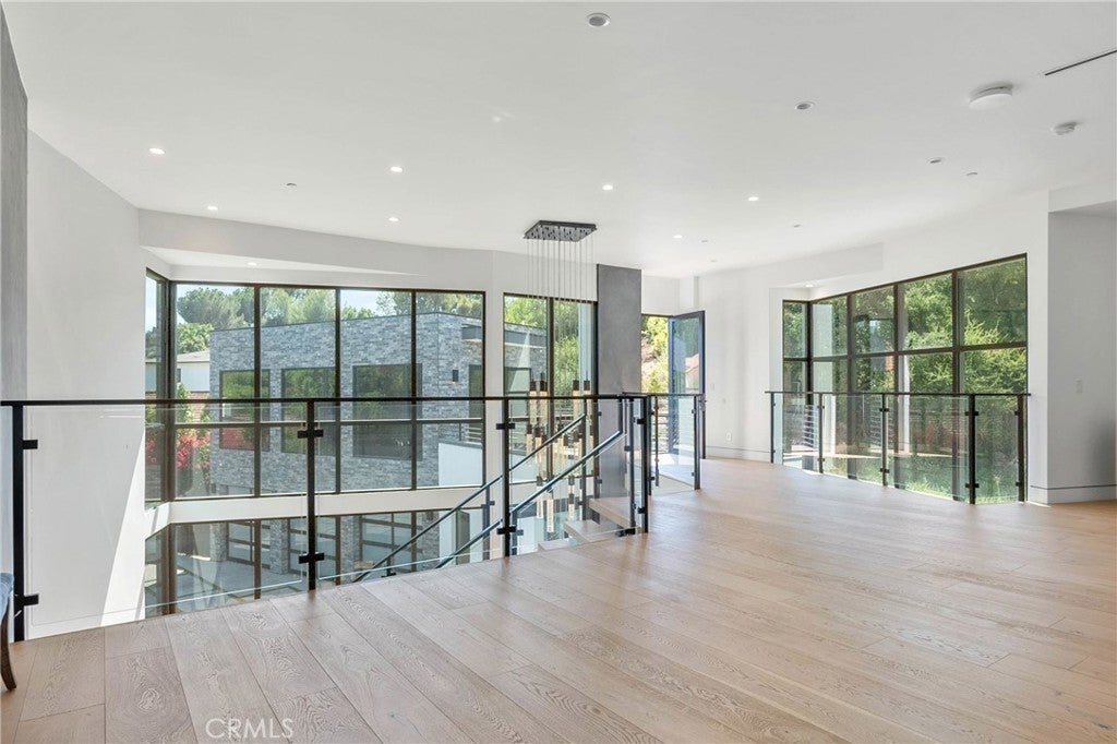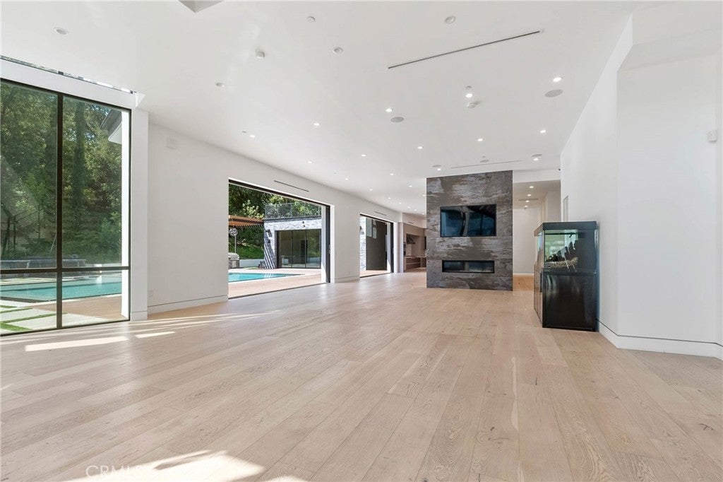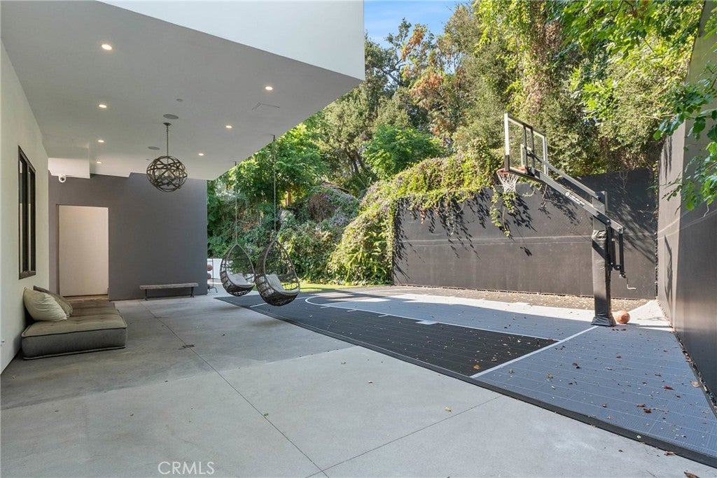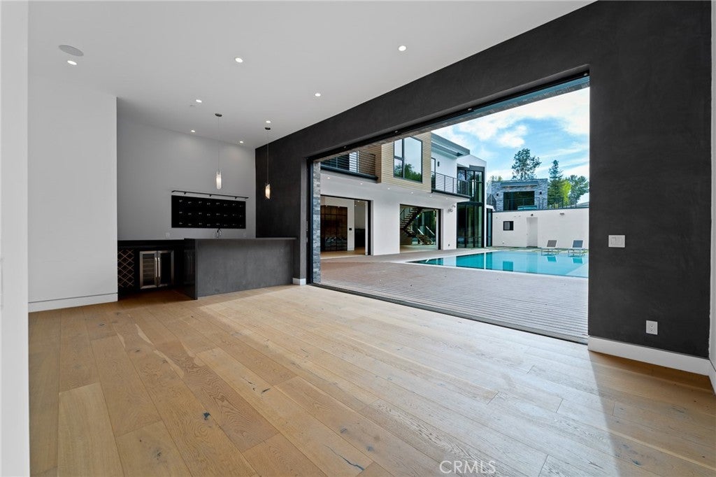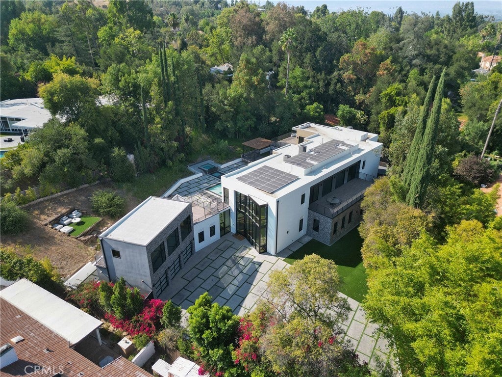 Welcome to your private sanctuary, nestled on a sprawling .68 acre wooded lot. Situated on a flag lot, this estate sits far from the street, ensuring unmatched privacy. A gated entrance and extended driveway lead to a spacious three car garage, with ample additional parking for guests. Step through the breathtaking glass entryway, where soaring 32-foot ceilings, a dramatic chandelier, and striking white oak floating stairs set the stage for this architectural masterpiece. Walls of glass and Fleetwood sliding doors seamlessly blend indoor and outdoor living, flooding the space with natural light and creating an entertainer’s dream. The open concept layout is anchored by stunning oak floors and a sophisticated Italian designed kitchen, featuring a hidden oversized pantry and a wine fridge, perfectly positioned beside an elegant formal dining area. The lower level boasts two ensuite bedrooms, a private office, and a state-of-the-art theater, ensuring ultimate comfort and convenience. Upstairs, the primary suite is a true retreat, complete with a cozy fireplace, a custom walk-in closet, and a spa inspired bath. A private sitting area and relaxation patio offer a peaceful escape. Above the garage, a versatile space awaits, ideal for a gym, studio, or guest quarters, opening onto a spacious outdoor terrace. Step outside into an entertainer’s paradise, featuring a zero edge saltwater pool and spa, a sleek cabana, a fully equipped pool house, and a basketball court. Multiple outdoor patios provide the perfect setting for dining and relaxation, while paid-for solar panels add a modern touch of efficiency. Experience the pinnacle of luxury living, where privacy, elegance, and resort style amenities come together in perfect harmony.