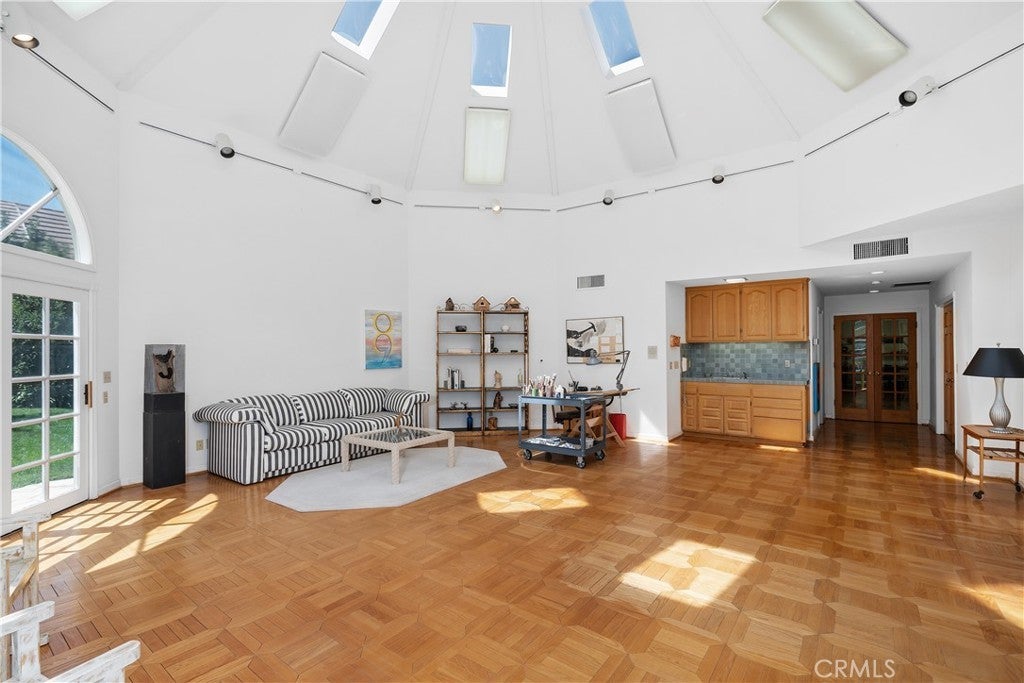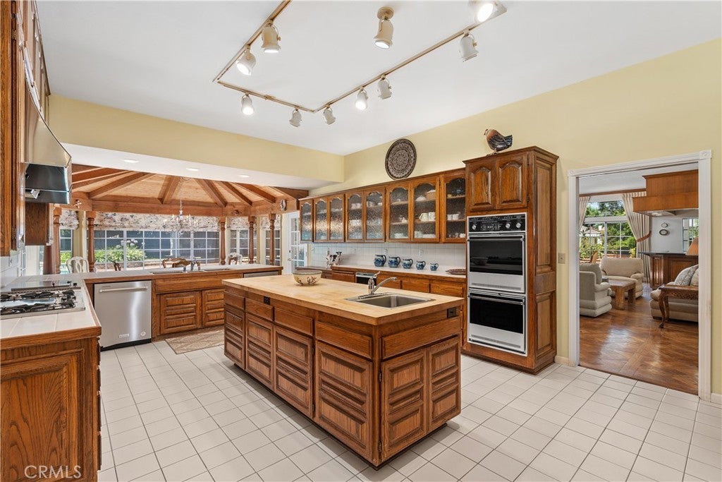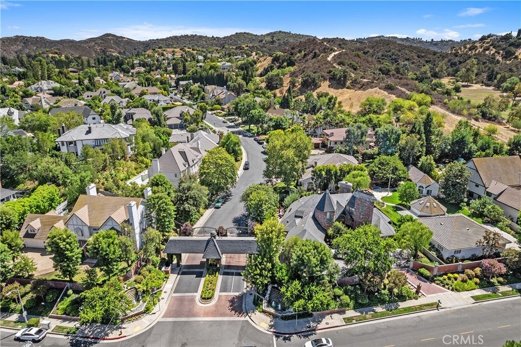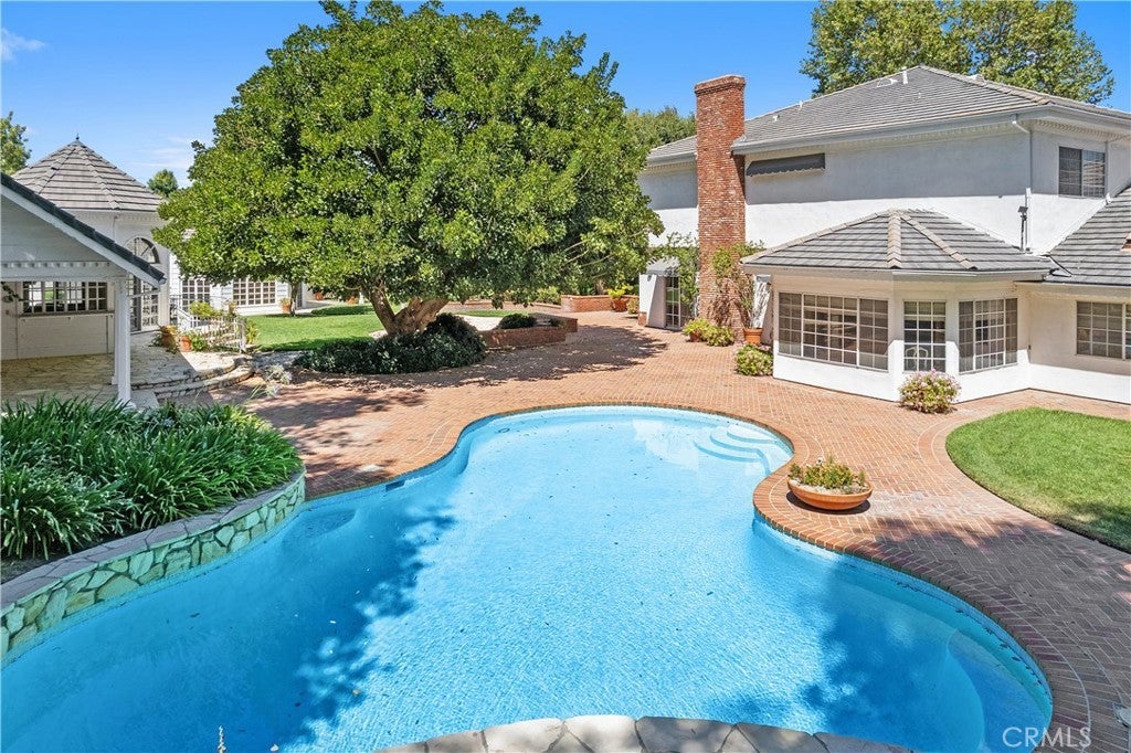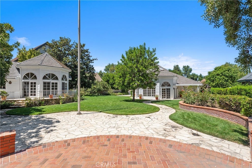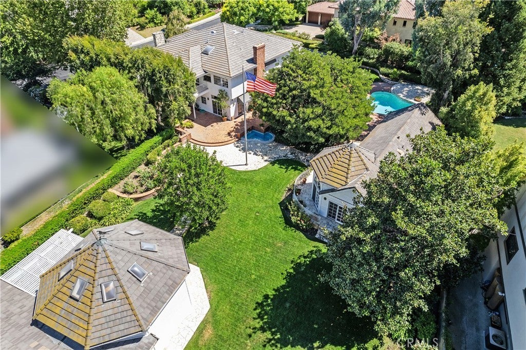 Welcome to the prestigious guard-gated community of Westchester County Estates in Woodland Hills! Set on a mostly flat, approx. 36,000 square foot double lot, this property offers Multi-generational living. The main residence is approx. 6,100 sq. ft. with a 4 car garage. Additionally, there is an approx. 1,700 sq. ft. studio & workshop with bathroom PLUS an approx. 760 sq. ft. pool house with bath, both of which can be used as a guest house or an ADU providing for Multi-Family living. But wait, there is more! An expansive driveway accessed at Wells Drive leads to an additional approx. 1,100 sq. ft 2-story garage with a loft, a Car Collectors dream with potential to store 8+ cars (with lifts added.) On the market for the first time, this 5-bedroom, 7-bath home is filled with architectural character, timeless craftsmanship and a fantastic floor-plan. A double-door entry opens to a soaring two-story foyer with oak parquet floors. The elegant living room features a marble fireplace and bay window, while the formal dining room impresses with French doors to a patio, crown moulding, and a butler’s pantry. The chef’s kitchen includes a butcher block island with sink, extensive cabinetry, and a breakfast area beneath wood-beamed ceilings. The spacious family room is highlighted by a massive brick fireplace and granite wet bar. The richly appointed office is finished with oak-paneled walls, built-in shelves, and a stone fireplace. The luxurious primary suite offers a fireplace, sitting area, gym, sauna, oversized walk-in closet, and a private balcony with direct access to the grounds. With a thoughtful floor plan, generous room sizes, and oak floors throughout much of the home, comfort meets elegance at every turn. The outdoor spaces are truly extraordinary. A free-form pool and spa are surrounded by expansive lawns, brick patios and fruit trees—an entertainer’s paradise unlike any other. The pool house has cathedral wood ceilings, a bathroom, a custom bar, a stone fireplace and covered patio with a built-in BBQ! The octagon shaped studio is light and bright with skylights and sliding glass doors that let natural light flow! This home has it all!
