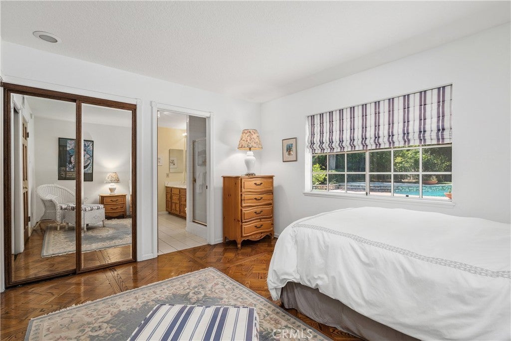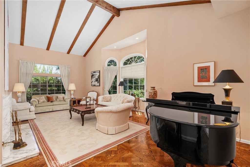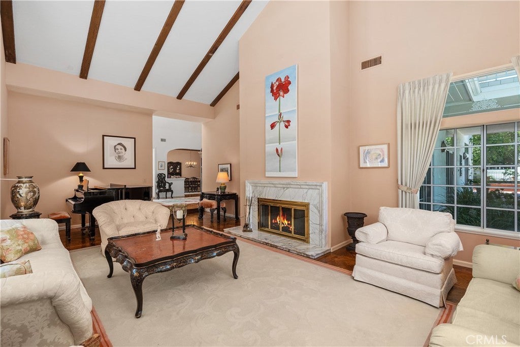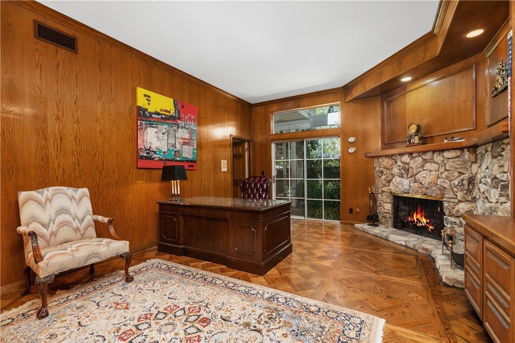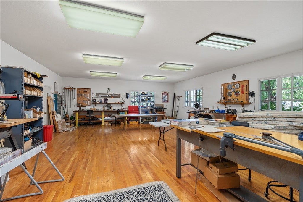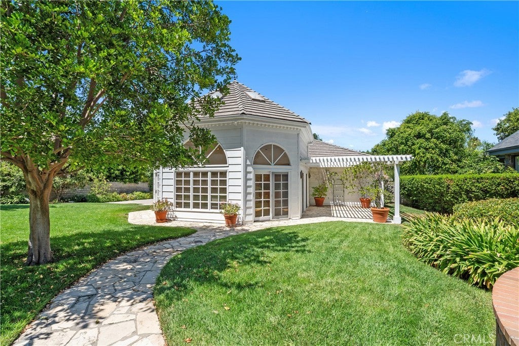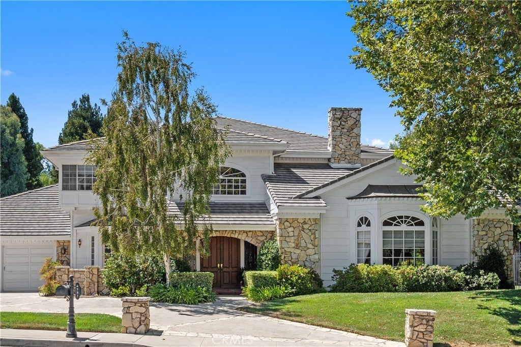Welcome to the prestigious guard-gated community of Westchester County Estates in Woodland Hills! Set on a mostly flat, approx. 36,000 square foot double lot, this property offers Multi-generational living. The main residence is approx. 6,100 sq. ft. with a 4 car garage. Additionally, there is an approx. 1,700 sq. ft. studio & workshop with bathroom PLUS an approx. 760 sq. ft. pool house with bath, both of which can be used as a guest house or an ADU providing for Multi-Family living. But wait, there is more! An expansive driveway accessed at Wells Drive leads to an additional approx. 1,100 sq. ft 2-story garage with a loft, a Car Collectors dream with potential to store 8+ cars (with lifts added.) On the market for the first time, this 5-bedroom, 7-bath home is filled with architectural character, timeless craftsmanship and a fantastic floor-plan. A double-door entry opens to a soaring two-story foyer with oak parquet floors. The elegant living room features a marble fireplace and bay window, while the formal dining room impresses with French doors to a patio, crown moulding, and a butler’s pantry. The chef’s kitchen includes a butcher block island with sink, extensive cabinetry, and a breakfast area beneath wood-beamed ceilings. The spacious family room is highlighted by a massive brick fireplace and granite wet bar. The richly appointed office is finished with oak-paneled walls, built-in shelves, and a stone fireplace. The luxurious primary suite offers a fireplace, sitting area, gym, sauna, oversized walk-in closet, and a private balcony with direct access to the grounds. With a thoughtful floor plan, generous room sizes, and oak floors throughout much of the home, comfort meets elegance at every turn. The outdoor spaces are truly extraordinary. A free-form pool and spa are surrounded by expansive lawns, brick patios and fruit trees—an entertainer’s paradise unlike any other. The pool house has cathedral wood ceilings, a bathroom, a custom bar, a stone fireplace and covered patio with a built-in BBQ! The octagon shaped studio is light and bright with skylights and sliding glass doors that let natural light flow! This home has it all!