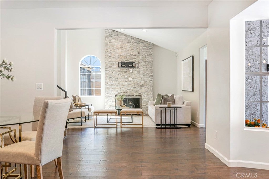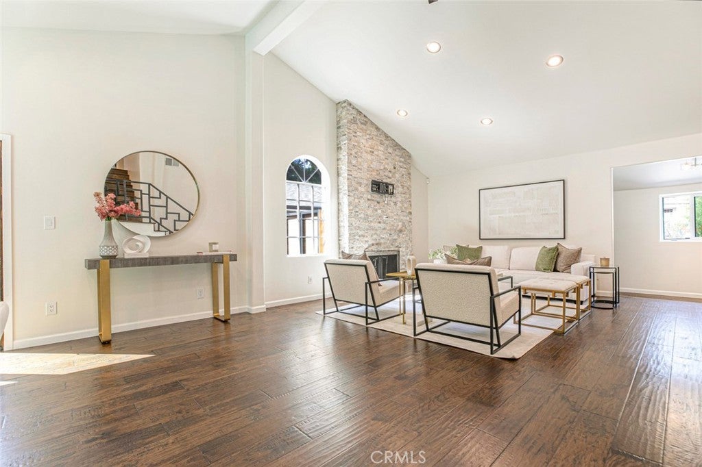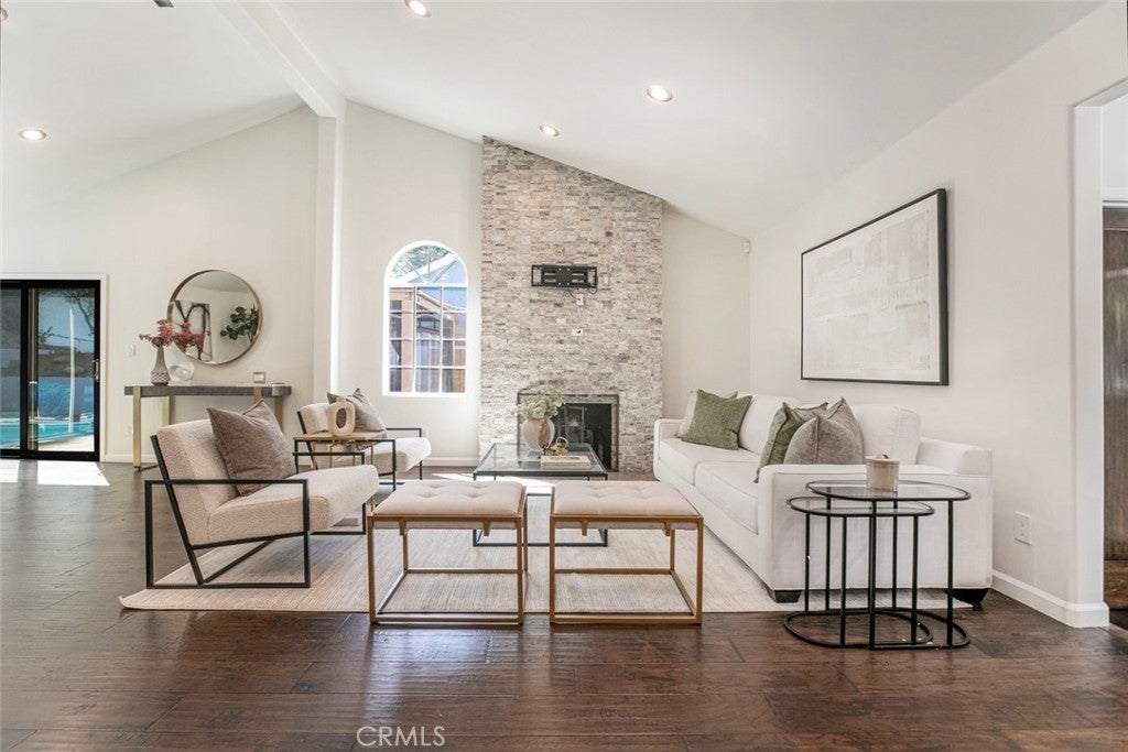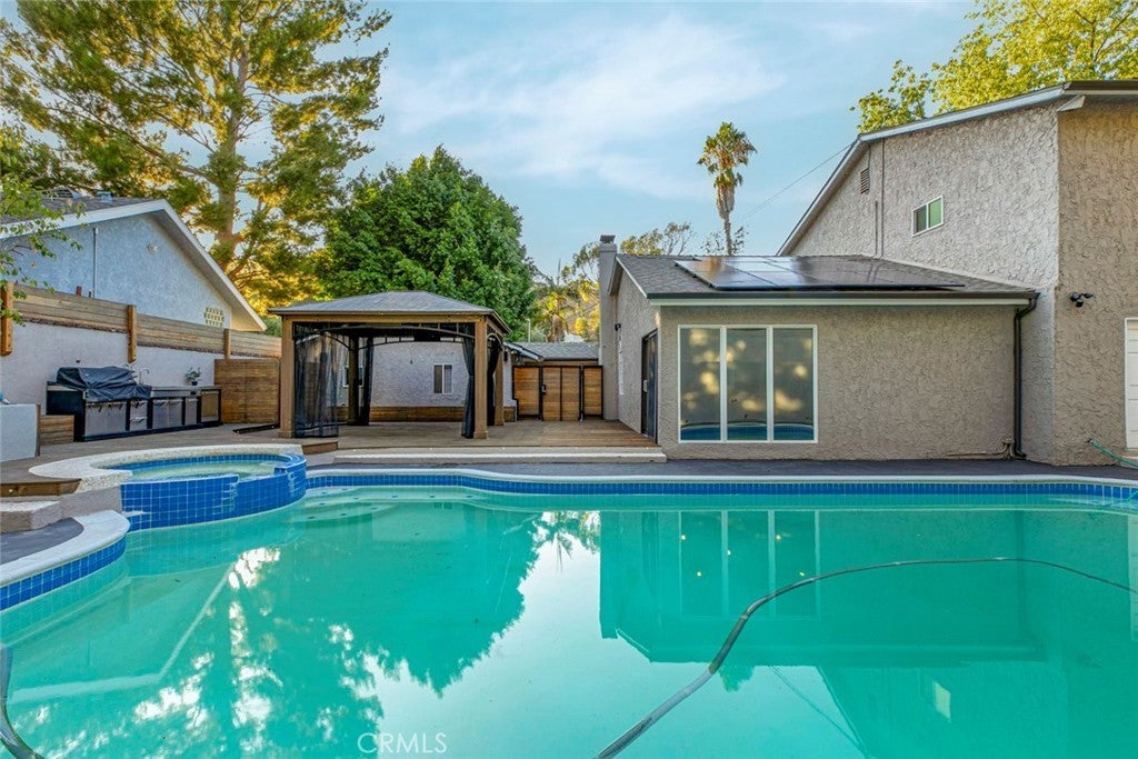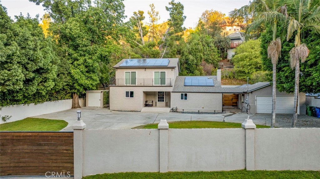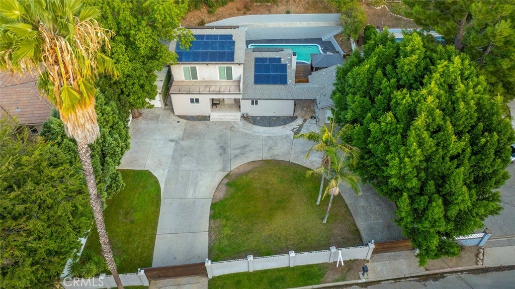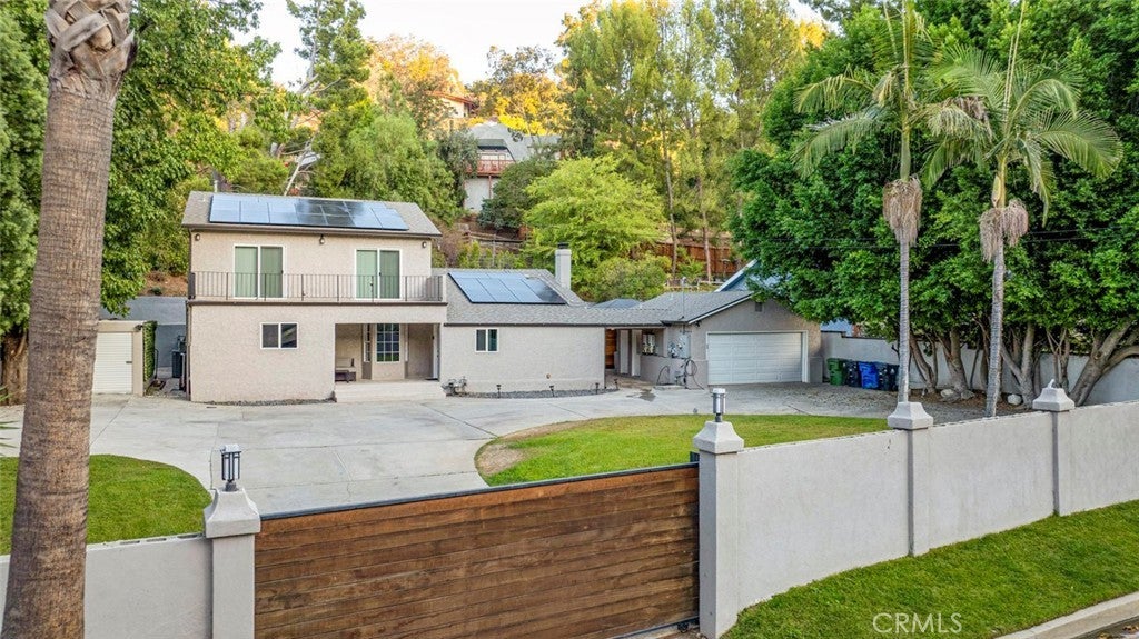 Welcome to this stunning four-bedroom, four-bathroom home, offering a perfect blend of elegance, comfort, and functionality. Step inside to a grand living room with soaring cathedral ceilings and a cozy fireplace, creating the ideal setting for both relaxing and entertaining. The inviting kitchen features a charming breakfast nook, while multiple living and dining areas flow seamlessly for everyday comfort. Upstairs, one of the bedrooms opens onto a private balcony overlooking the street, providing a perfect spot to unwind. Enjoy California living at its finest in the backyard retreat, complete with a sparkling pool, spacious patio, and a beautiful wooden deck—perfect for hosting gatherings or simply enjoying the outdoors. Additional highlights include a circular driveway, gated entrance for privacy, and ample parking space. The property is also equipped with a fully paid-off solar system, offering eco-friendly living and reduced utility costs. This home combines thoughtful design with timeless appeal, making it a true standout.