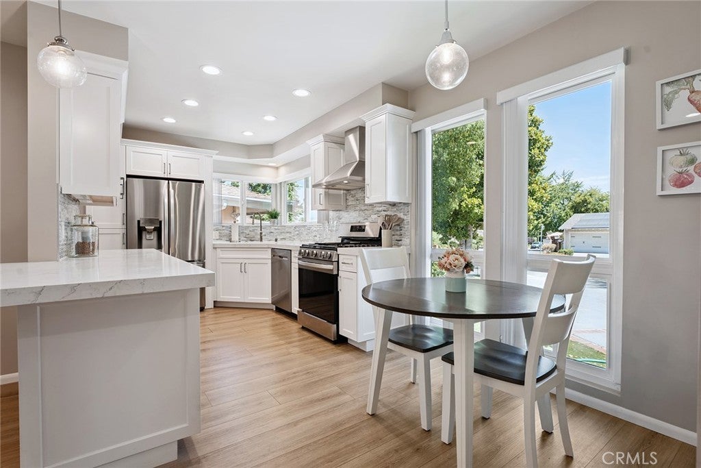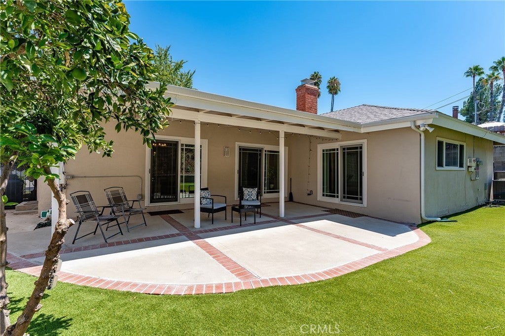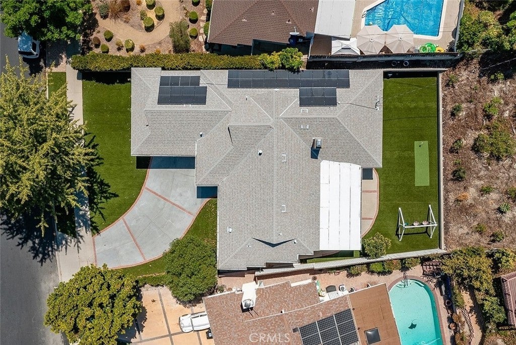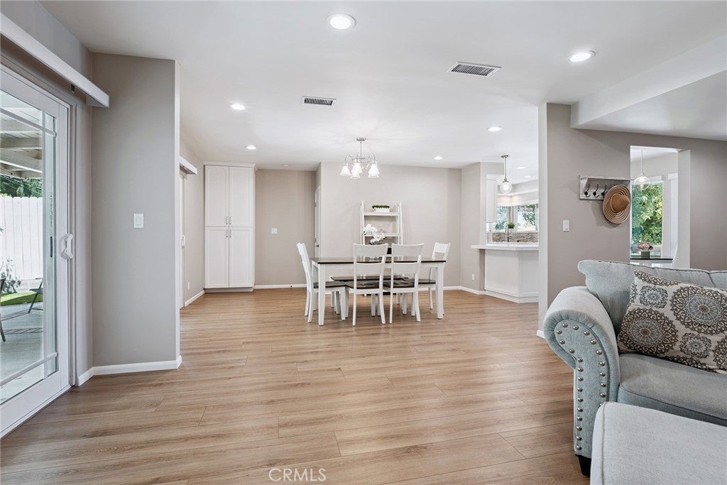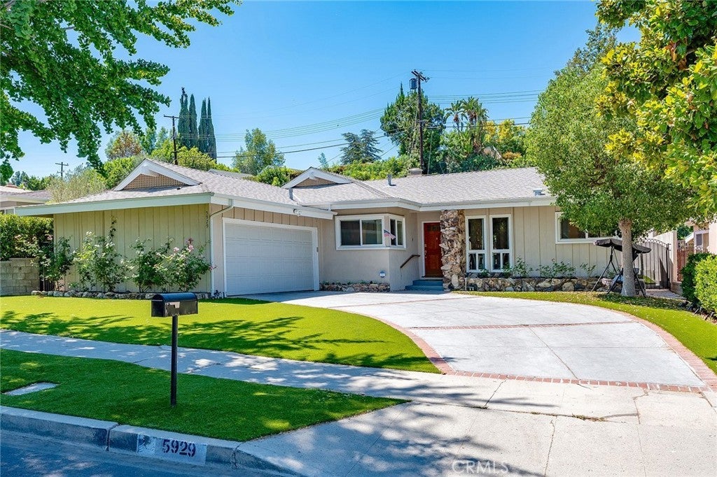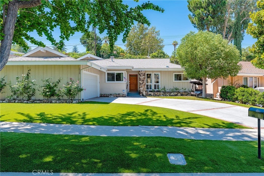 Highly remodeled single story home with paid solar panels! Situated in a great Woodland Hills neighborhood zoned for highly acclaimed Hale and El Camino charter schools. The property has great curb appeal with wide frontage and large front yard with synthetic lawn, mature trees, and sweeping driveway that leads to the 2-car attached garage. Step inside to find a formal entry with coat closet that opens to a sunlit open floor plan featuring new flooring and LED lighting throughout. A spacious living room features modern fireplace flanked by built-in storage shelving and large sliding glass door that opens to the yard. A separate oversized dining room has built-in pantry/storage cabinetry and another sliding glass door that opens to the yard. The gorgeous completely remodeled kitchen opens directly to the living spaces and features quartz counters, custom soft close cabinetry, stainless appliances, pantry space with pullout drawers, large center peninsula with breakfast bar seating, and separate breakfast nook with oversized picture windows. A convenient guest powder bathroom is located off the living spaces. All four bedrooms are located on their own wing of the house. The large primary bedroom is situated perfectly overlooking the backyard with private exterior glass slider, large walk-in closet with built-ins, and en-suite bathroom with walk-in shower and built-in linen storage. The three secondary bedrooms are all well appointed with large windows and good closet space. A large upgraded hall bathroom has new vanity with stone countertop, dual sinks, and bathtub with shower. There is also a separate laundry room off the kitchen with exterior access. The low maintenance backyard features a large covered patio with overhead string lights perfect for outdoor dining, sprawling synthetic lawn with putting green hole, and producing fruit tree. Additional 2022 system upgrades per seller: roof, 200 amp electrical panel, tankless water heater, Anderson windows/doors, and owned solar panels for great energy savings! Adjacent to dining/shopping at the Westfield Mall & Village, Calabasas Commons, Warner Center, & great local parks and hiking trails.