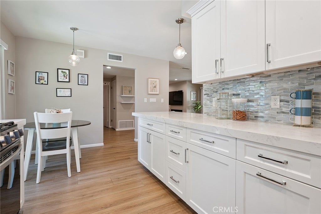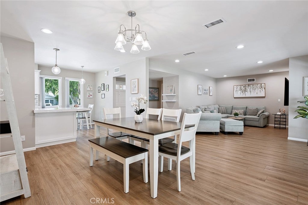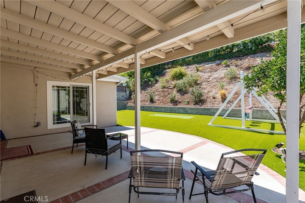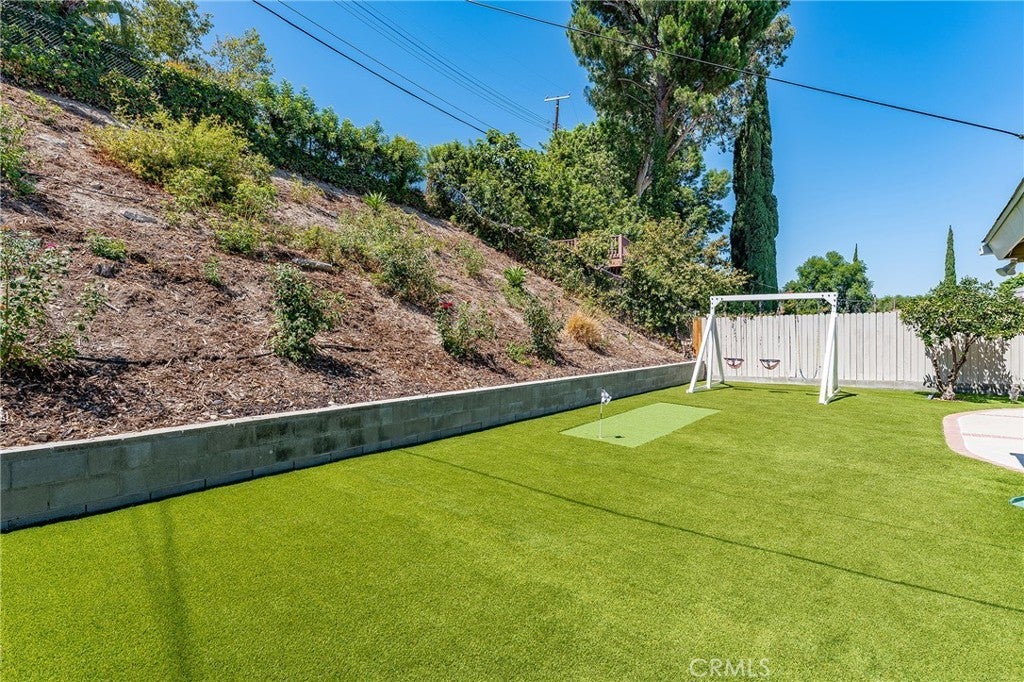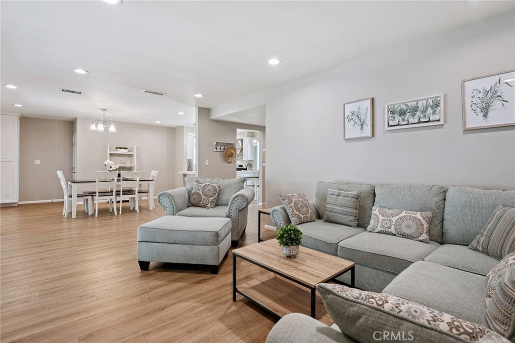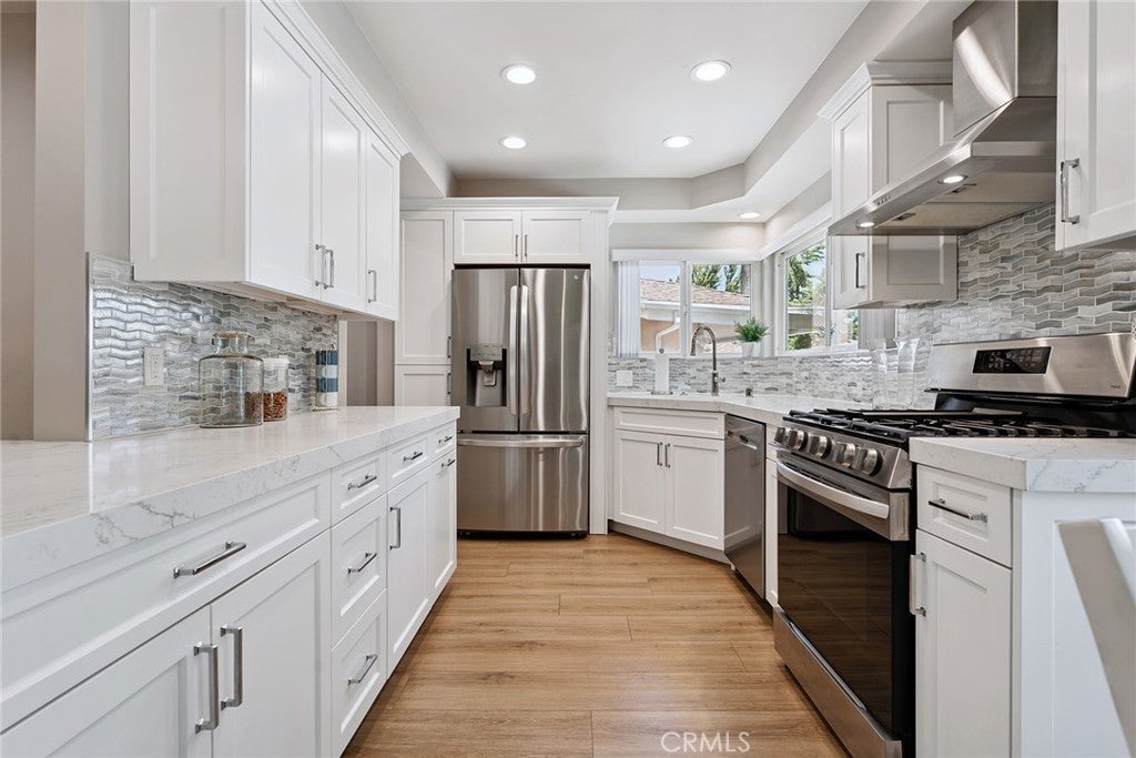 Highly remodeled single story home with paid solar panels! Situated in a great Woodland Hills neighborhood zoned for highly acclaimed Hale and El Camino charter schools. The property has great curb appeal with wide frontage and large front yard with synthetic lawn, mature trees, and sweeping driveway that leads to the 2-car attached garage. Step inside to find a formal entry with coat closet that opens to a sunlit open floor plan featuring new flooring and LED lighting throughout. A spacious living room features modern fireplace flanked by built-in storage shelving and large sliding glass door that opens to the yard. A separate oversized dining room has built-in pantry/storage cabinetry and another sliding glass door that opens to the yard. The gorgeous completely remodeled kitchen opens directly to the living spaces and features quartz counters, custom soft close cabinetry, stainless appliances, pantry space with pullout drawers, large center peninsula with breakfast bar seating, and separate breakfast nook with oversized picture windows. A convenient guest powder bathroom is located off the living spaces. All four bedrooms are located on their own wing of the house. The large primary bedroom is situated perfectly overlooking the backyard with private exterior glass slider, large walk-in closet with built-ins, and en-suite bathroom with walk-in shower and built-in linen storage. The three secondary bedrooms are all well appointed with large windows and good closet space. A large upgraded hall bathroom has new vanity with stone countertop, dual sinks, and bathtub with shower. There is also a separate laundry room off the kitchen with exterior access. The low maintenance backyard features a large covered patio with overhead string lights perfect for outdoor dining, sprawling synthetic lawn with putting green hole, and producing fruit tree. Additional 2022 system upgrades per seller: roof, 200 amp electrical panel, tankless water heater, Anderson windows/doors, and owned solar panels for great energy savings! Adjacent to dining/shopping at the Westfield Mall & Village, Calabasas Commons, Warner Center, & great local parks and hiking trails.