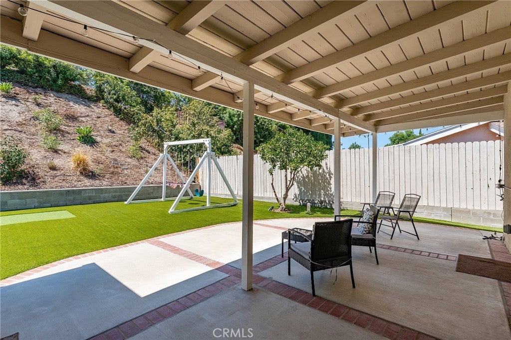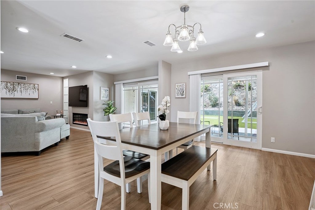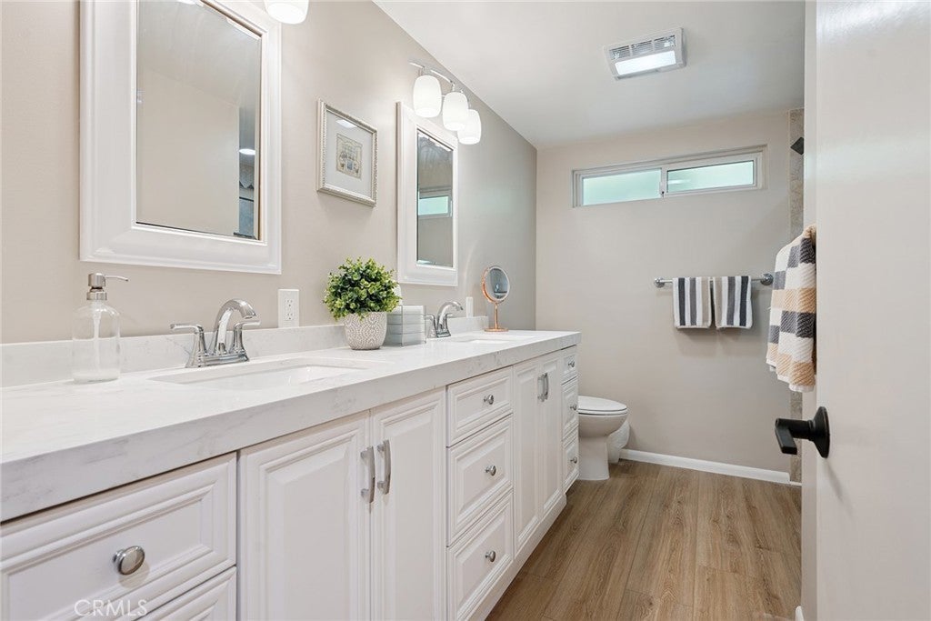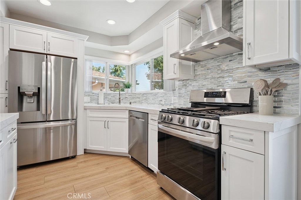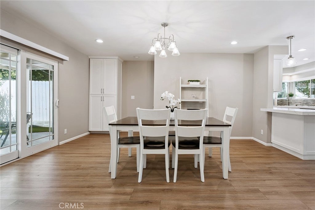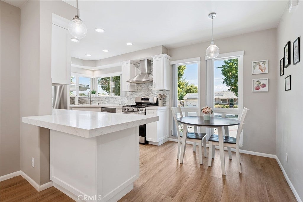 Highly remodeled single story home with paid solar panels! Situated in a great Woodland Hills neighborhood zoned for highly acclaimed Hale and El Camino charter schools. The property has great curb appeal with wide frontage and large front yard with synthetic lawn, mature trees, and sweeping driveway that leads to the 2-car attached garage. Step inside to find a formal entry with coat closet that opens to a sunlit open floor plan featuring new flooring and LED lighting throughout. A spacious living room features modern fireplace flanked by built-in storage shelving and large sliding glass door that opens to the yard. A separate oversized dining room has built-in pantry/storage cabinetry and another sliding glass door that opens to the yard. The gorgeous completely remodeled kitchen opens directly to the living spaces and features quartz counters, custom soft close cabinetry, stainless appliances, pantry space with pullout drawers, large center peninsula with breakfast bar seating, and separate breakfast nook with oversized picture windows. A convenient guest powder bathroom is located off the living spaces. All four bedrooms are located on their own wing of the house. The large primary bedroom is situated perfectly overlooking the backyard with private exterior glass slider, large walk-in closet with built-ins, and en-suite bathroom with walk-in shower and built-in linen storage. The three secondary bedrooms are all well appointed with large windows and good closet space. A large upgraded hall bathroom has new vanity with stone countertop, dual sinks, and bathtub with shower. There is also a separate laundry room off the kitchen with exterior access. The low maintenance backyard features a large covered patio with overhead string lights perfect for outdoor dining, sprawling synthetic lawn with putting green hole, and producing fruit tree. Additional 2022 system upgrades per seller: roof, 200 amp electrical panel, tankless water heater, Anderson windows/doors, and owned solar panels for great energy savings! Adjacent to dining/shopping at the Westfield Mall & Village, Calabasas Commons, Warner Center, & great local parks and hiking trails.