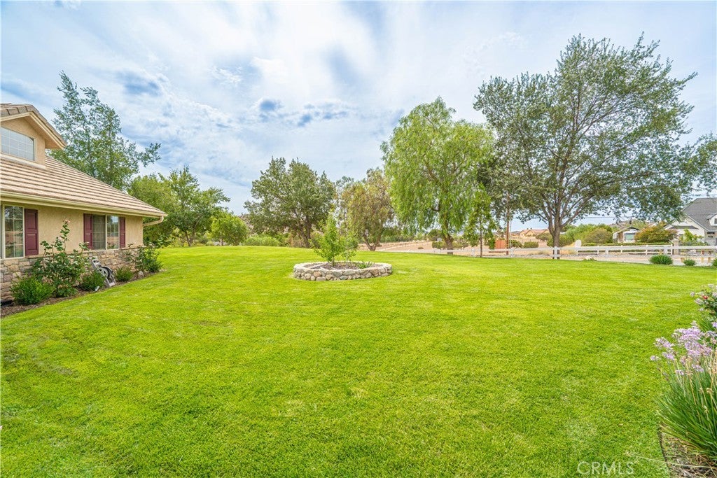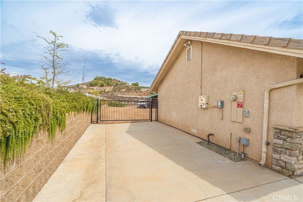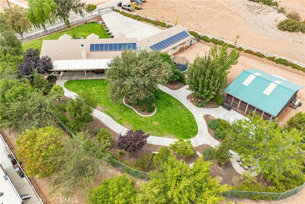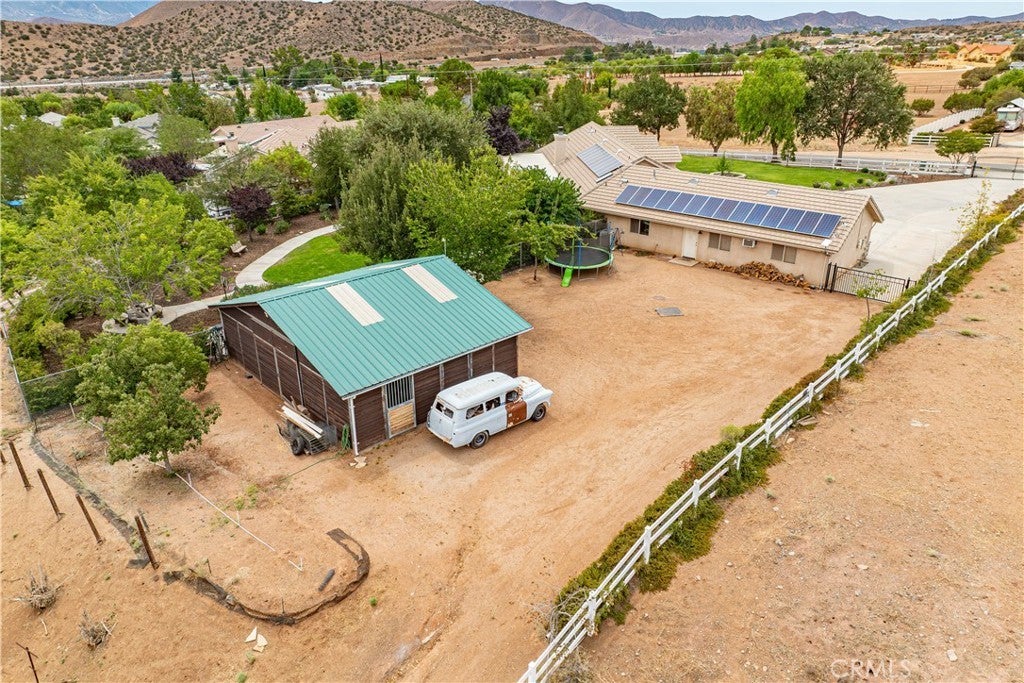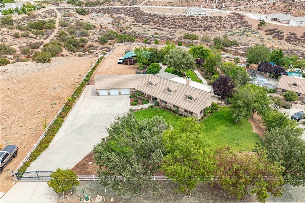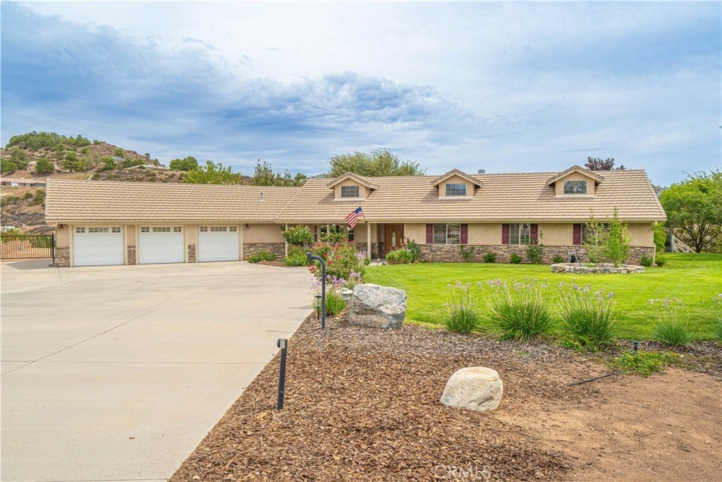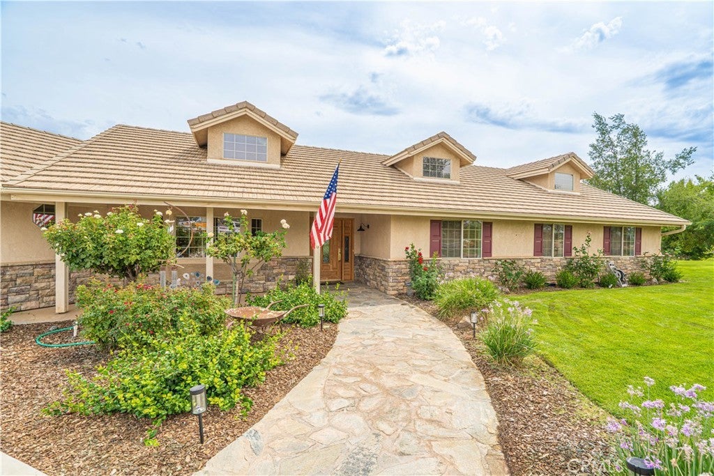 Stunning custom single-story gated estate on nearly 2 acres with breathtaking hillside views. This 4 bedroom 3 bath home features an expansive open concept floorplan with living area with oak hardwood floors, newer carpet, high ceilings, wood-burning fireplace, and whole-house fan. One bedroom with its own bath is privately located at the opposite end of the home, making it ideal for guests or multi-generational living. The spacious kitchen offers a granite island with breakfast bar, walk-in pantry, stainless steel appliances, recessed lighting, reverse osmosis system plumbed to the refrigerator, and abundant cabinet and counter space. The large master suite includes patio access, walk-in closet, and spa-style bath with decorative tile, glass shower enclosure, soaking tub, and bidet. Three bedrooms are located on one side of the home including a secondary suite with its own bath, ideal for guests or multi-generational living. Outdoor amenities include a covered patio, multiple seating areas, fruit trees, drought-tolerant Buffalo grass, and sweeping views of the surrounding hillsides. The 4-stall barn is fully equipped with water and electricity and the lower part of the property provides ample space for horses, corrals, storage, or a garden. Additional features include an attached extra-deep 3-car garage, abundant RV parking with 220V hookup, Hunter irrigation system for customizable watering, owned solar, public water, electric entry gate and paved road access. No HOA or Mello Roos. A rare opportunity to own a move-in ready ranch-style property combining privacy, functionality, and the perfect setting for entertaining or equestrian living.