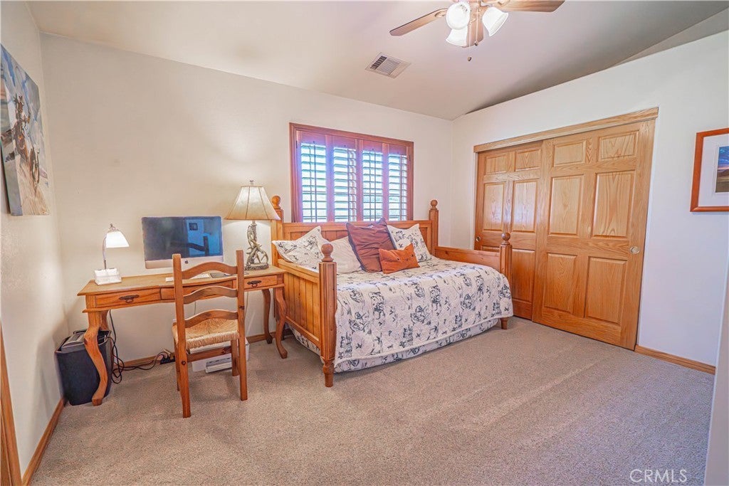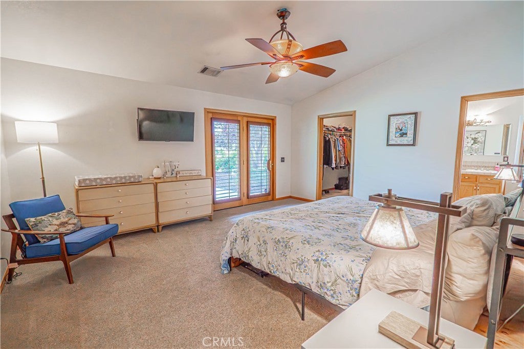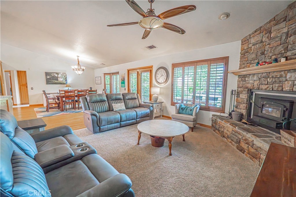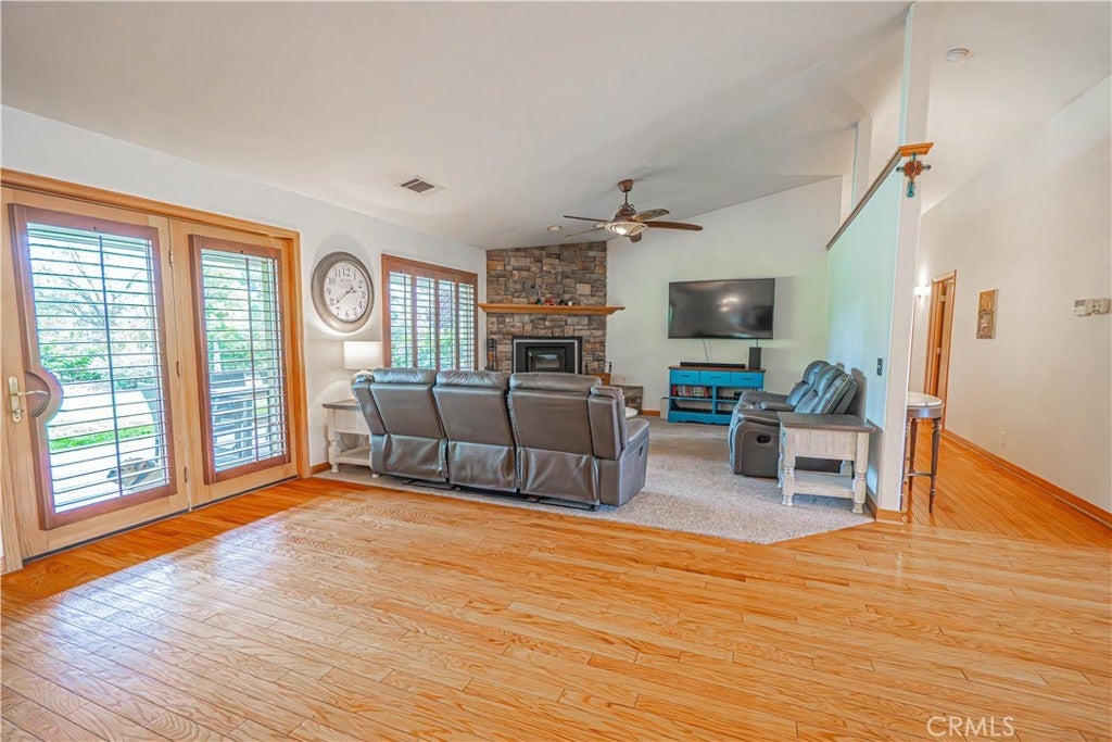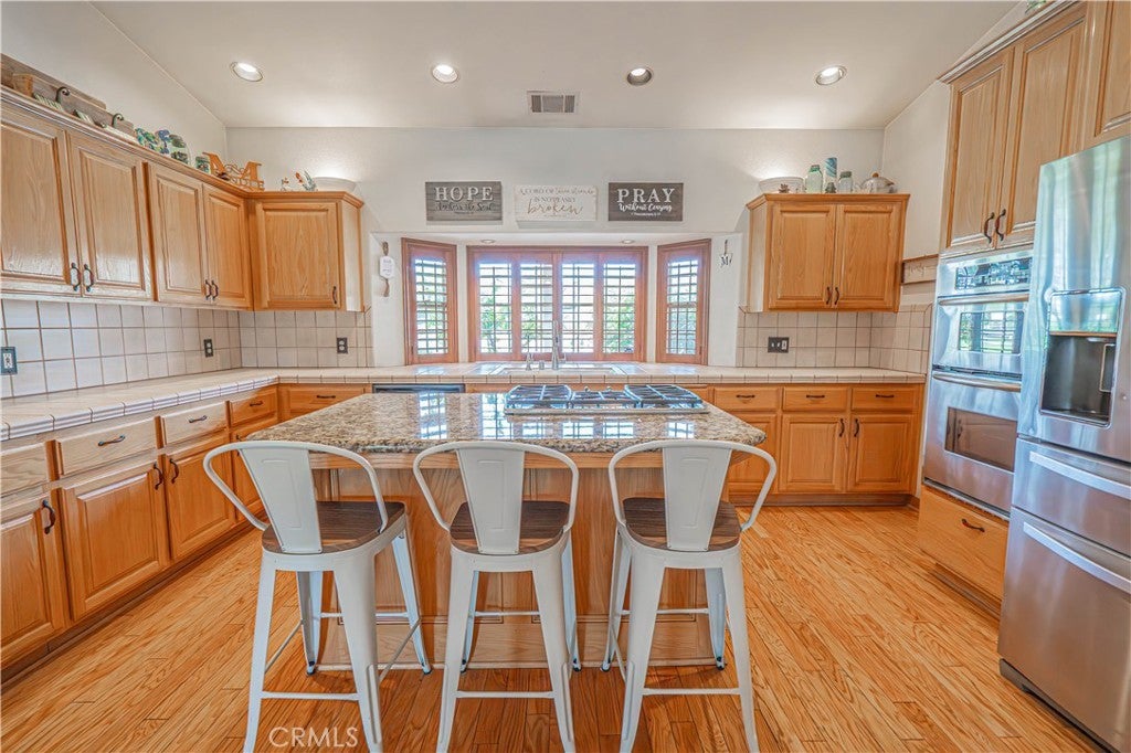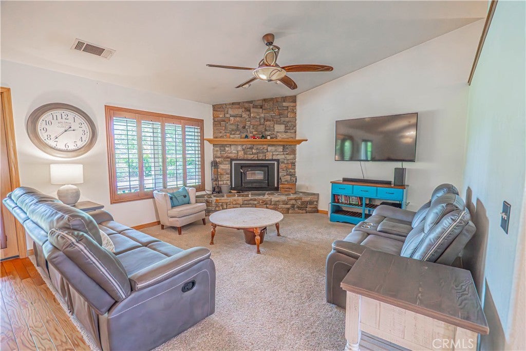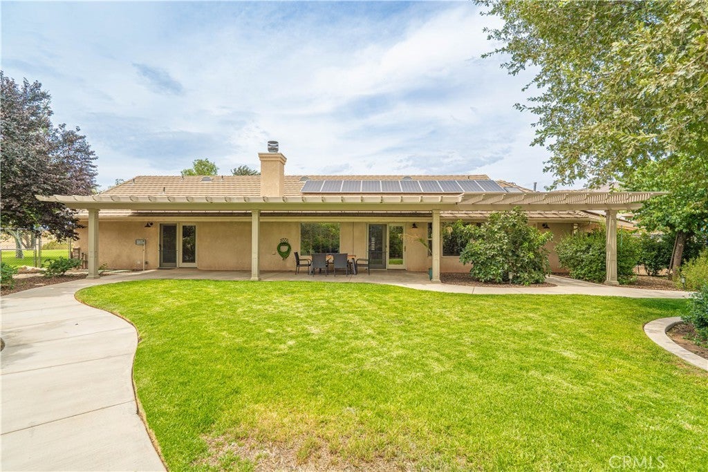 Stunning custom single-story gated estate on nearly 2 acres with breathtaking hillside views. This 4 bedroom 3 bath home features an expansive open concept floorplan with living area with oak hardwood floors, newer carpet, high ceilings, wood-burning fireplace, and whole-house fan. One bedroom with its own bath is privately located at the opposite end of the home, making it ideal for guests or multi-generational living. The spacious kitchen offers a granite island with breakfast bar, walk-in pantry, stainless steel appliances, recessed lighting, reverse osmosis system plumbed to the refrigerator, and abundant cabinet and counter space. The large master suite includes patio access, walk-in closet, and spa-style bath with decorative tile, glass shower enclosure, soaking tub, and bidet. Three bedrooms are located on one side of the home including a secondary suite with its own bath, ideal for guests or multi-generational living. Outdoor amenities include a covered patio, multiple seating areas, fruit trees, drought-tolerant Buffalo grass, and sweeping views of the surrounding hillsides. The 4-stall barn is fully equipped with water and electricity and the lower part of the property provides ample space for horses, corrals, storage, or a garden. Additional features include an attached extra-deep 3-car garage, abundant RV parking with 220V hookup, Hunter irrigation system for customizable watering, owned solar, public water, electric entry gate and paved road access. No HOA or Mello Roos. A rare opportunity to own a move-in ready ranch-style property combining privacy, functionality, and the perfect setting for entertaining or equestrian living.