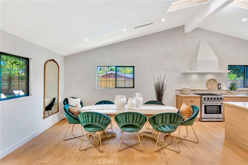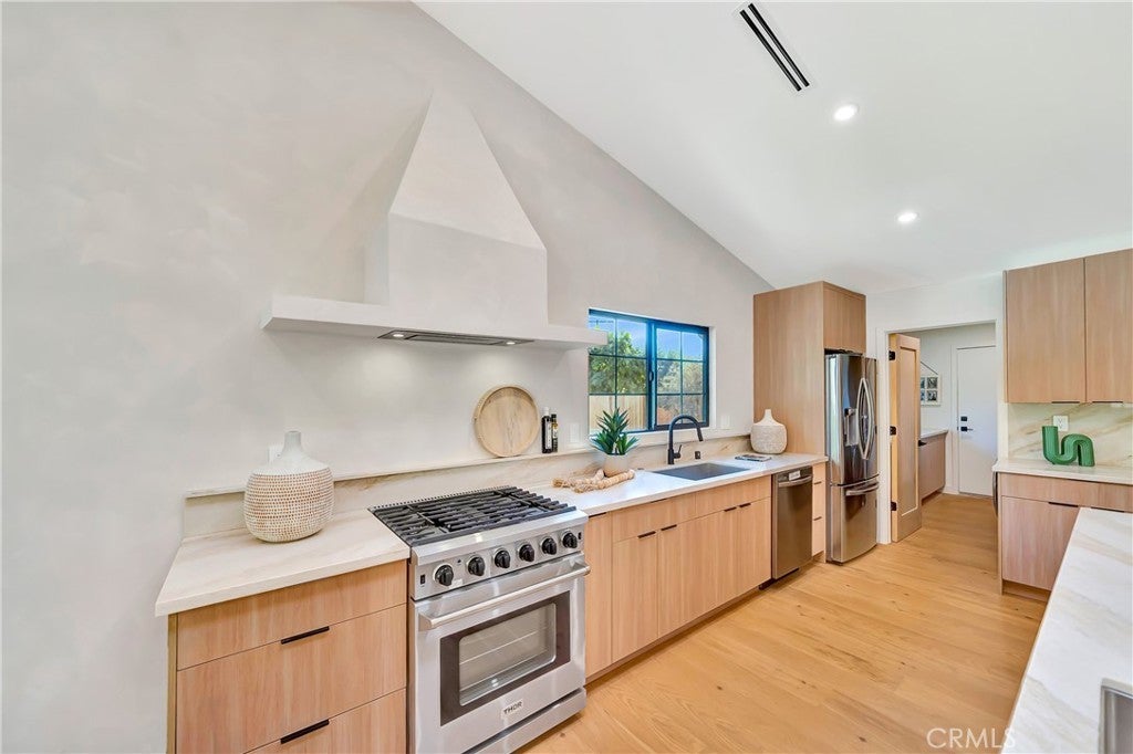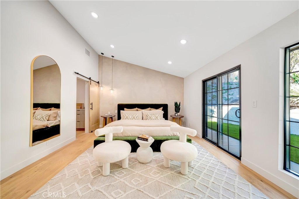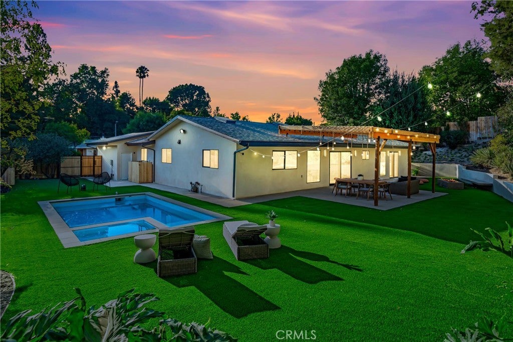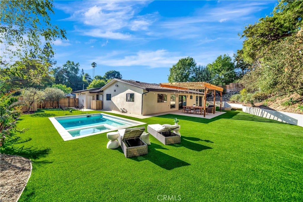 Set on a 14,165 sq. ft. flat and private lot in prime Woodland Hills, this stunning modern farmhouse offers the ultimate blend of luxury, space, and seclusion This fully remodeled and expanded modern farmhouse sits on a spacious, private flat lot and has been reimagined from top to bottom with luxury finishes and modern upgrades. Virtually everything is new, including pool, backyard, patio, electrical, plumbing, roofing, HVAC, and more—making this home completely turnkey. The open-concept floor plan boasts vaulted ceilings, wide-plank water proof wood floors, skylights, and expansive black-framed windows that flood the home with natural light. The chef’s kitchen features custom cabinetry, a stone waterfall island, high-end appliances, and a walk-in pantry—opening to a spacious dining area and great room, ideal for entertaining. Retreat to the luxurious primary suite with vaulted ceilings, direct yard access, and a spa-like bath with dual vanities and a large walk-in shower. Three additional bedrooms, including a private mini suite, provide flexibility for family, guests, or office use. Step outside to a brand-new resort-style pool and spa, surrounded by a fully private backyard with smooth stucco Venetian-plaster walls. The redesigned outdoor space includes a turf play area and a covered patio/pergola lounge with string lighting and a built-in fire pit—perfect for year-round entertaining. Additional highlights include two brand-new HVAC systems, smart-home upgrades, a dedicated laundry room, RV parking with full hookups being installed, and a finished two-car garage equipped with electric vehicle power. Ideally located near top schools, shopping, and dining, this property combines privacy, luxury, and convenience—offering top-notch modern living in the Valley at its finest.