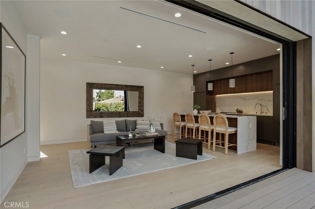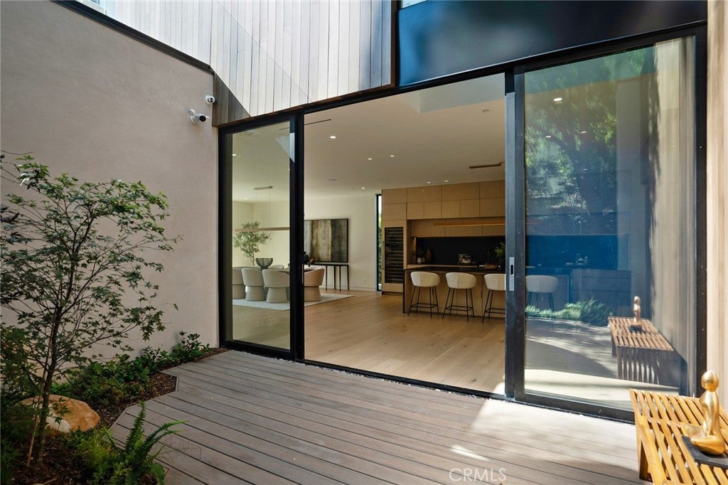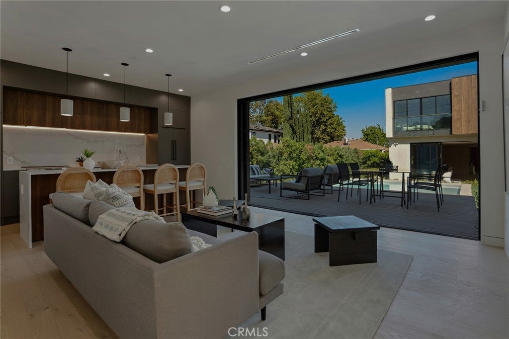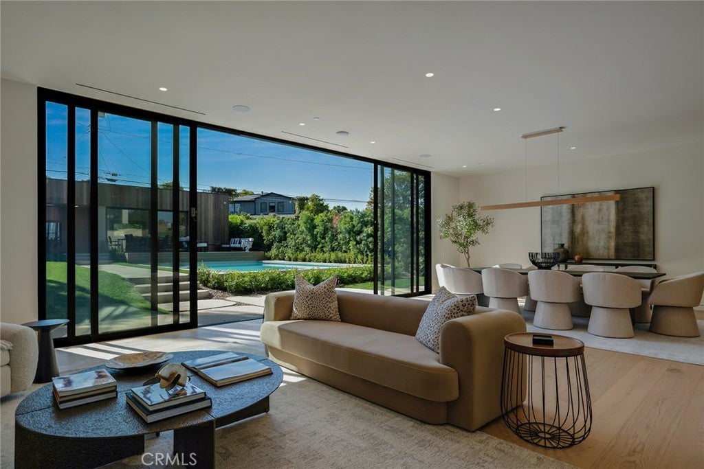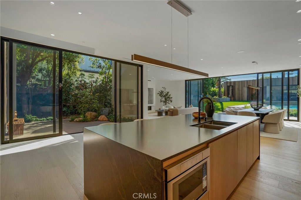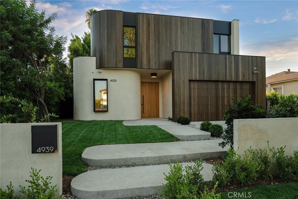 Enter an environment where the warmth of organic modern architecture meets stunning new luxury construction. Elegant 6BR + 5.5BA property sits on an almost 11,000 sqft lot + includes a 1BR + 1BA guest house w/its own address. Gorgeous open floor plan features sleek kitchen w/center island, quartz counters, white oak cabinets + stainless steel appliances including a Wolf 8 burner range w/double oven. Living room w/fireplace has huge sliders leading out to the extensive grassy grounds. Kitchen overlooks a private deck area w/Japanese landscaping. Both the kitchen + dining area have custom designed light fixtures. The gentle curves of the home's exterior can be found in details throughout the house, such as the fireplace, the curved corners of rooms + even the concrete steps throughout the exterior. The opulent primary suite has everything. Huge floor to ceiling windows slide open for viewing the amazing grounds. A separate area for lounging opens to a spacious side balcony. Two custom walk-in closets have extensive built-ins. Gorgeous primary bath w/soaking tub has an oversized shower w/dual rain heads + seating benches, plus double sinks + vanity area. Second level includes a sitting area/library w/dramatic skylight + 2 more ensuite BR's. An airy floating staircase connects the two levels, w/another 2BR + 2BA below. The grand living space is accentuated w/high ceilings, extensive use of glass + is infused w/a spectacular amount of natural light. Step outside + encounter the exceptional park-like oasis. An immense pool w/spacious baja shelf also includes a spa. Amazing outdoor entertaining area features stainless steel BBQ, a smoker, a refrigerator, a pizza oven, stainless steel sink + tons of cabinets. At the back of the private grounds sits the jewel of the property - a 1BR + 1BA ADU with 800 sqft that looks like a mini version of the main house, w/the same unique wood exterior + curves inside + out. The floor plan includes an extensive kitchen w/quartz center island + living room. It would make a great office or a multi-generational compound. The living space sliders completely open to the patio creating a perfect indoor outdoor flow. Its view looking out over the grounds + backside of the main house creates a dramatic backdrop for everyday living. This is a one of a kind property. Come satisfy your appetite for something new + break away from all the "modern farmhouse" + "modern box" replicants. And experience over 6,100 sqft of new architectural luxury.