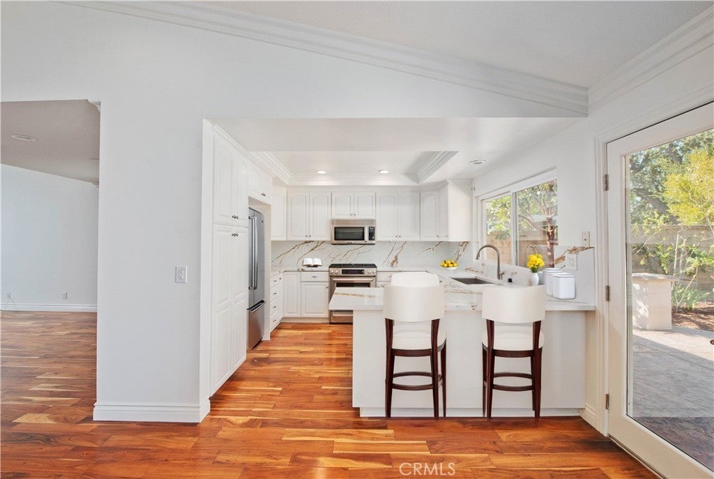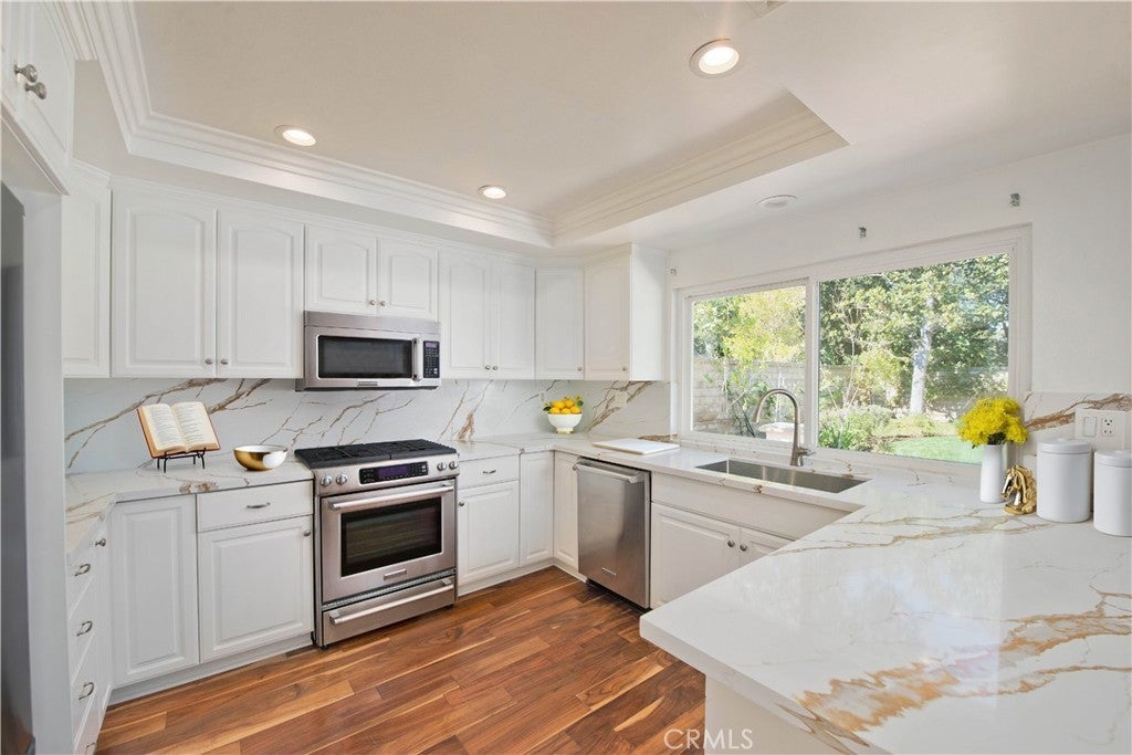 Beautifully refreshed 3-bedroom, 2-bath single-story home tucked into a quiet cul-de-sac in the heart of Westlake Village. Highlighted features include an open floor plan with wood like flooring, quartz countertops, LED lighting, and updated landscaping - adding tranquil charm and curb appeal. Entering through the double doors leads into a bright living room with vaulted ceilings, crown molding, plantation shutters, modern fireplace, open to a formal dining area. The spacious great room leads to the hardscaped patio with firepit and lush backyard—ideal for entertaining or unwinding outdoors. The remodeled kitchen offers sleek quartz counters, custom cabinetry, and newer stainless-steel appliances. Enjoy the convenience of an indoor laundry room with direct access to the two-car garage with built-in storage. Located in an award-winning school district, with Triunfo and Evenstar parks nearby. HOA amenities include a large community clubhouse, Olympic-size pool, and tennis courts. Close to restaurants, shopping, scenic Westlake Lake, miles of biking and hiking trails, all with convenient proximity to the 101. This turnkey one-story home blends comfort, style, and location—perfect for any stage of life.
