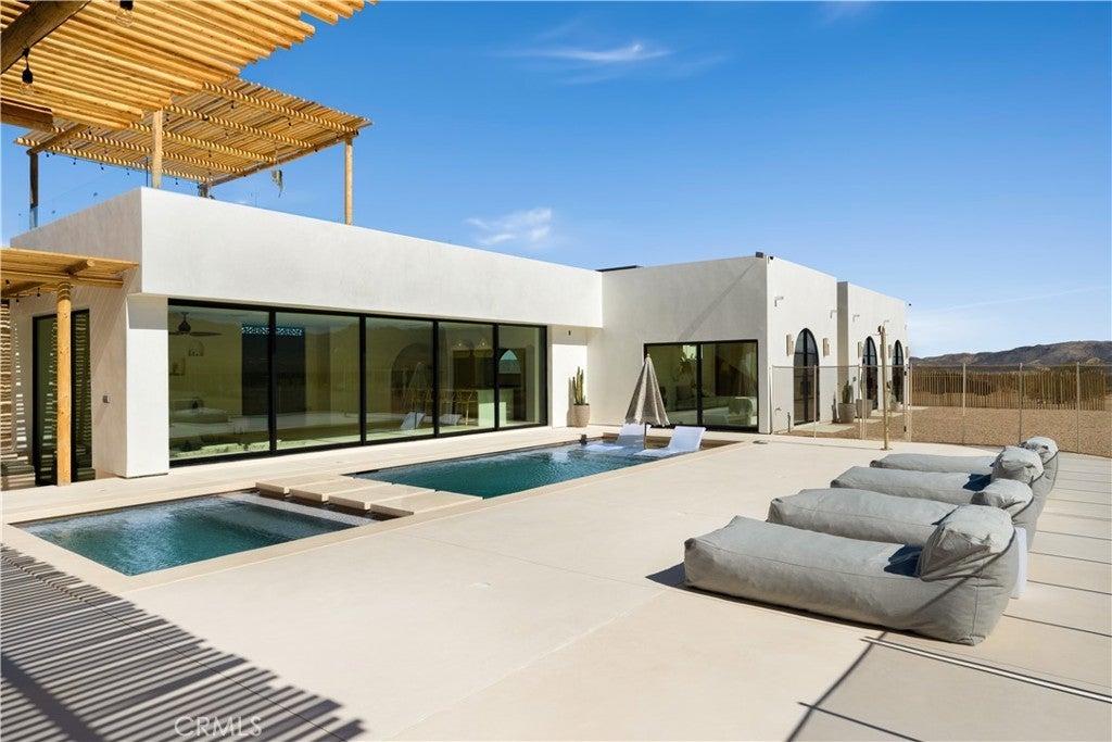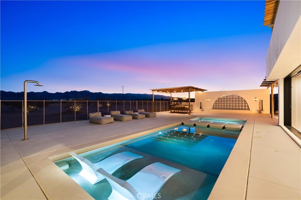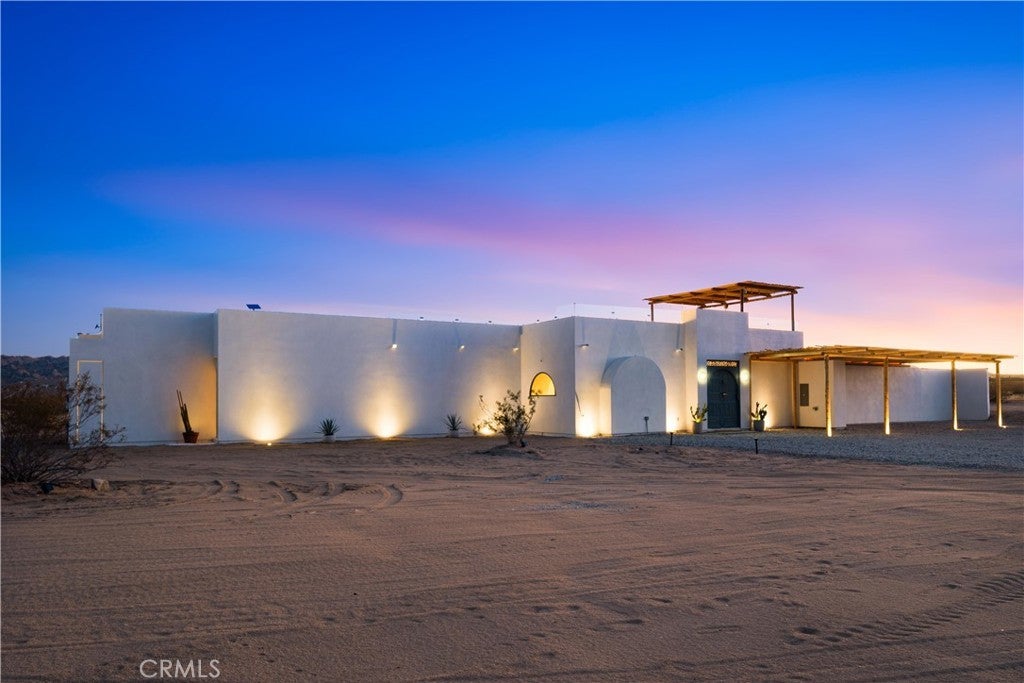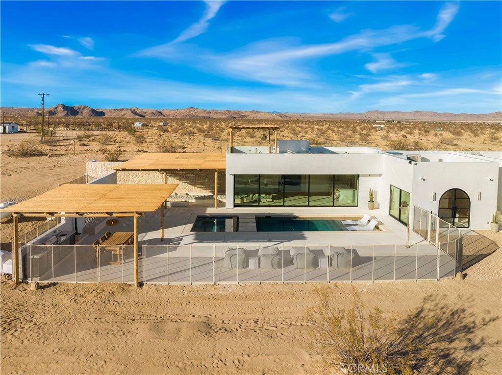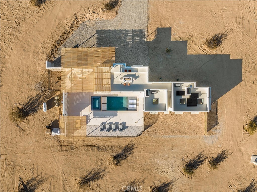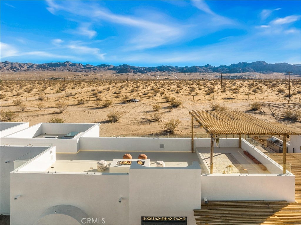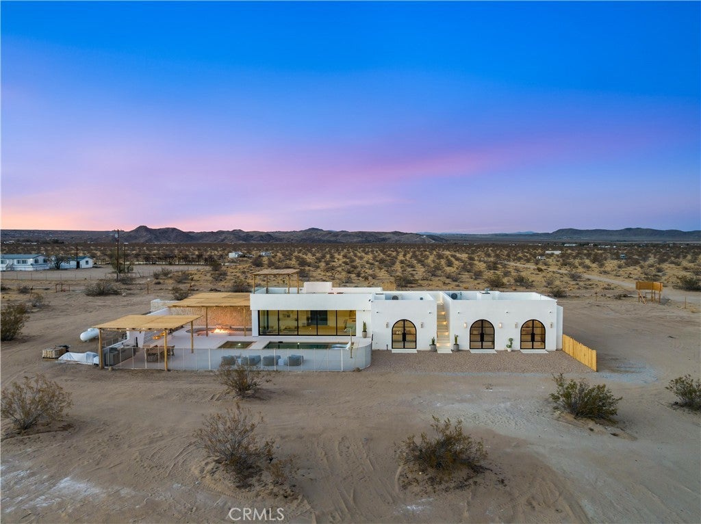 ATTENTION INVESTORS - High Income property ,Stunning Ibiza-Style Desert Oasis: A Once-in-a-Lifetime Opportunity Welcome to your dream home – a unique 1,540 sq. ft. Ibiza-style residence nestled in the breathtaking desert landscape. This fully custom property offers an unparalleled living experience, perfectly designed for both relaxation and entertainment. Upon entering this exquisite home, you will be greeted by an impressive 30-foot pocket door that seamlessly merges indoor and outdoor living, allowing you to fully appreciate the natural beauty of the surrounding 2.18 acres, complete with stunning views of the Joshua Tree Monument. The design promotes an effortless flow throughout the space, making it ideal for gatherings or tranquil evenings. Step outside to discover over 700 sq. ft. of rooftop space, featuring a stylish pergola that provides 360-degree views of the desert landscape—an ideal backdrop for sunset cocktails or stargazing. The expansive outdoor deck boasts a sunken seating area capable of accommodating over 20 guests, making it an entertainer's paradise. This home is meticulously crafted with imported custom furniture and finishes, showcasing the finest materials. Each corner of this residence radiates charm and sophistication. Culinary enthusiasts will appreciate the full BBQ kitchen, perfect for summer cookouts, while the sunken fire pit and additional rooftop fire pit create an inviting ambiance for evening gatherings under the stars. Adding to the allure of this property is a large pool complemented by an oversized jacuzzi, providing a luxurious retreat perfect for both the hot desert days and chilly nights. Secluded yet accessible, this property represents a fantastic investment opportunity or an idyllic vacation home. Equipped with a well system, solar power, and an EV charger, this residence combines sustainability with luxury living. Don’t miss your chance to own this extraordinary desert retreat—a true gem that encapsulates the essence of modern living in harmony with nature. Schedule your private tour today!