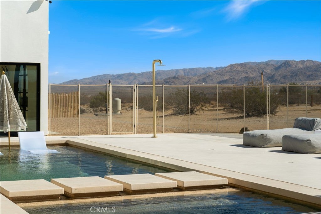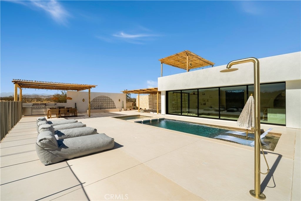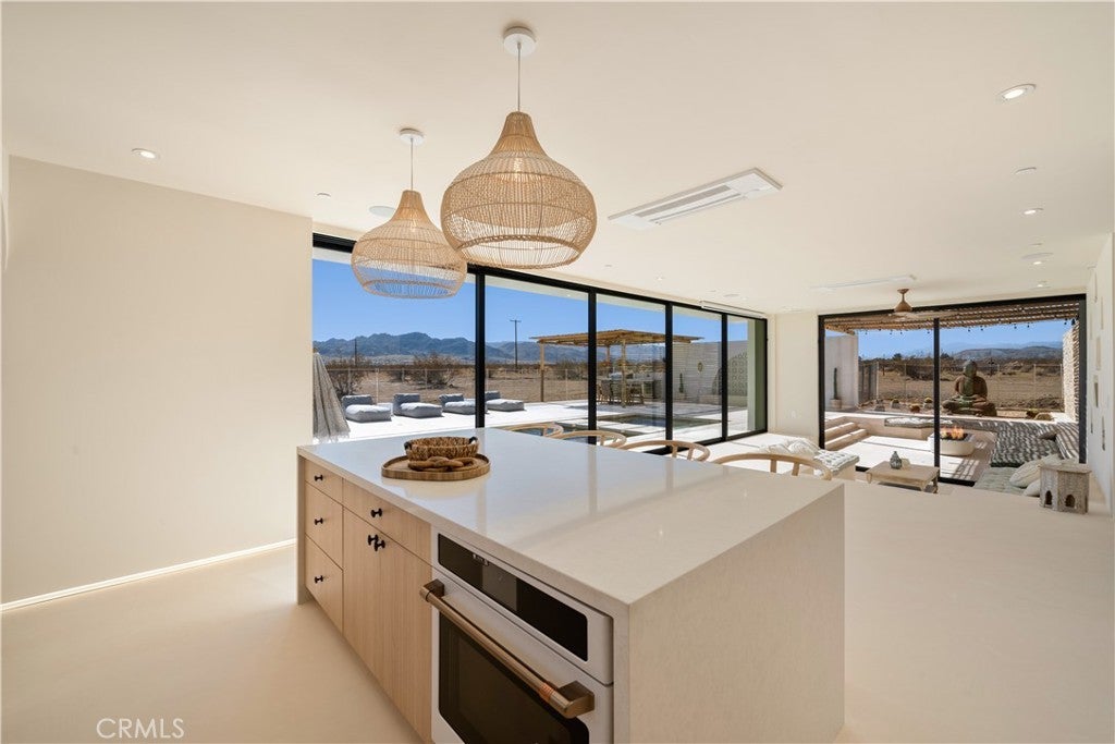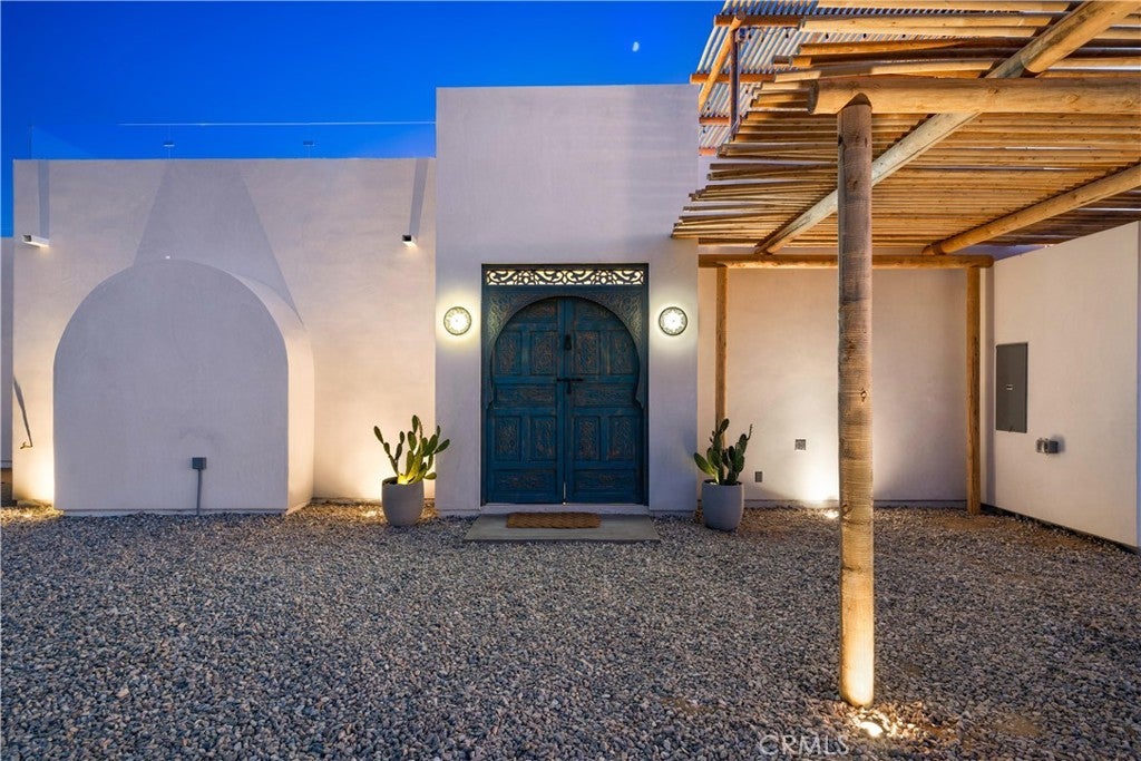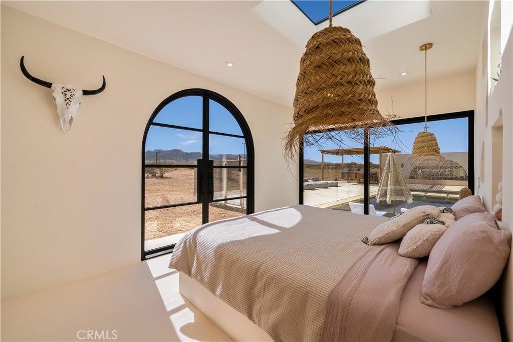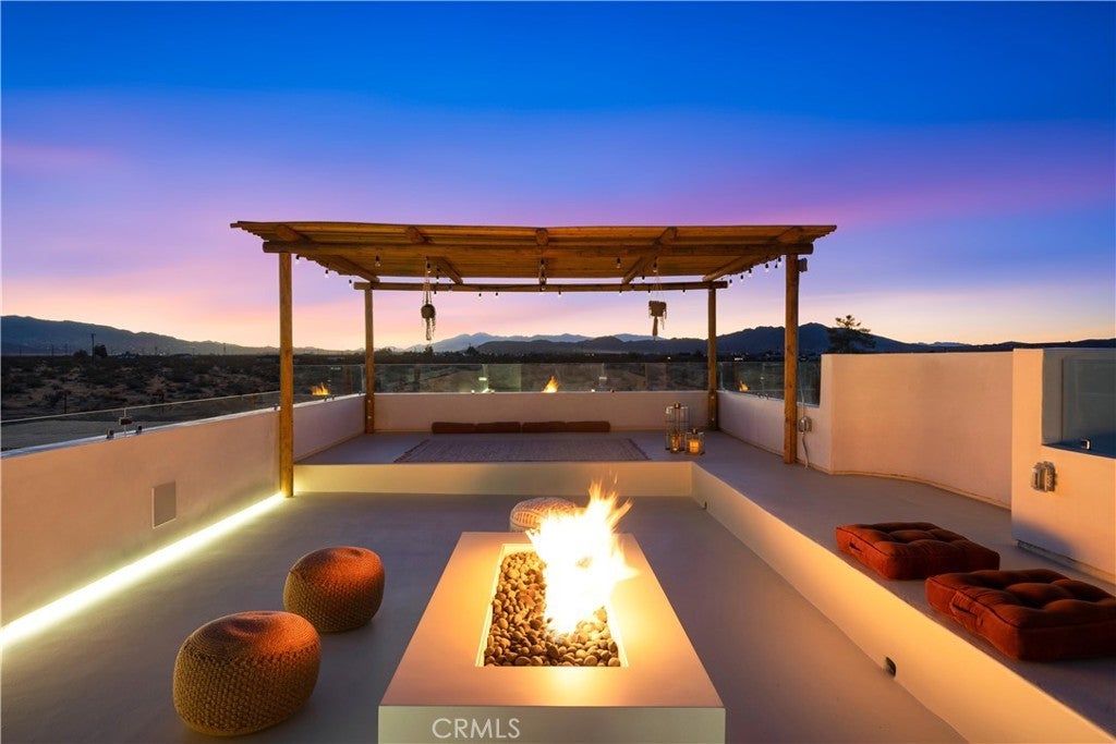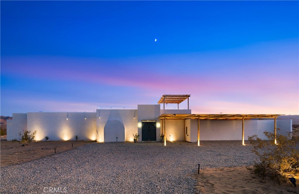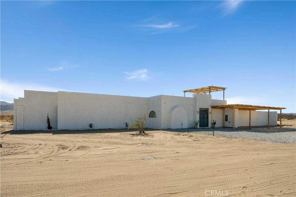 ATTENTION INVESTORS - High Income property ,Stunning Ibiza-Style Desert Oasis: A Once-in-a-Lifetime Opportunity Welcome to your dream home – a unique 1,540 sq. ft. Ibiza-style residence nestled in the breathtaking desert landscape. This fully custom property offers an unparalleled living experience, perfectly designed for both relaxation and entertainment. Upon entering this exquisite home, you will be greeted by an impressive 30-foot pocket door that seamlessly merges indoor and outdoor living, allowing you to fully appreciate the natural beauty of the surrounding 2.18 acres, complete with stunning views of the Joshua Tree Monument. The design promotes an effortless flow throughout the space, making it ideal for gatherings or tranquil evenings. Step outside to discover over 700 sq. ft. of rooftop space, featuring a stylish pergola that provides 360-degree views of the desert landscape—an ideal backdrop for sunset cocktails or stargazing. The expansive outdoor deck boasts a sunken seating area capable of accommodating over 20 guests, making it an entertainer's paradise. This home is meticulously crafted with imported custom furniture and finishes, showcasing the finest materials. Each corner of this residence radiates charm and sophistication. Culinary enthusiasts will appreciate the full BBQ kitchen, perfect for summer cookouts, while the sunken fire pit and additional rooftop fire pit create an inviting ambiance for evening gatherings under the stars. Adding to the allure of this property is a large pool complemented by an oversized jacuzzi, providing a luxurious retreat perfect for both the hot desert days and chilly nights. Secluded yet accessible, this property represents a fantastic investment opportunity or an idyllic vacation home. Equipped with a well system, solar power, and an EV charger, this residence combines sustainability with luxury living. Don’t miss your chance to own this extraordinary desert retreat—a true gem that encapsulates the essence of modern living in harmony with nature. Schedule your private tour today!