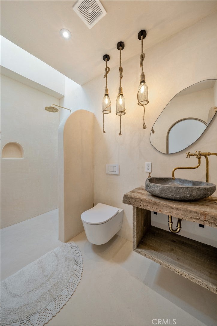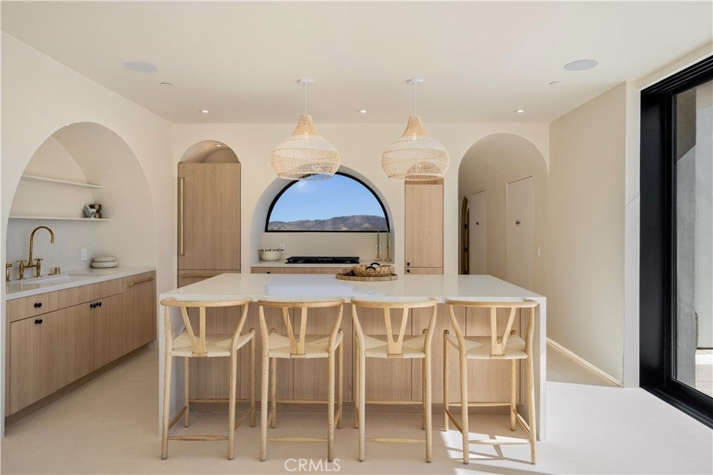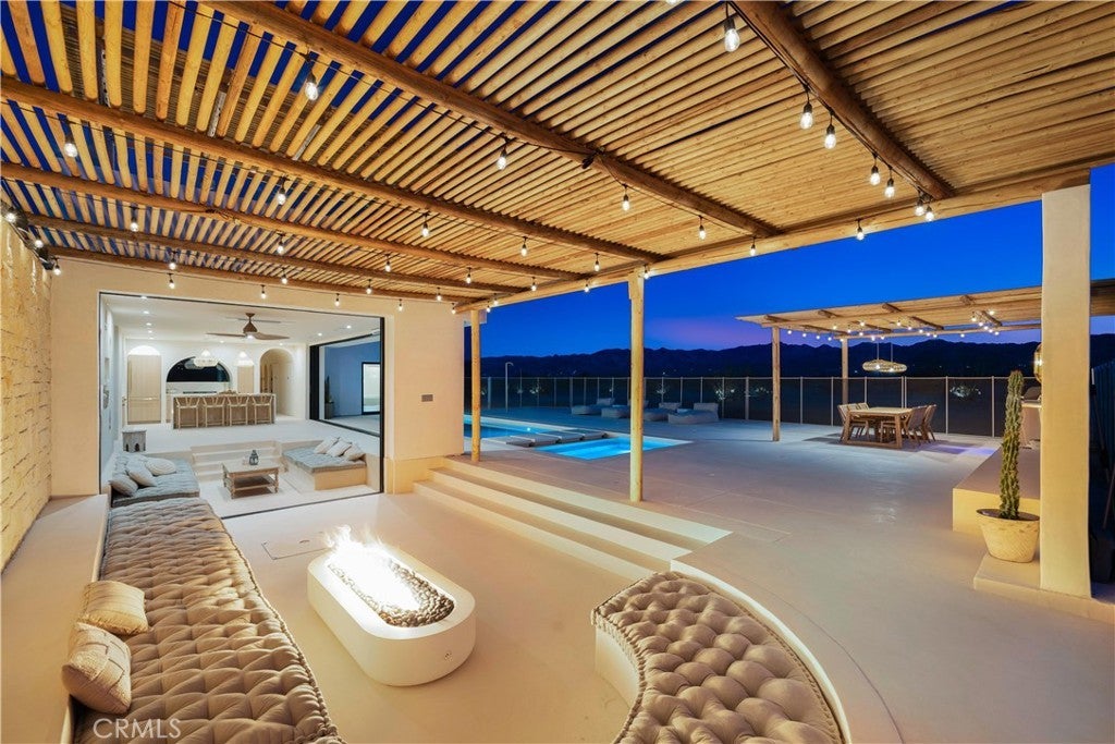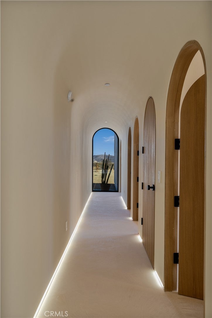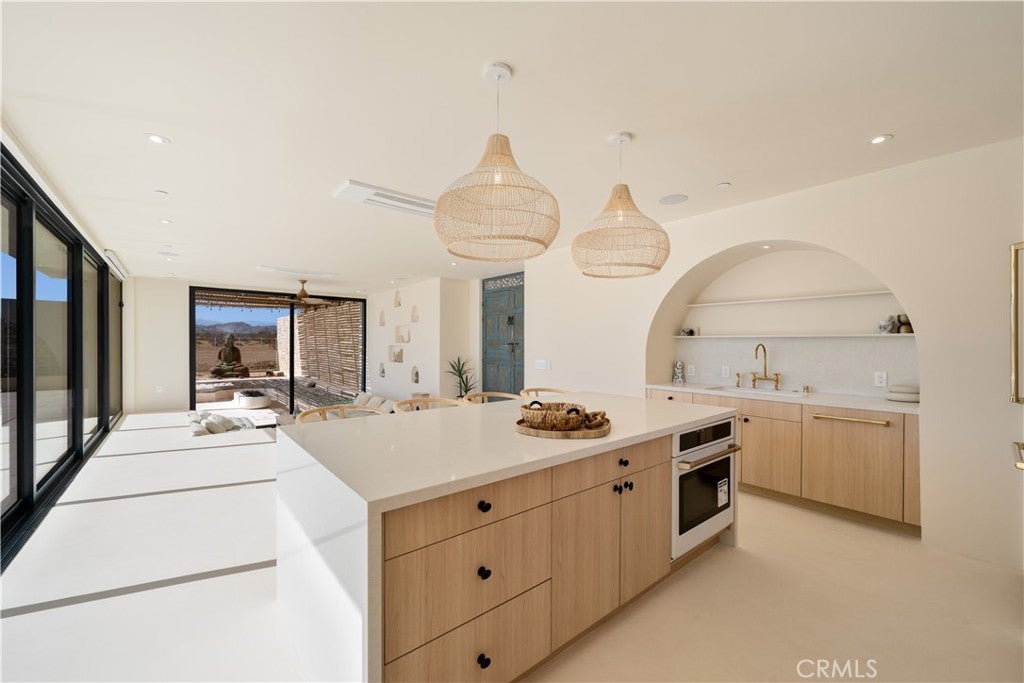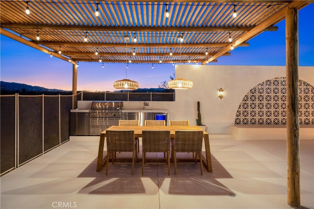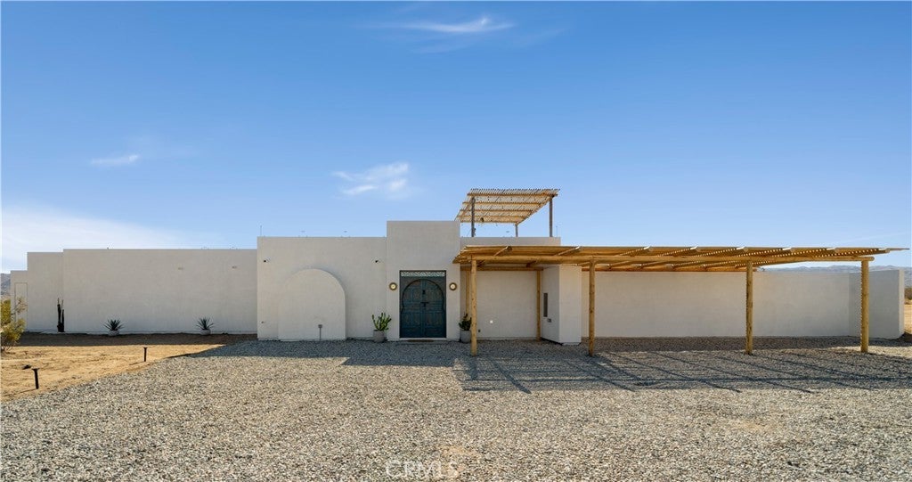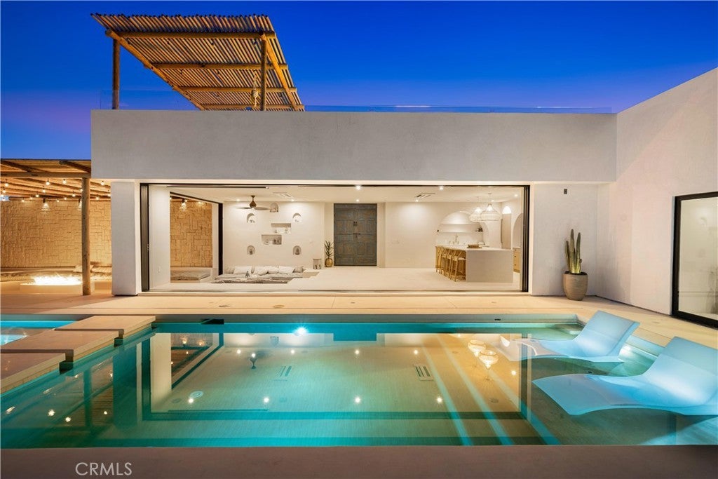 ATTENTION INVESTORS - High Income property ,Stunning Ibiza-Style Desert Oasis: A Once-in-a-Lifetime Opportunity Welcome to your dream home – a unique 1,540 sq. ft. Ibiza-style residence nestled in the breathtaking desert landscape. This fully custom property offers an unparalleled living experience, perfectly designed for both relaxation and entertainment. Upon entering this exquisite home, you will be greeted by an impressive 30-foot pocket door that seamlessly merges indoor and outdoor living, allowing you to fully appreciate the natural beauty of the surrounding 2.18 acres, complete with stunning views of the Joshua Tree Monument. The design promotes an effortless flow throughout the space, making it ideal for gatherings or tranquil evenings. Step outside to discover over 700 sq. ft. of rooftop space, featuring a stylish pergola that provides 360-degree views of the desert landscape—an ideal backdrop for sunset cocktails or stargazing. The expansive outdoor deck boasts a sunken seating area capable of accommodating over 20 guests, making it an entertainer's paradise. This home is meticulously crafted with imported custom furniture and finishes, showcasing the finest materials. Each corner of this residence radiates charm and sophistication. Culinary enthusiasts will appreciate the full BBQ kitchen, perfect for summer cookouts, while the sunken fire pit and additional rooftop fire pit create an inviting ambiance for evening gatherings under the stars. Adding to the allure of this property is a large pool complemented by an oversized jacuzzi, providing a luxurious retreat perfect for both the hot desert days and chilly nights. Secluded yet accessible, this property represents a fantastic investment opportunity or an idyllic vacation home. Equipped with a well system, solar power, and an EV charger, this residence combines sustainability with luxury living. Don’t miss your chance to own this extraordinary desert retreat—a true gem that encapsulates the essence of modern living in harmony with nature. Schedule your private tour today!