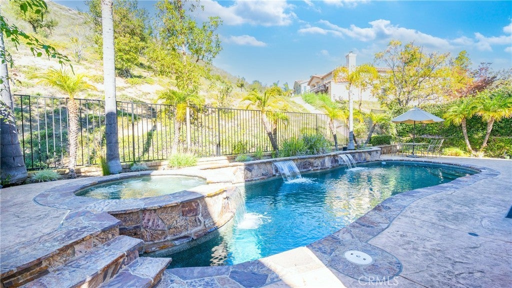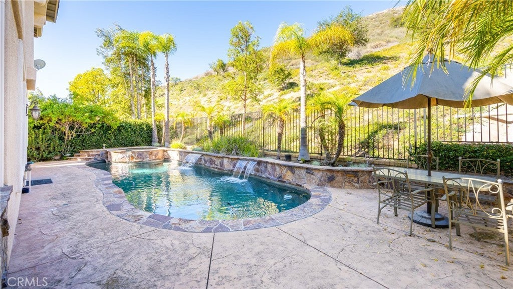 Welcome to 2827 Arbella Lane, an elegant sanctuary nestled in the gated community of Eagle Ridge, in the heart of Thousand Oaks. This is one of the few homes in Eagle Ridge with a private pool and spa making it a truly special and unique offering. Spanning 2,752 square feet, this sophisticated residence marries luxury with comfort. The home boasts four spacious bedrooms and three luxurious bathrooms, offering ample space for relaxation and entertainment. The main level reveals soaring high ceilings with tons of natural light. There is a main level versatile bedroom, perfect for guests or as a private home office. Venture further to discover a chic entertainers room, complete with a stylish bar, ideal for hosting intimate gatherings. The gourmet kitchen is equipped with top-of-the-line appliances, including a Bosch refrigerator and Viking cooktop, promising culinary adventures. The kitchen is open to the large family room with fireplace. Upstairs the romantic Primary Suite with views of the hills, includes a designer chandelier, his and hers closets, dual vanity, large shower, and soaking tub. Upstairs you will also find a loft area with built in shelves and seating area, perfect for a library, study, or kids play space. Step outside to enjoy California's splendid weather in your private oasis featuring a sparkling pool and rejuvenating spa. There is even a built in bbq. The thoughtfully designed 5,316-square-foot lot offers tranquility and privacy, complementing the home's sophisticated aesthetic. With modern conveniences like an upstairs laundry including washer and dryer, this home masterfully blends function with elegance. Experience refined living in a property that epitomizes style and sophistication in one of California’s most desirable locales.