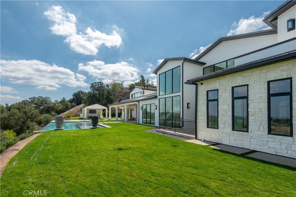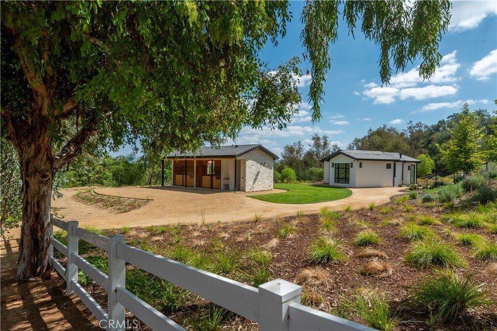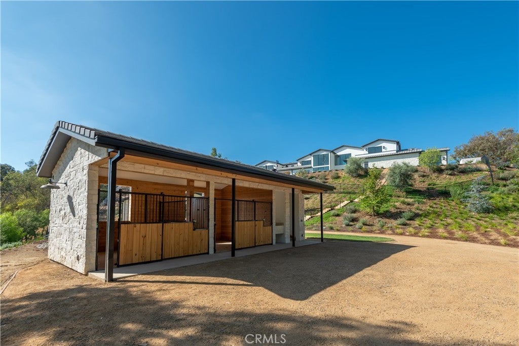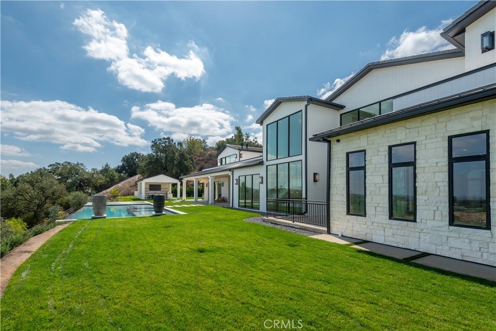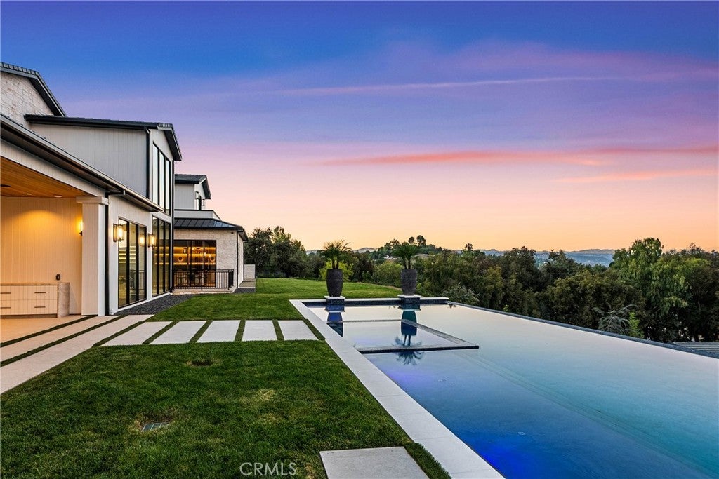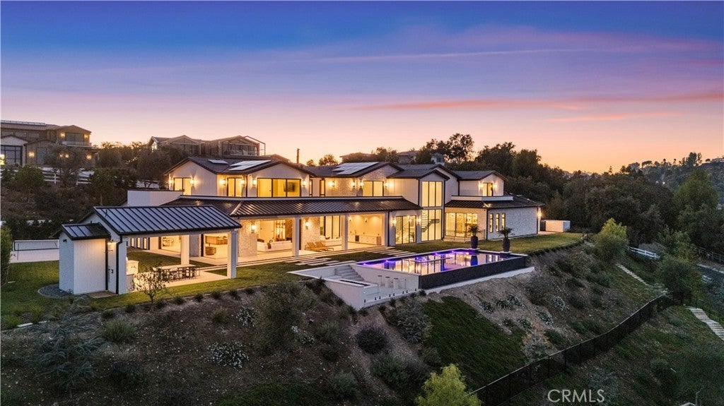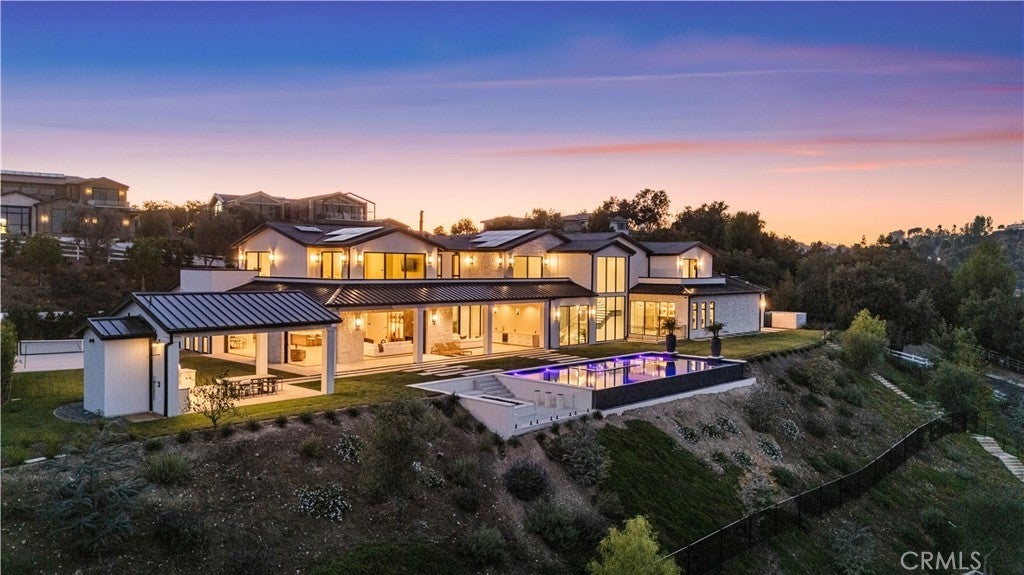 Panoramic views and curated design define this gorgeous, newly constructed estate, nestled at the end of a quiet cul de sac and sited on a large private lot within the guard-gated community of Hidden Hills. Perfectly positioned to capture the sweeping pastoral and city light views, this custom-built residence delivers a seamless blend of elevated architecture and indoor-outdoor living. The sunny, open floor plan centers around a stunning chef's kitchen with oversized island, prep kitchen, and counter seating that flows into the dramatic great room, anchored by a two-sided fireplace & sliding walls of glass that frame the endless views. Designed for grand scale entertaining and everyday comfort, the home features a spacious game and recreation room, custom home office, dedicated wellness wing with gym, steam room & sauna, a plush home theater with fabric covered walls, a sleek lounge with wet bar, and a glass encased, refrigerated wine cellar. Both levels include an additional den or flex spaces, and all six ensuite bedrooms are thoughtfully designed, connected by a floating architectural staircase and serviced by an elevator. The luxurious primary suite is a true retreat, complete with fireplace, stone-wrapped spa bath with steam shower, boutique sized custom closet, and a large, wraparound balcony with commanding views. The estate comprises four distinct structures. In addition to the main residence, which includes garages for seven cars with custom epoxy floors, the grounds feature a pool pavilion complete with a built-in barbecue and pool bath, a detached 965 square foot guest house tucked away on the lower pad for added privacy, and a two-stall barn/stable for equestrian or flexible use. Outdoor amenities are curated for year-round enjoyment and include a sparkling, zero edge infinity pool & spa, multiple covered patios, a fire pit lounge, exterior fireplace and a private pickleball court! Perfectly located within Hidden Hills, just a few blocks from the entry gate and close to top-rated public and private schools as well as The Commons at Calabasas, this one-of-a-kind estate offers space, sophistication, and 24 hour, guard gated security in one of Southern California's most sought-after communities.