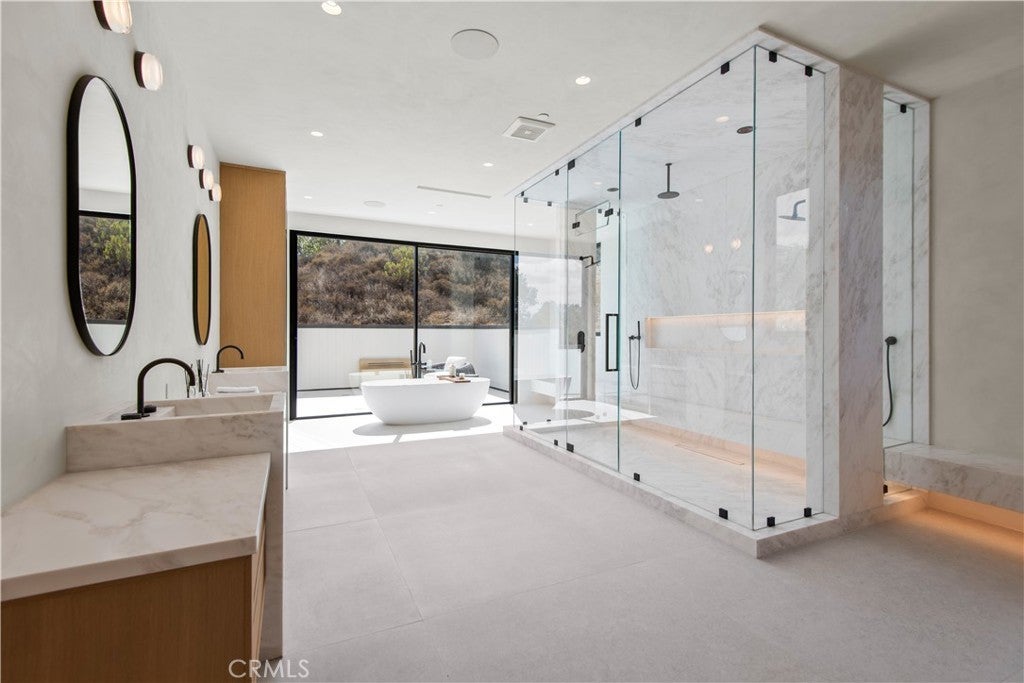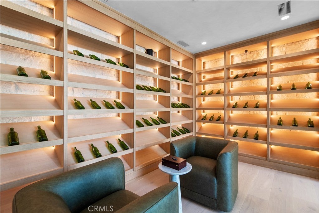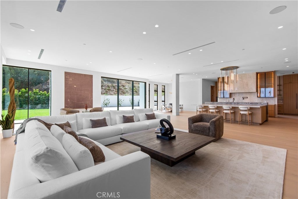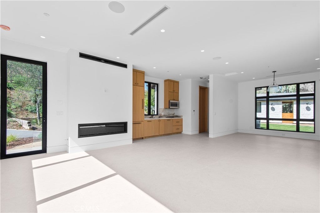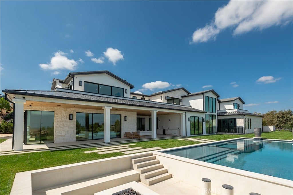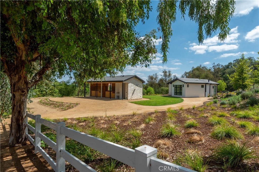 Panoramic views and curated design define this gorgeous, newly constructed estate, nestled at the end of a quiet cul de sac and sited on a large private lot within the guard-gated community of Hidden Hills. Perfectly positioned to capture the sweeping pastoral and city light views, this custom-built residence delivers a seamless blend of elevated architecture and indoor-outdoor living. The sunny, open floor plan centers around a stunning chef's kitchen with oversized island, prep kitchen, and counter seating that flows into the dramatic great room, anchored by a two-sided fireplace & sliding walls of glass that frame the endless views. Designed for grand scale entertaining and everyday comfort, the home features a spacious game and recreation room, custom home office, dedicated wellness wing with gym, steam room & sauna, a plush home theater with fabric covered walls, a sleek lounge with wet bar, and a glass encased, refrigerated wine cellar. Both levels include an additional den or flex spaces, and all six ensuite bedrooms are thoughtfully designed, connected by a floating architectural staircase and serviced by an elevator. The luxurious primary suite is a true retreat, complete with fireplace, stone-wrapped spa bath with steam shower, boutique sized custom closet, and a large, wraparound balcony with commanding views. The estate comprises four distinct structures. In addition to the main residence, which includes garages for seven cars with custom epoxy floors, the grounds feature a pool pavilion complete with a built-in barbecue and pool bath, a detached 965 square foot guest house tucked away on the lower pad for added privacy, and a two-stall barn/stable for equestrian or flexible use. Outdoor amenities are curated for year-round enjoyment and include a sparkling, zero edge infinity pool & spa, multiple covered patios, a fire pit lounge, exterior fireplace and a private pickleball court! Perfectly located within Hidden Hills, just a few blocks from the entry gate and close to top-rated public and private schools as well as The Commons at Calabasas, this one-of-a-kind estate offers space, sophistication, and 24 hour, guard gated security in one of Southern California's most sought-after communities.